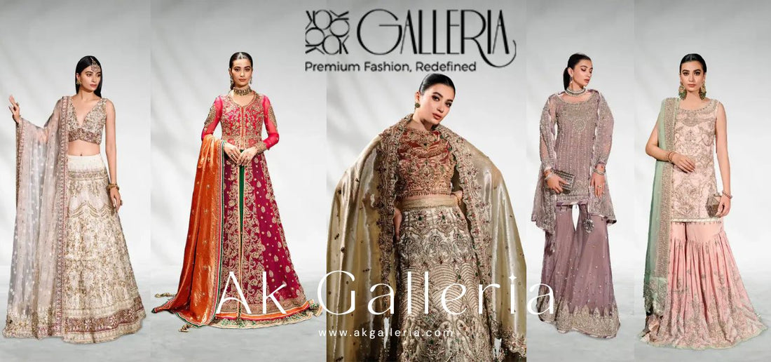 You can shop the latest bridal lehenga designs and wedding dresses from top brands like Nimra Kashif, Manahils, and Miras exclusively at AK Galleria.