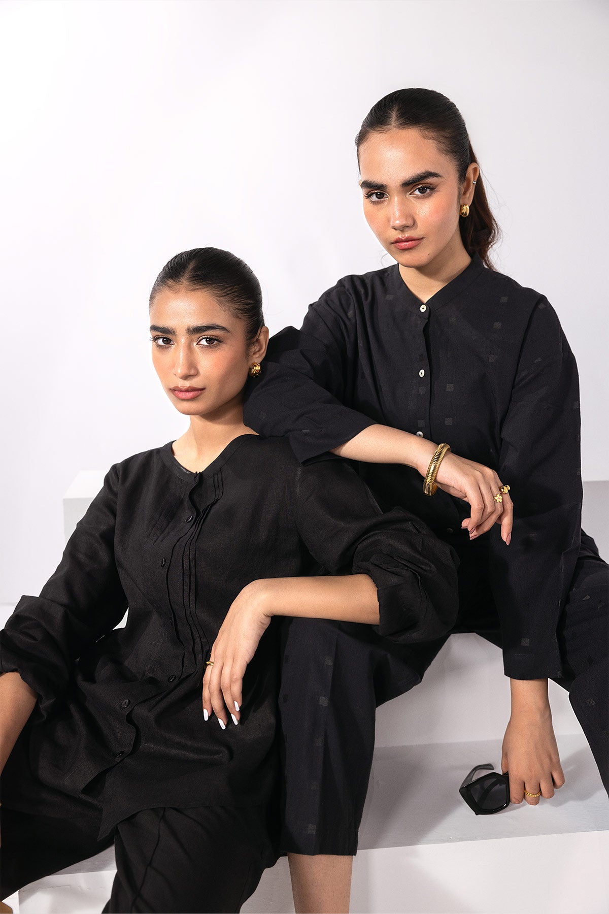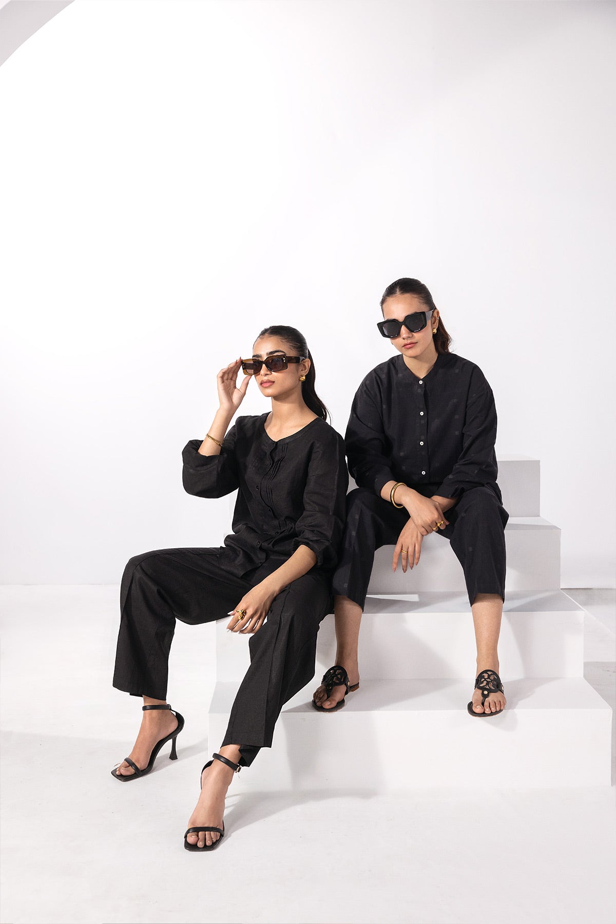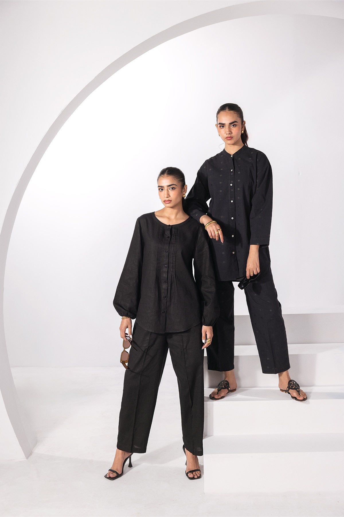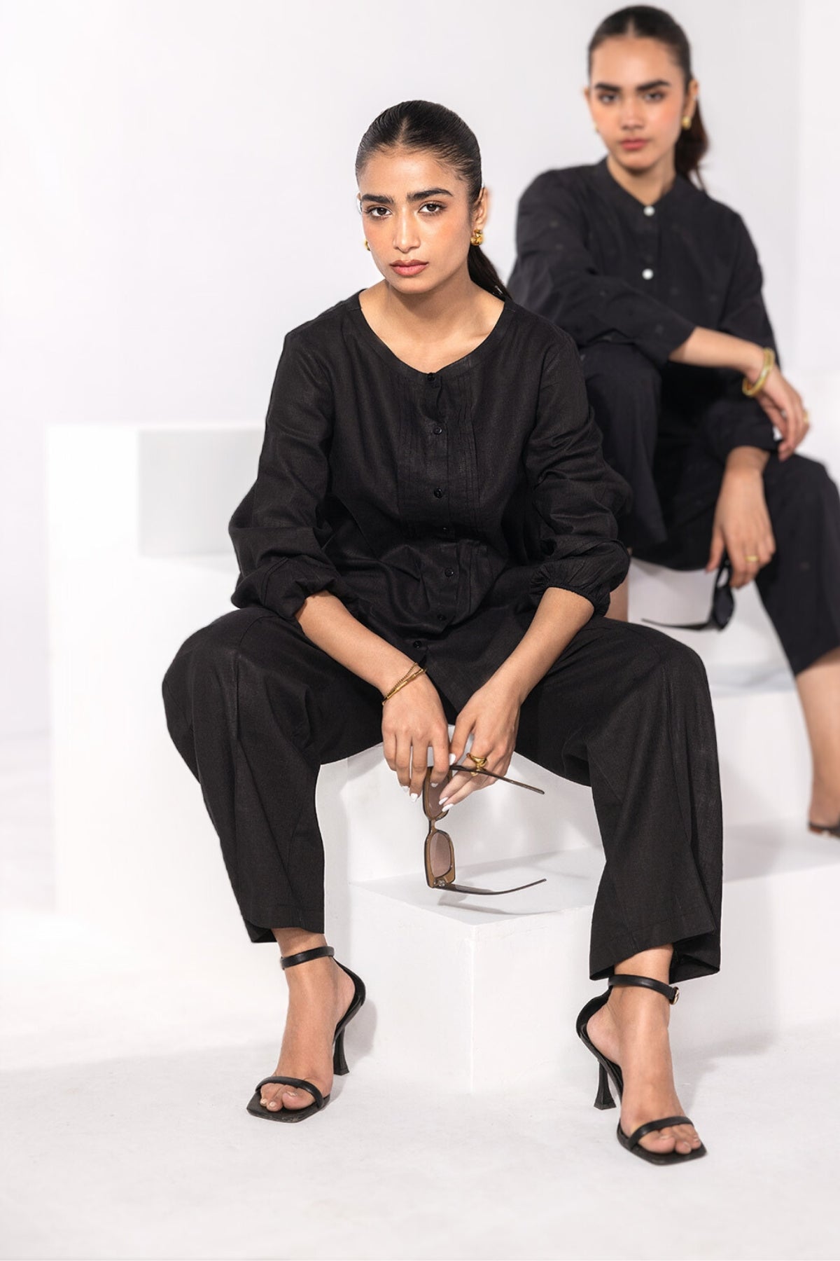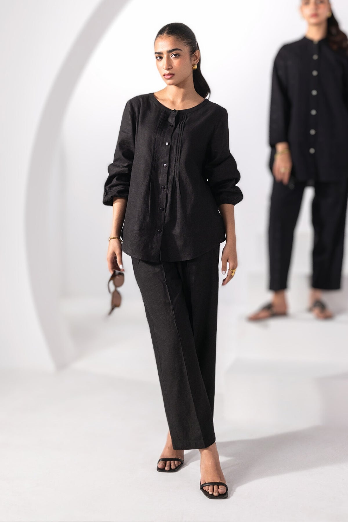 50% Cotton, 50% Linen. Classy Crew Neck Button Down Shirt With Full Length Sleeves With Elasticated Hem. Featuring Pleats On Shirt Front. Straight Fit Trousers With Elasticated Waistband.