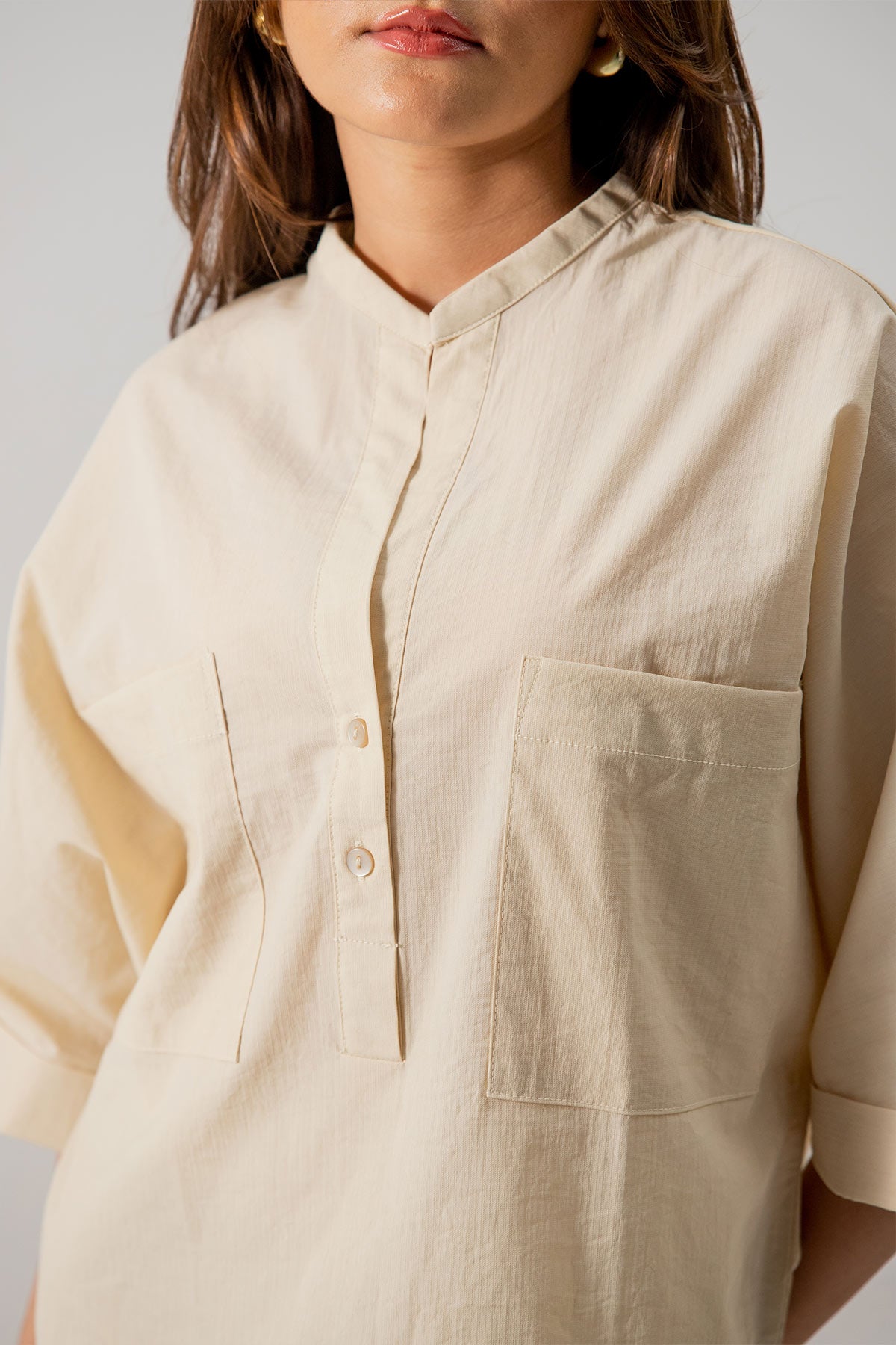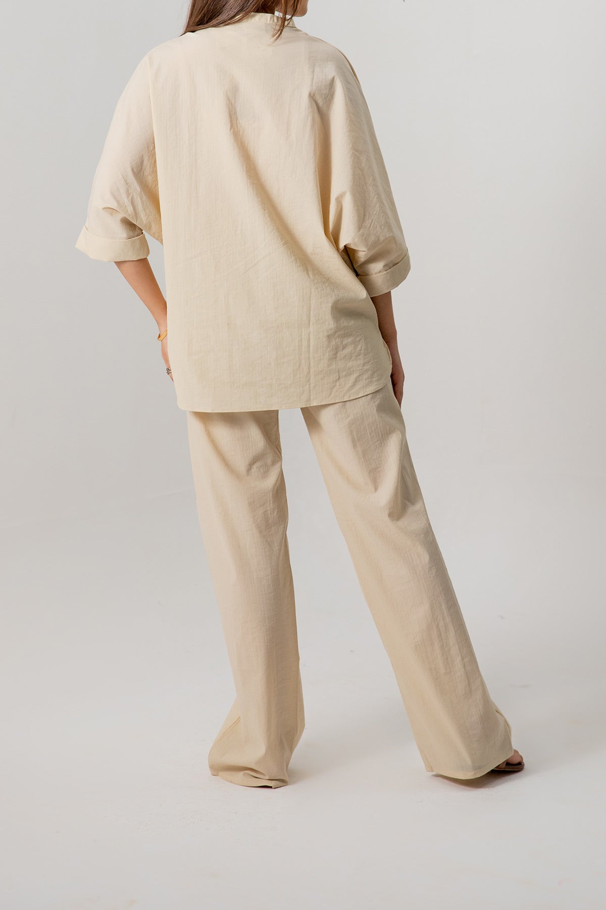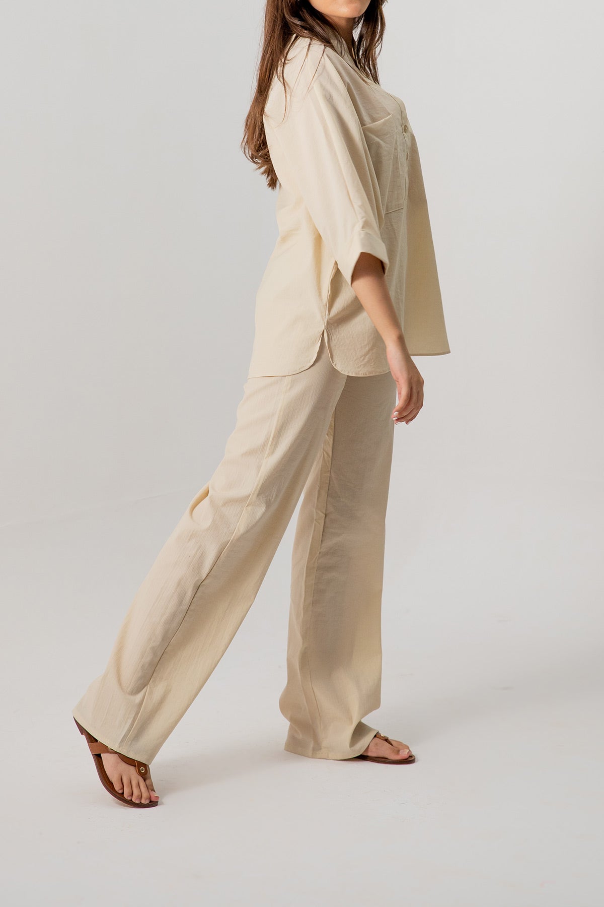 100% BLENDED. Solid Button Down Shirt With Henley Neckline, Three Quarter Sleeves and front patch pocket. Featuring Straight Trousers With Elasticated Waistband.