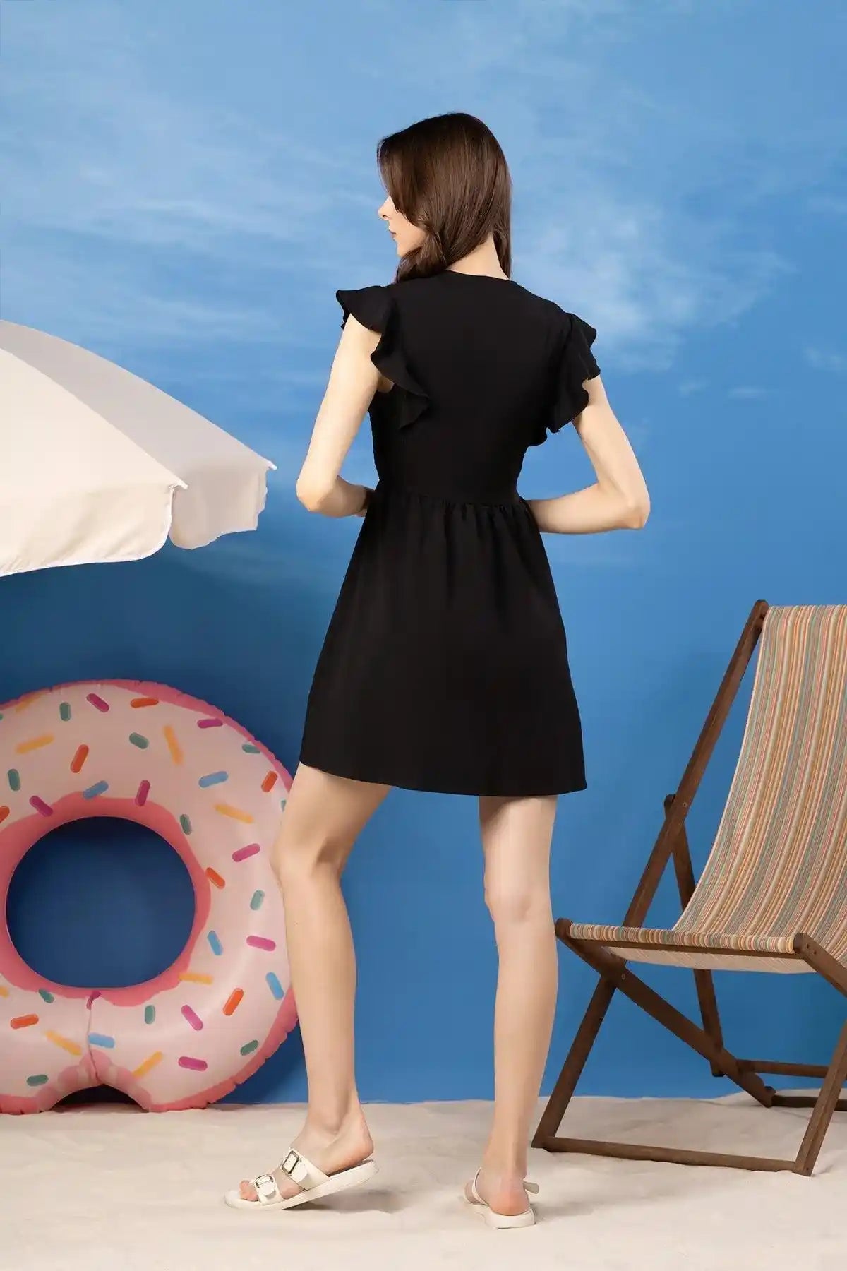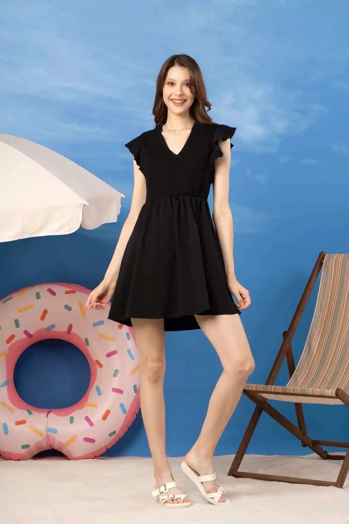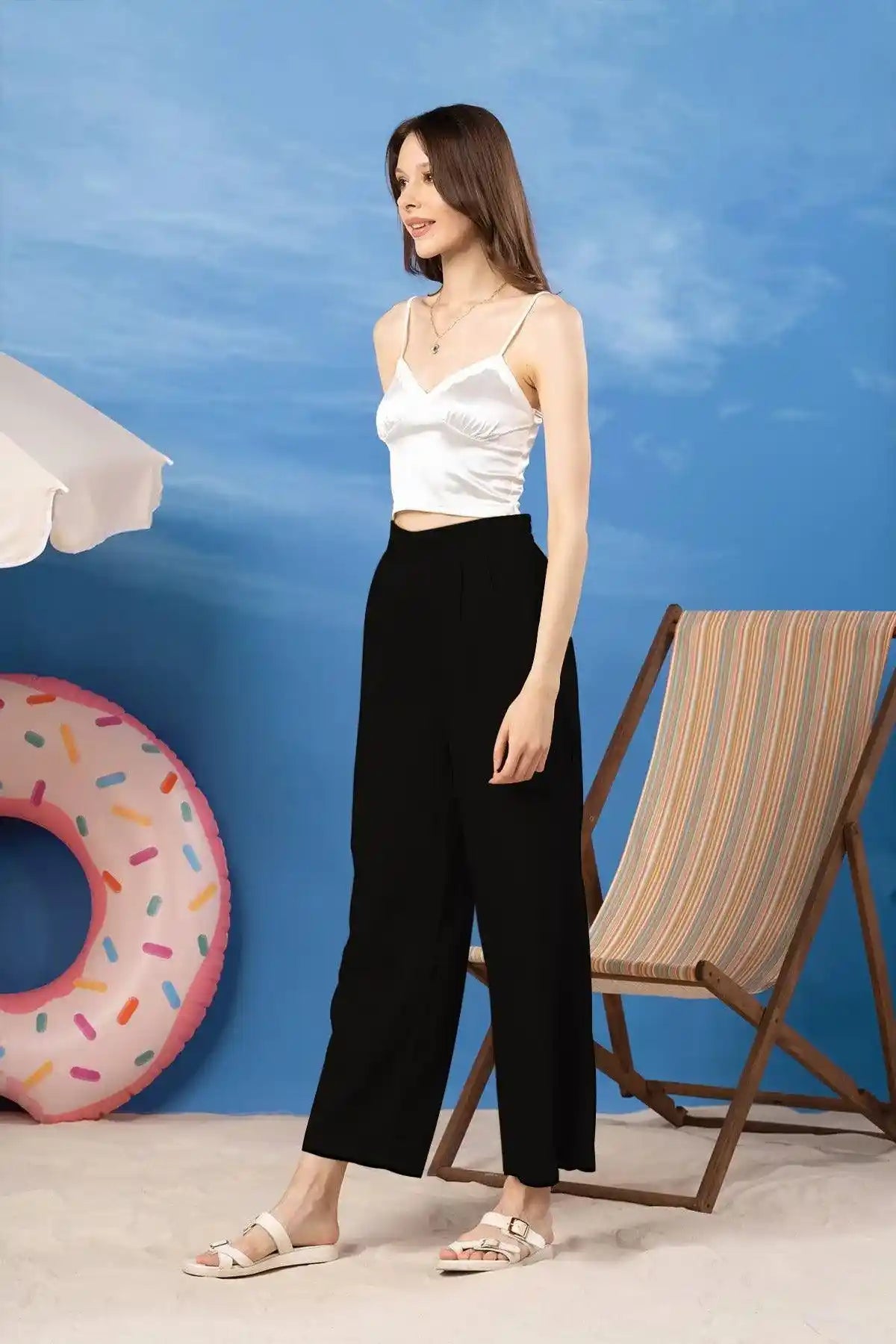 95% Polyester & 5% Elastane. Top: Vibrant And Trendy A-Line Midi Dress With V Neck, Bodice Shirring, Ruffled Cap Sleeves, Flounce Hem. Bottom: Trendy And Classy Solid Wide Leg Pants With Regular Elasticated Waistband Featuring Waist Darts, Rear Welt Pockets, Wide Hem.