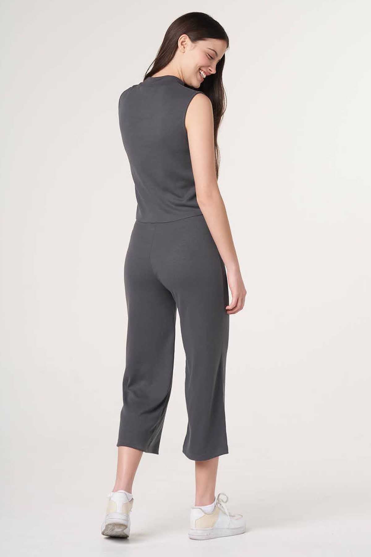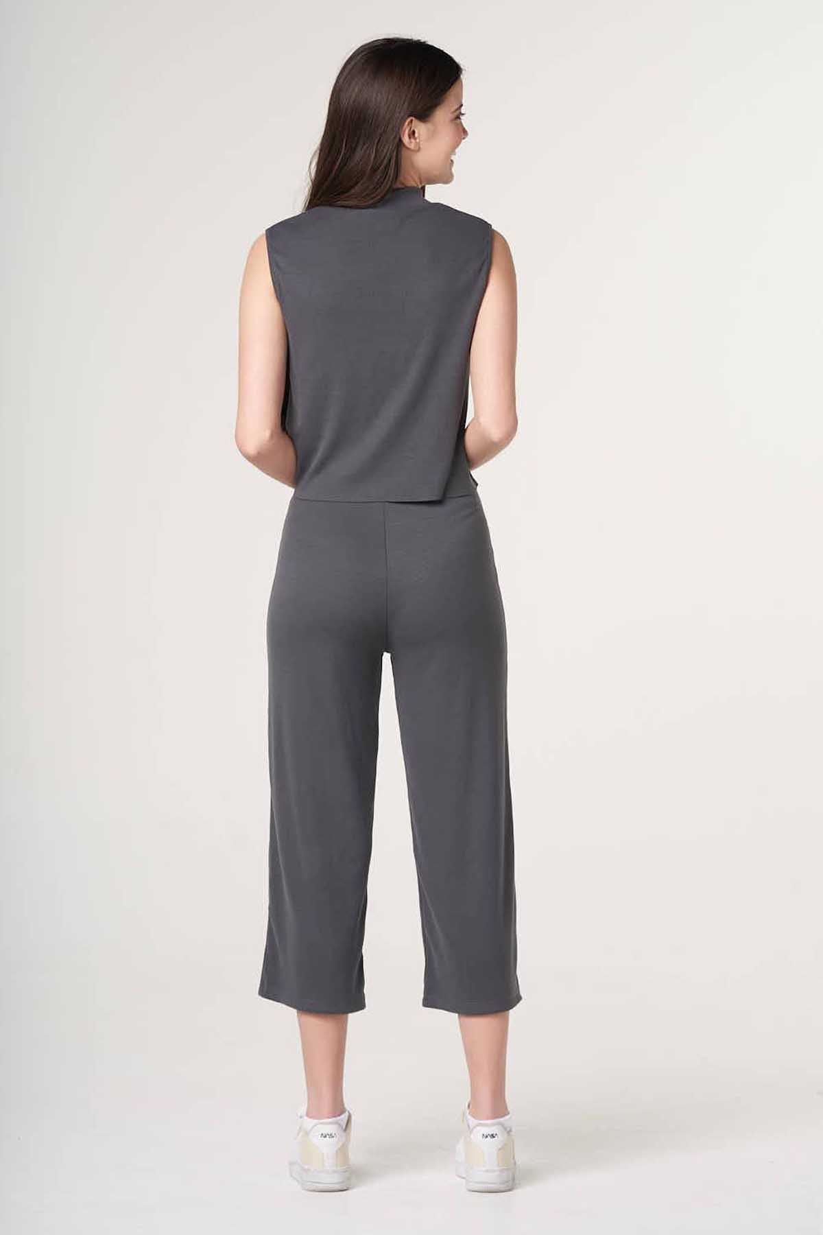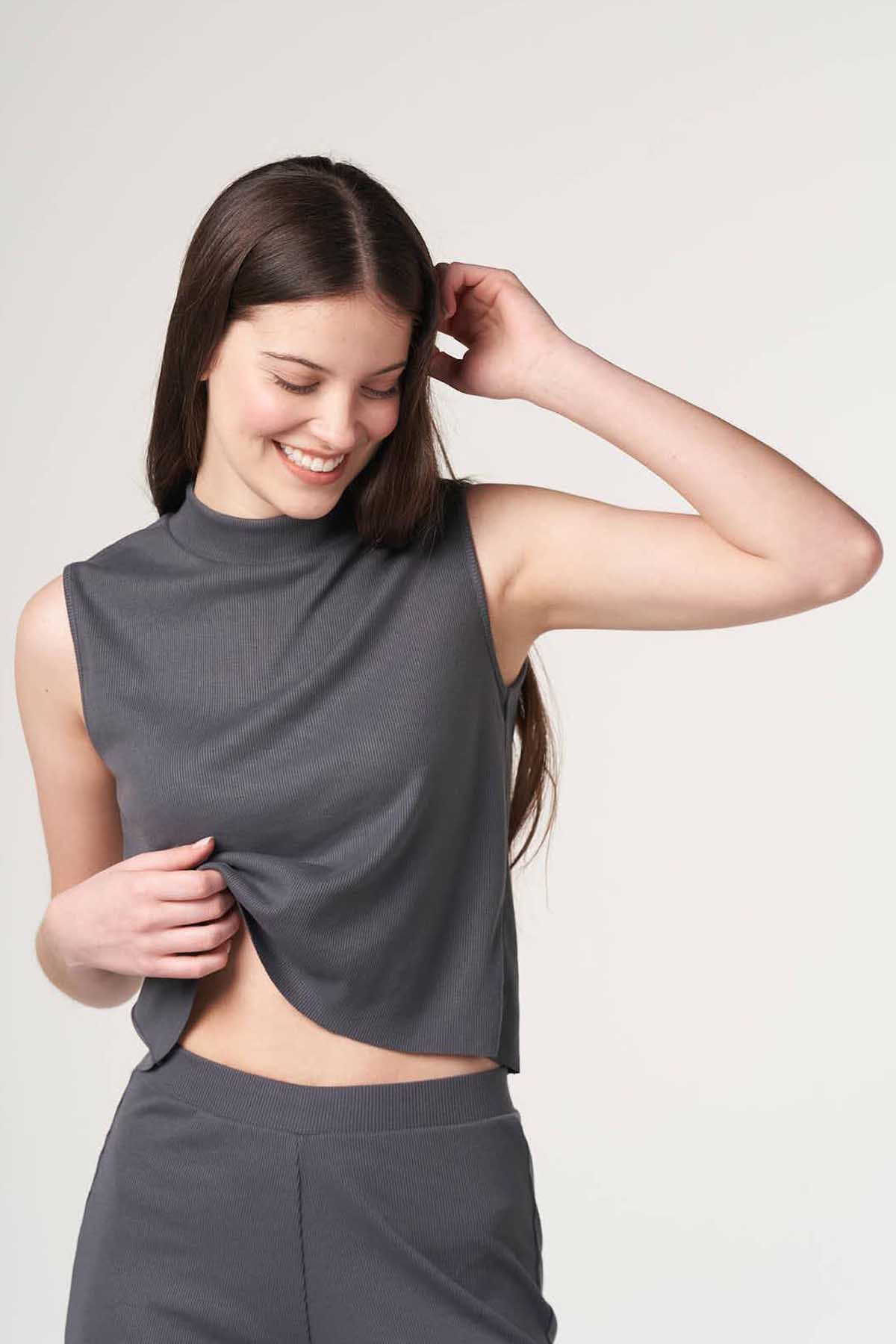 70 Polyester 25 Vsicose 5 Elastane. Ribbed Sleeveless Top With High Neck. Ribbed Wide Leg Pants