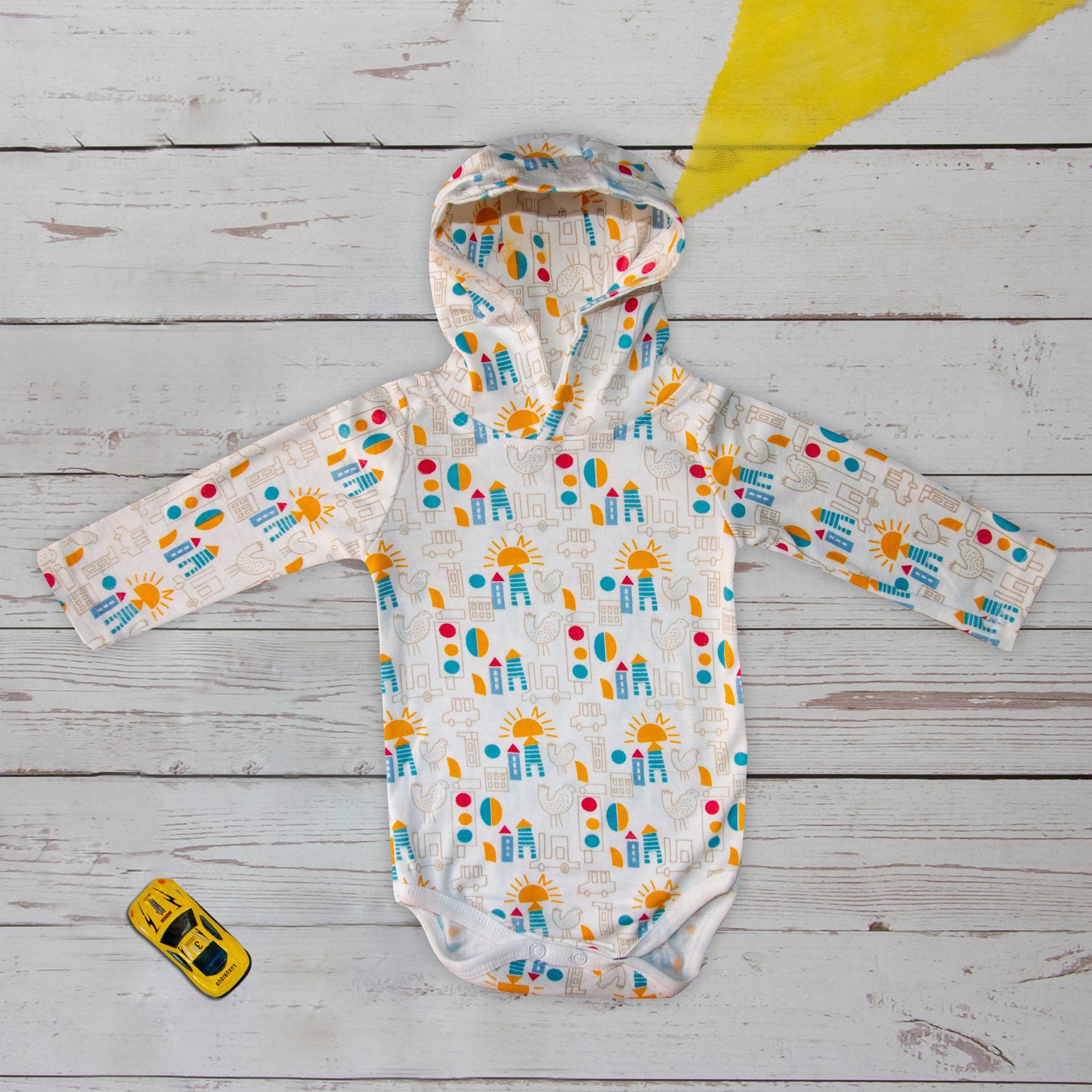 Introducing the new Long Sleeve Bodysuit With Hood (Building & Sun). Crafted with the softest interlock fabric, the Bodysuit hugs your baby with immense comfort. The eye-catching print features a bright, sunny city life, which is perfect for daily crawling adventures and cheerful playtimes. The hoodie and snap tab buttoned lower make everything a breeze.