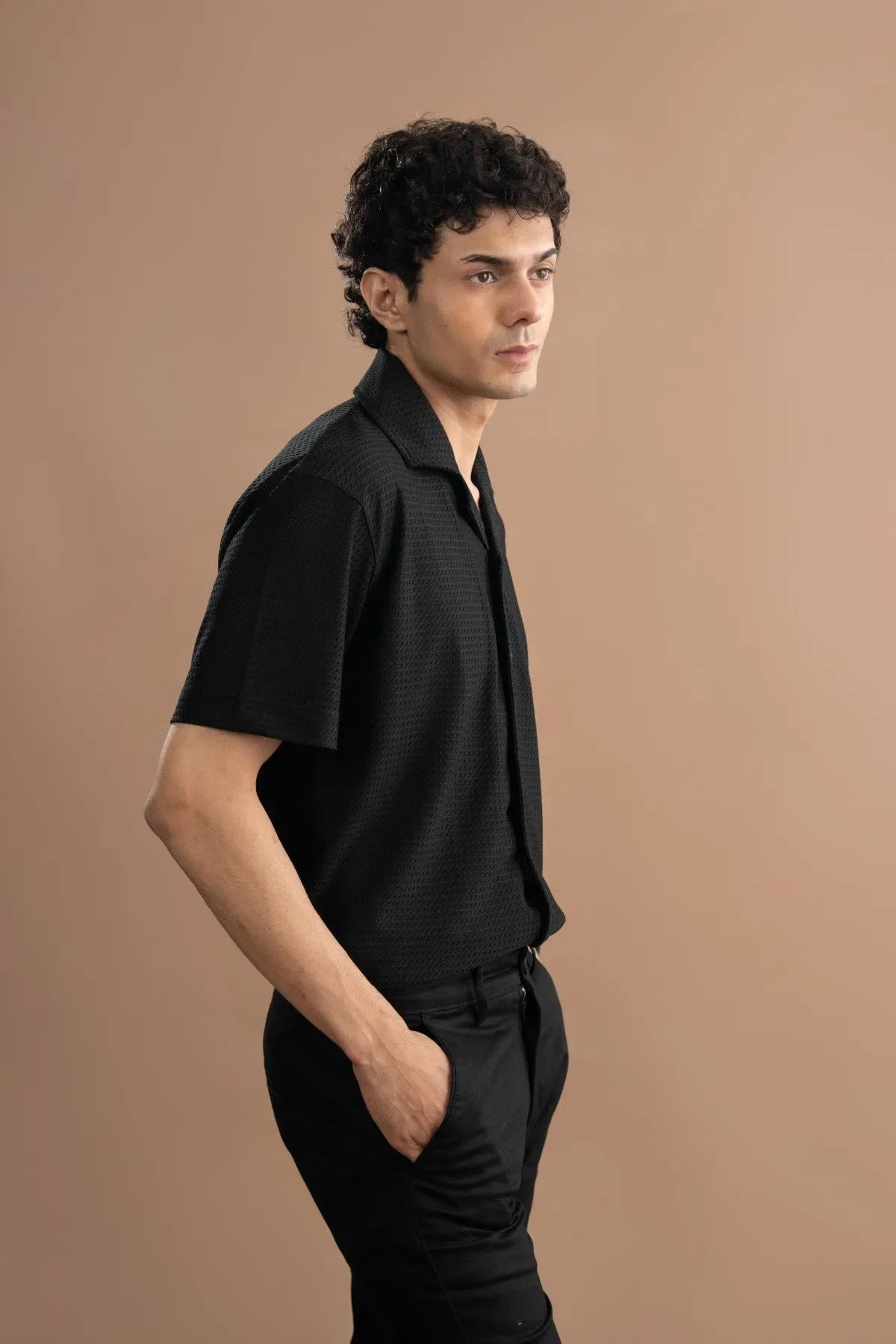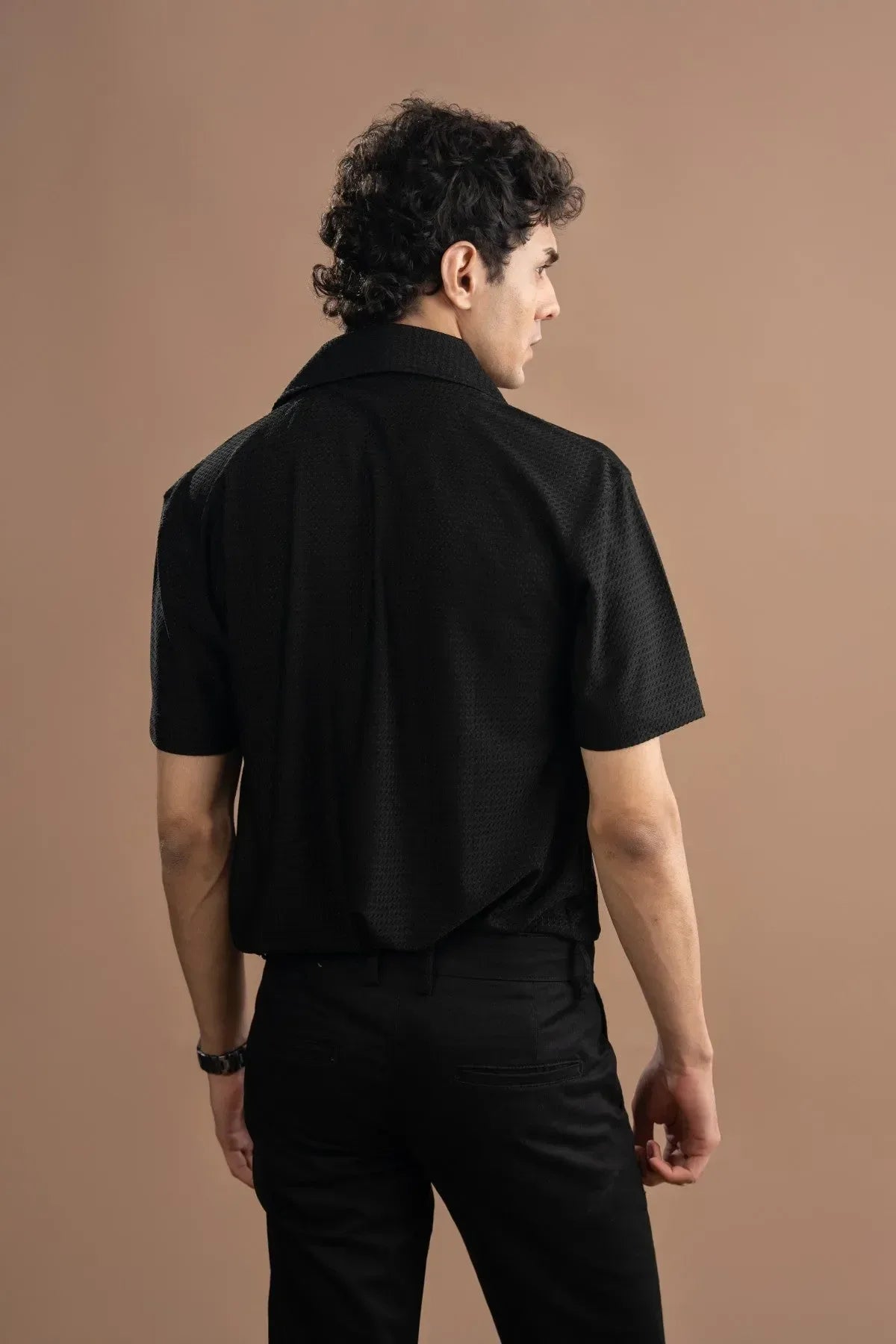 This Black Resort Shirt is all about sharp details and comfortable movement. It features the essential resort collar design for that easy, open neckline, and it’s made from a unique textured fabric that adds depth to the deep black color. Best of all, we built elasticity right into the material, giving you flexibility that a standard shirt can't match. Finished with clean, intentional top stitching across the garment and a comfortable, relaxed fit, this shirt keeps you looking tailored and moving freely.