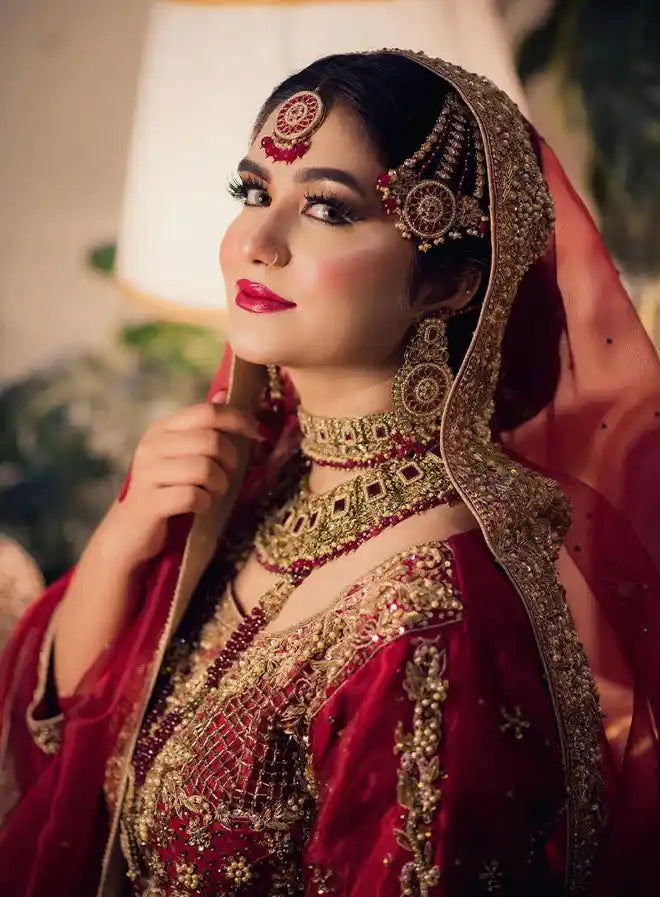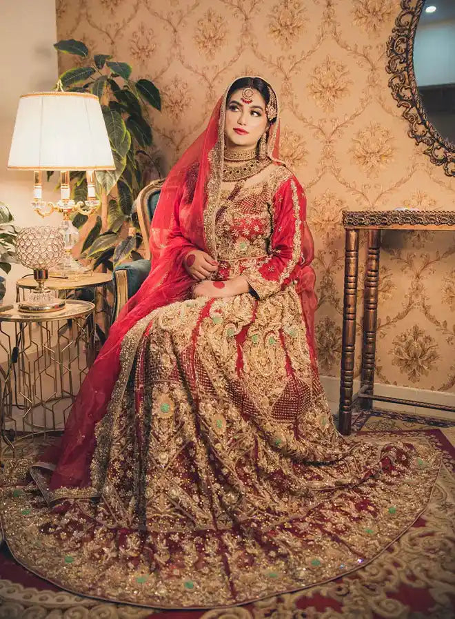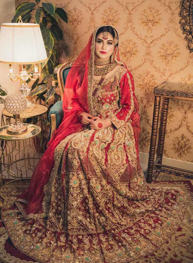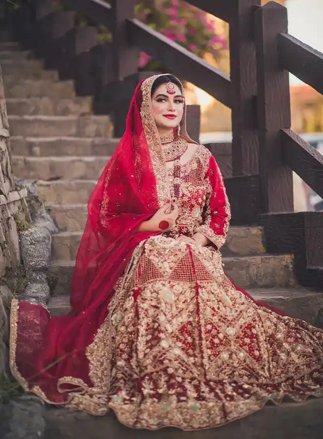 This stunning bridal ensemble features a luxurious shirt, a beautiful lehnga, and an elegant dupatta, all crafted from premium organza in a striking red hue. The outfit is heavily handworked, showcasing intricate adda work with an exquisite combination of stone, qora, dabka, and sequins. Perfect for brides who desire a bold and opulent look, this attire is designed to make a memorable statement on their special day.