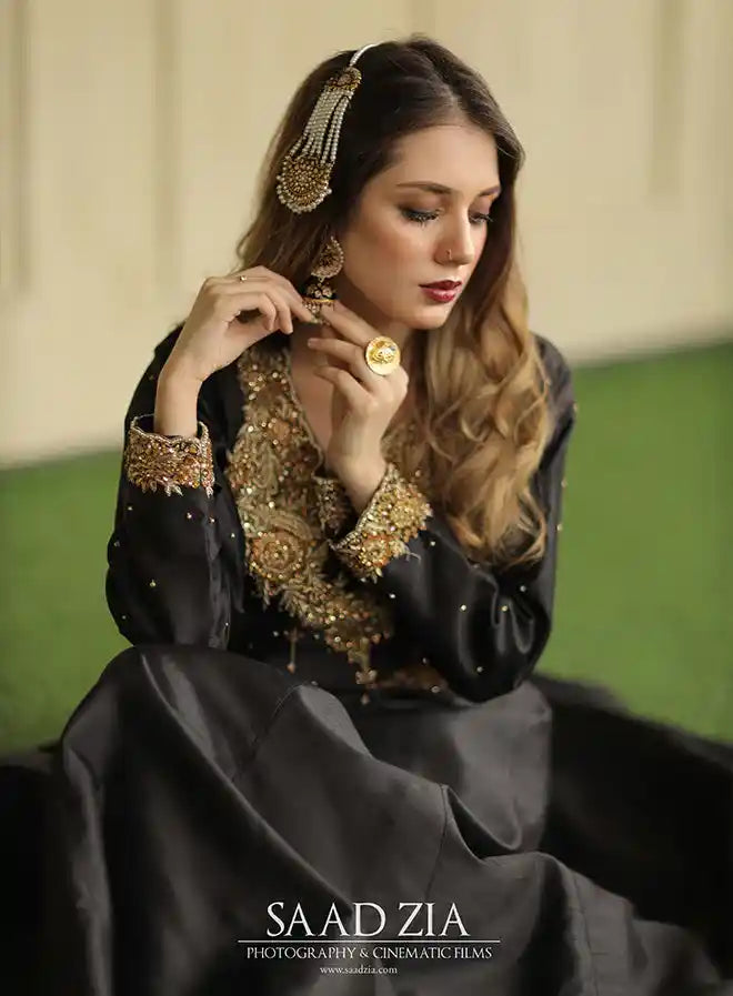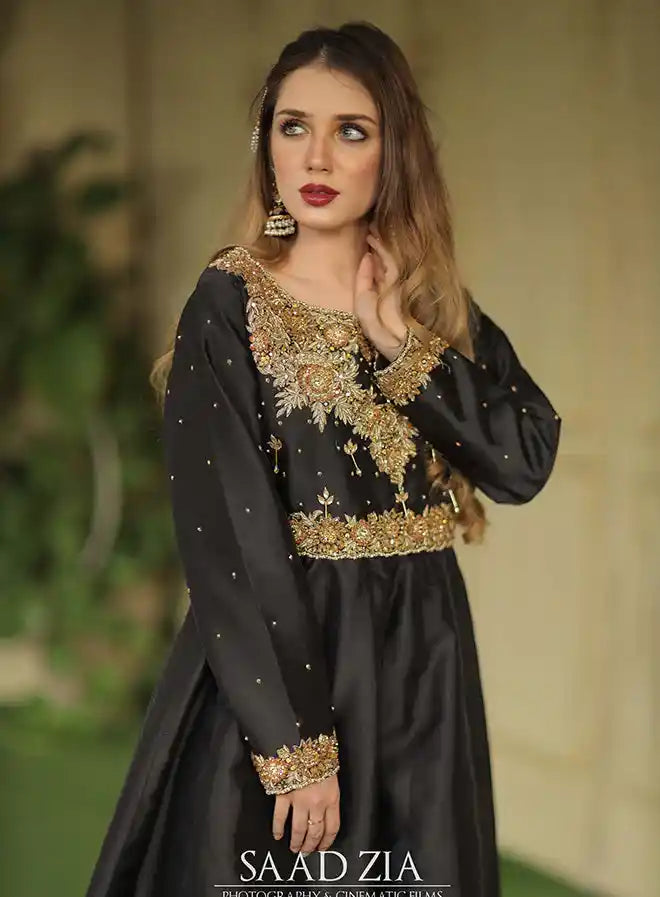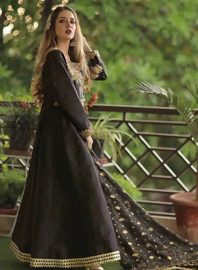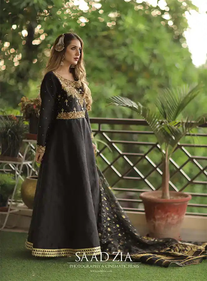 Paired with a pure Banarasi organza dupatta finished with silk edges, this outfit combines elegance and tradition. The black and gold color palette ensures a timeless appeal, making it a standout choice for special occasions. This ensemble is a fully stitched two-piece outfit.
