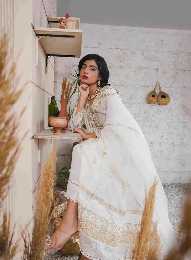 Presenting a must-have collection filled with distinctive, quintessentially Kehkeshan prints, masterfully tailored to be worn and cherished for years to come. This off-white cotton silk gown features artfully illustrated block-printed floral motifs, exuding elegance and grace. The neckline is delicately hand-worked, adding an intricate touch to the design.Â
