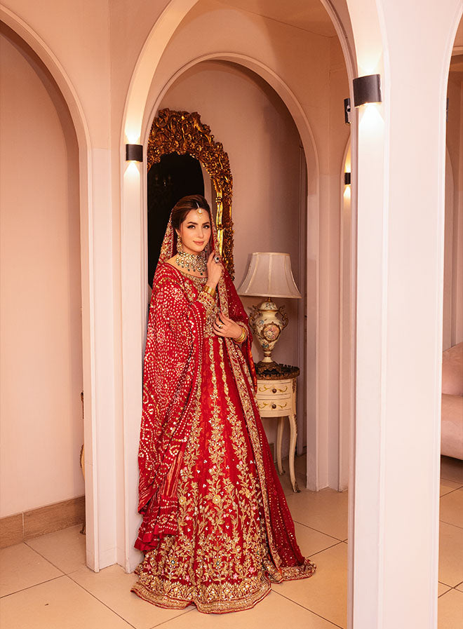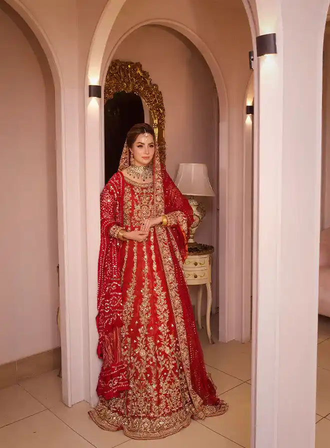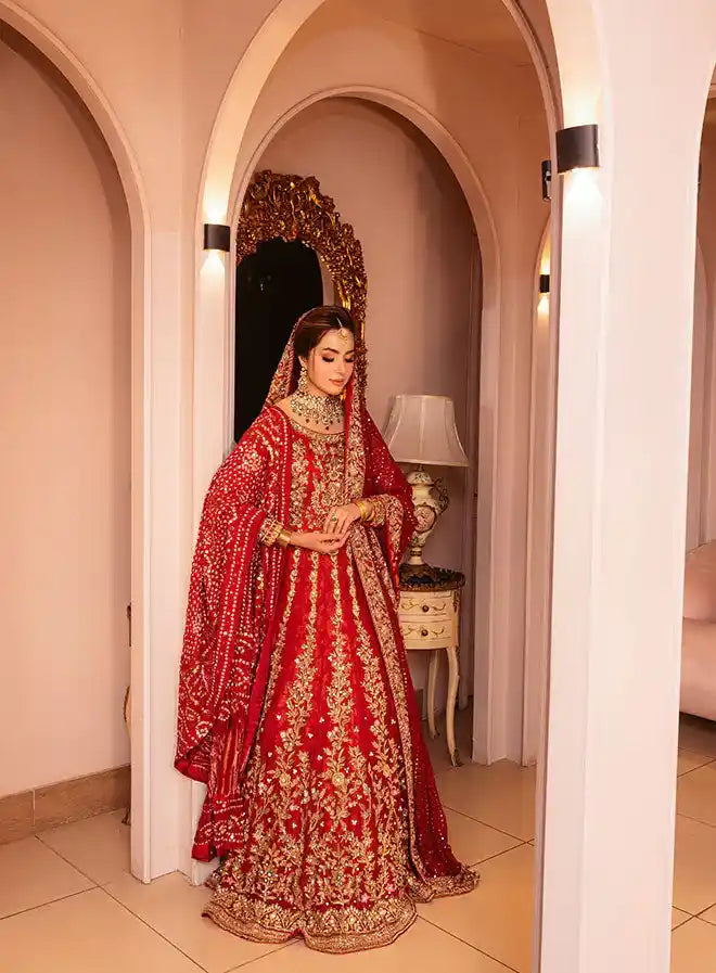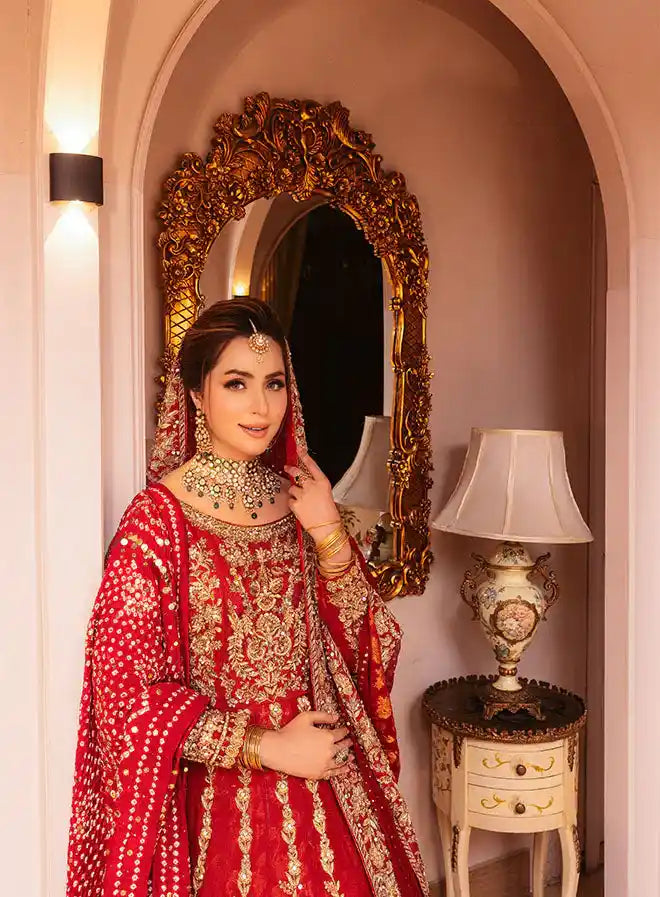 Introducing Gulzar Bano, a captivating red bridal maxi, meticulously crafted for those who desire timeless elegance and intricate artistry. This two-piece ensemble includes a stunning maxi top in luxurious khaddi net, adorned with detailed adda work featuring qora dabka, sequins, stones, crystals, and resham, bringing unmatched grace to this bridal masterpiece. Paired with a delicate chiffon dupatta, Gulzar Bano embodies the essence of refined tradition.