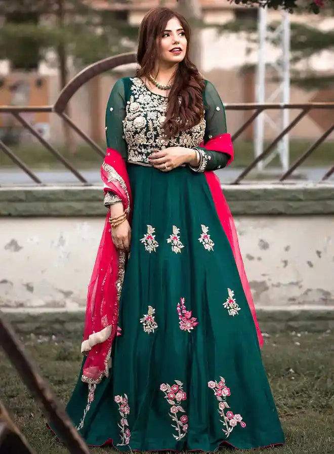 Presenting a stunning 3-piece stitched outfit that exudes elegance and sophistication. The ensemble features a beautifully handworked silk shirt that serves as the focal point, enhanced by intricate adda work. It is paired with a lavish lehenga crafted from raw silk, showcasing exquisite handwork of qora, dabka, gotta, resham, and stones. Complementing the look is a delicate net dupatta adorned with the same meticulous detailing, creating a harmonious balance throughout the outfit. Perfect for formal occasions, this ensemble is designed to make a lasting impression.