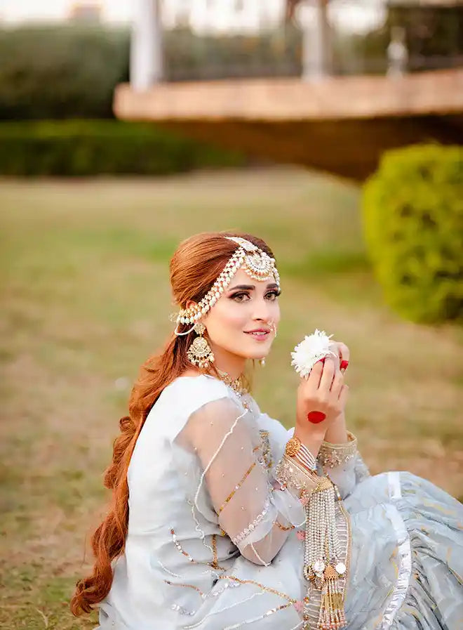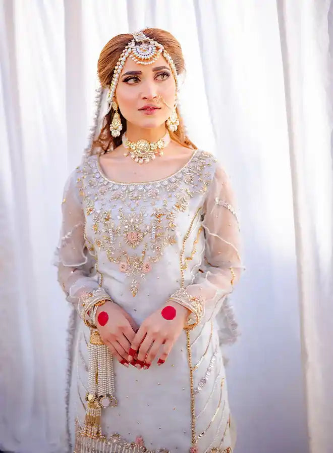 This elegant 4-piece set includes a beautifully crafted shirt, an embellished gharara, a stunning dupatta, and a stylish pouch/potli, all in a delicate ice blue hue. The shirt and dupatta are made from pure organza, while the gharara features intricately embroidered and embellished organza. The ensemble showcases exquisite adda work, incorporating qora, dabka, gotta, sequins, and stone detailing. The hand-worked shirt is perfectly paired with the embroidered gharara and a Kamdani dupatta, finished with exquisite tamba kirran detailing, making it a perfect choice for special occasions and celebrations.