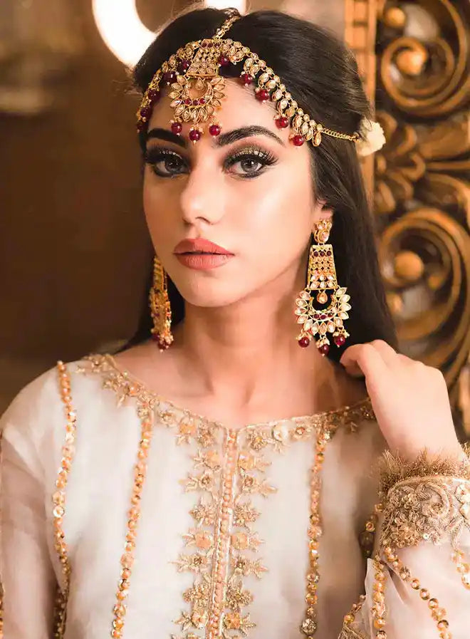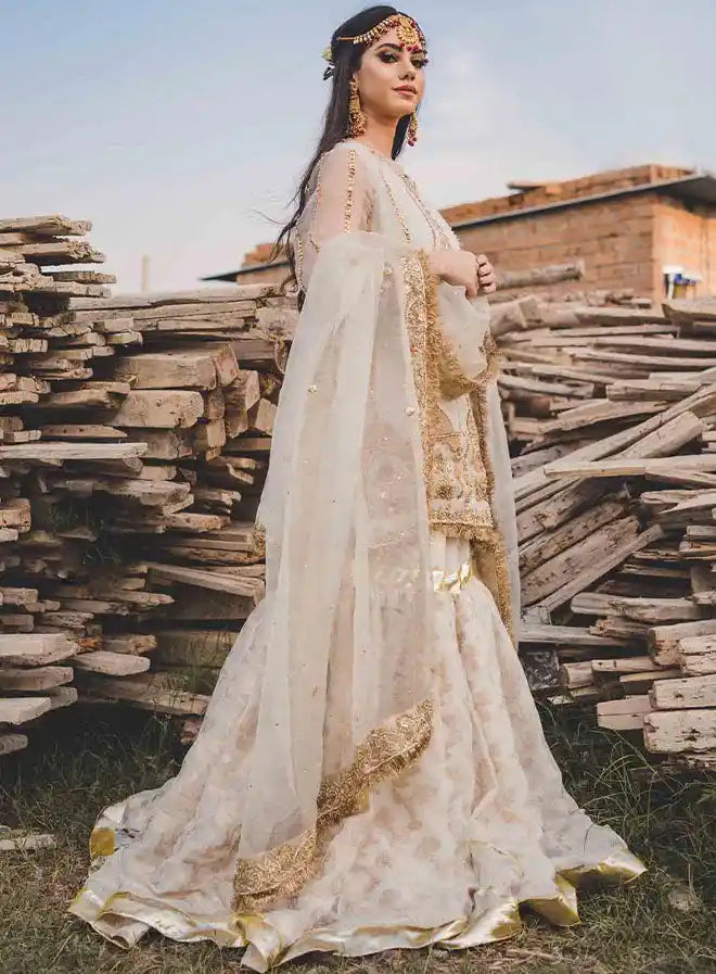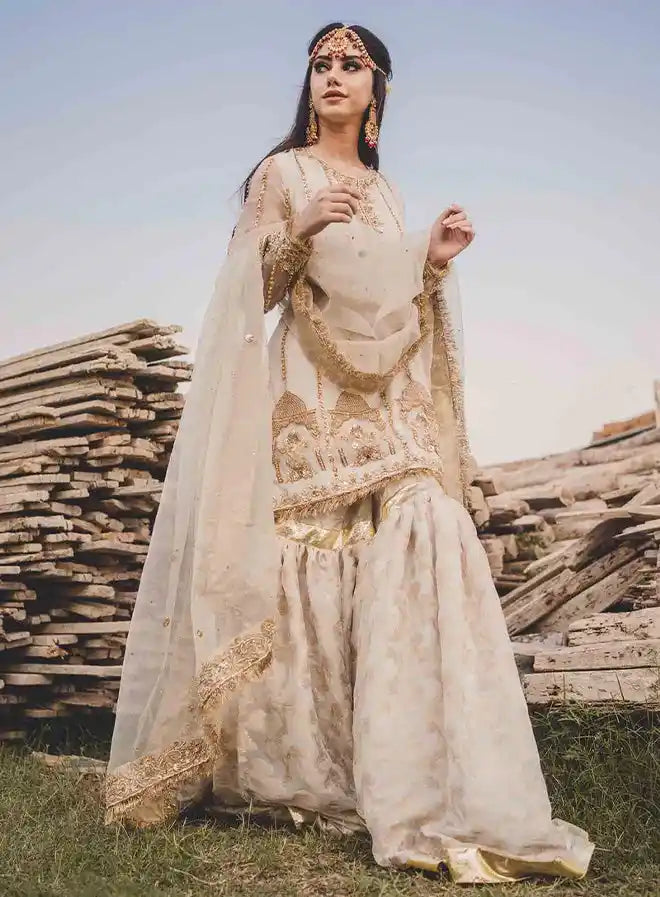 The shirt features intricate hand embroidery with beautiful gotta, naqshi, stone, and sequin detailing, adding a touch of elegance. The dupatta showcases a handworked border with a delicate stone and gotta spray, finished with metallic kirran accents. The gharara is adorned with exquisite gotta embellishments, creating a harmonious blend of tradition and sophistication. This outfit is ideal for brides who wish to radiate grace and charm on their special day.