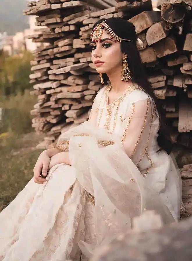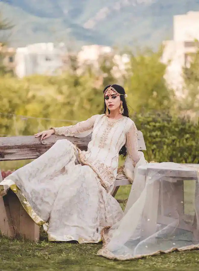 The "Mannat" ensemble by Kehkeshan is a stunning 3-piece stitched outfit, perfect for a Nikkah bride. This exquisite set includes a beautifully crafted shirt, an elegant gharara, and a stylish dupatta, all designed to make a memorable statement. The shirt and dupatta are made from luxurious pure organza, while the gharara is fashioned from rich Banarsi chiffon.Â