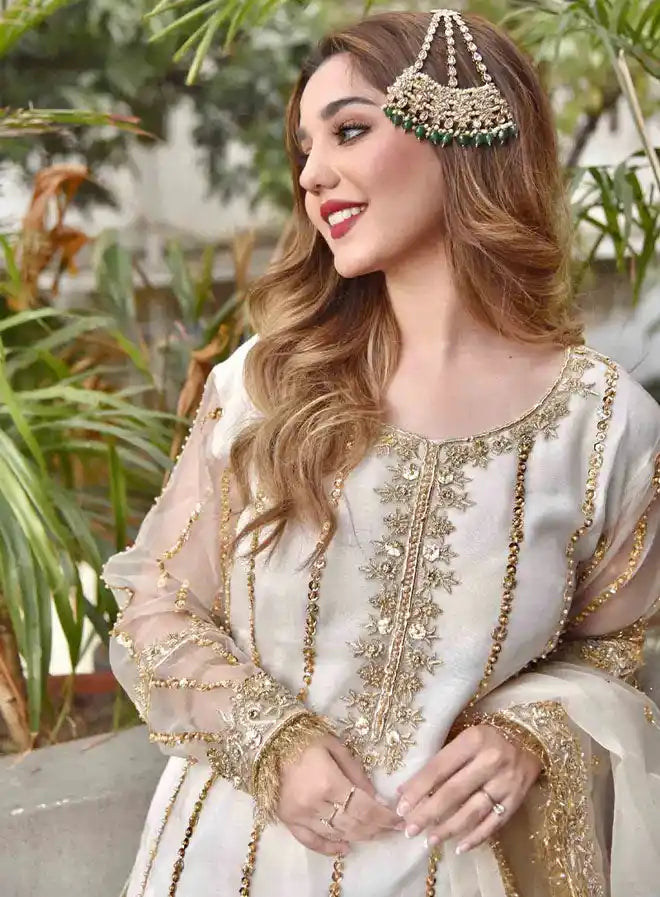 The "Mannat" ensemble by Kehkeshan is an exquisite choice for a Nikkah bride, featuring a beautifully designed set that includes a shirt, sharara, dupatta, and a stylish pouch/potli. Crafted entirely from luxurious organza, the shirt boasts intricate handworked details, including delicate gotta, naqshi, stone, and sequin embellishments.