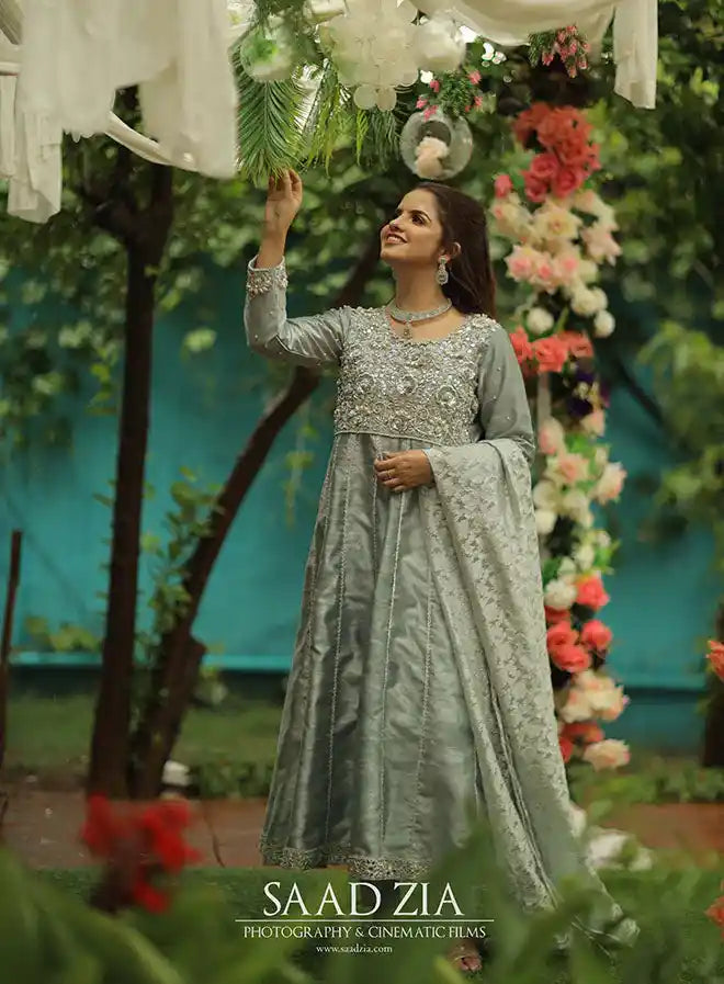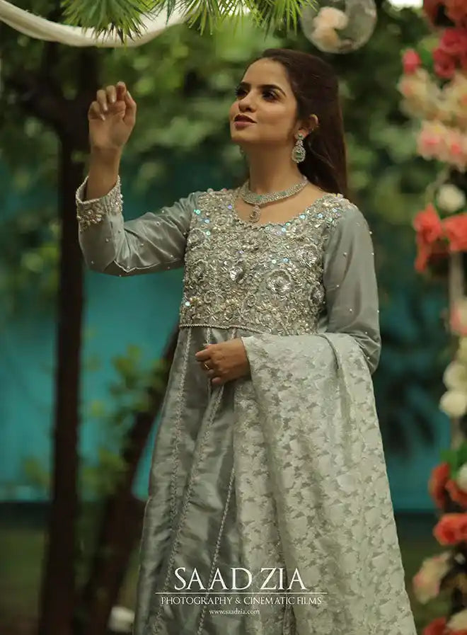 Introducing a stunning ice blue ensemble that epitomizes elegance and sophistication. This 3-piece set includes a flared silhouette pishwas, complemented by matching trousers and a luxurious dupatta, all crafted from premium raw silk. The pishwas features exquisite hand work in silver, adorned with intricate details of sequins, pearls, stones, and dabka that create a mesmerizing effect. The sleeves are enhanced with beautiful hand embroidery, showcasing the same meticulous craftsmanship. Completing the look is a pure banarsi organza dupatta with silk finishing, adding a touch of refinement to the outfit. This stitched 3-piece ensemble is perfect for any special occasion, ensuring you make a memorable impression.