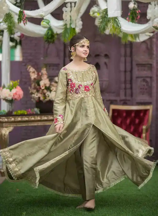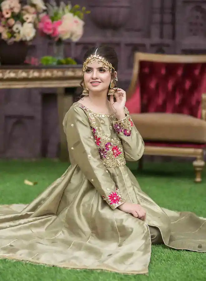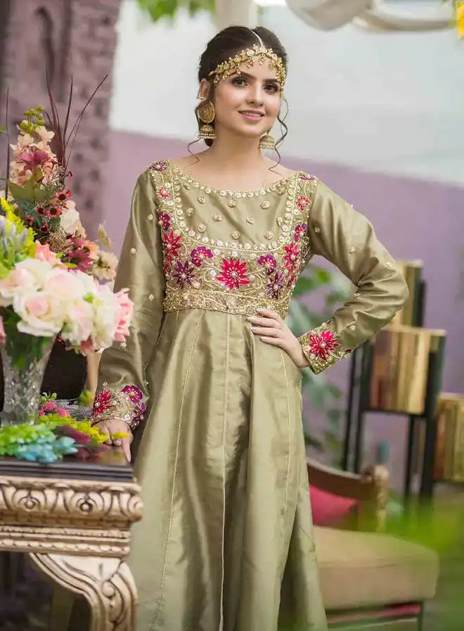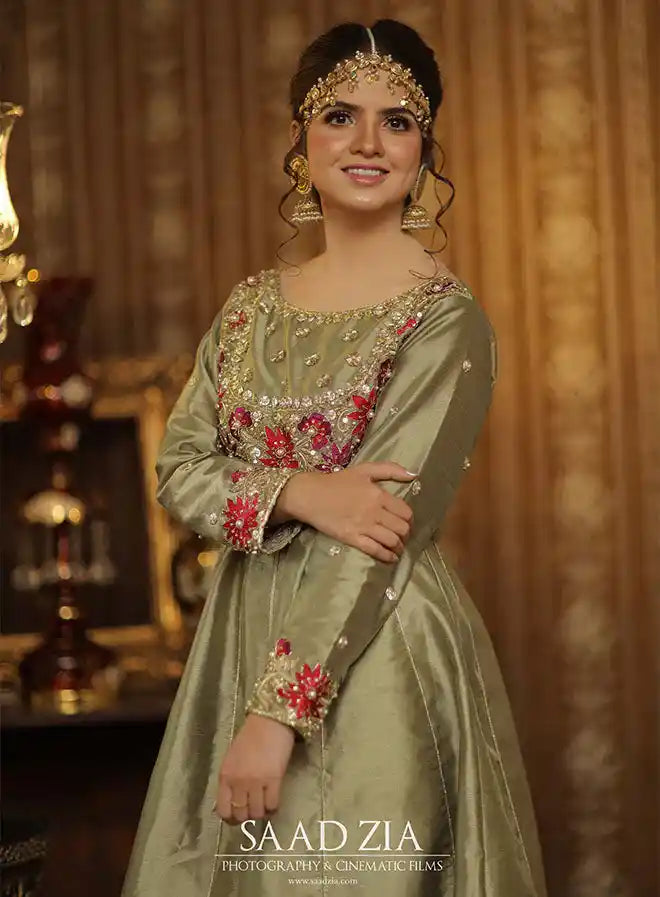 Introducing our stunning olive green ensemble, a perfect blend of elegance and tradition, consisting of a 3-piece set that includes a maxi, trouser, and dupatta. This flared silhouette pishwas is crafted from luxurious Indian raw silk and features exquisite hand-worked details in gold and maroon. The body of the pishwas is beautifully adorned with sequences, stones, resham, and dabka, adding a touch of opulence. The sleeves showcase intricate hand-worked embellishments, making it a show-stopping piece. Paired with a pure Banarasi organza dupatta with silk finishing, this stitched outfit is perfect for special occasions where you want to make a lasting impression.