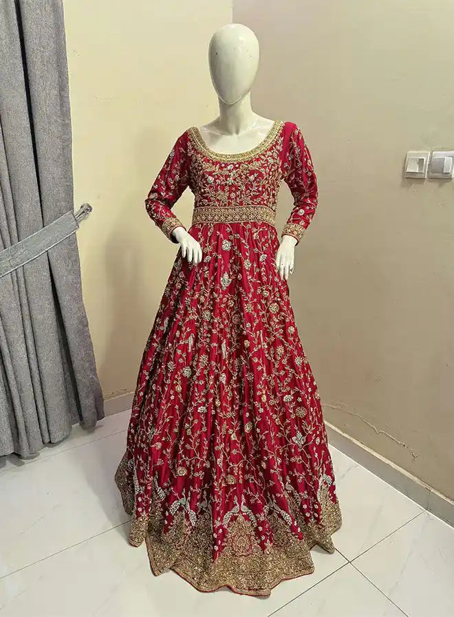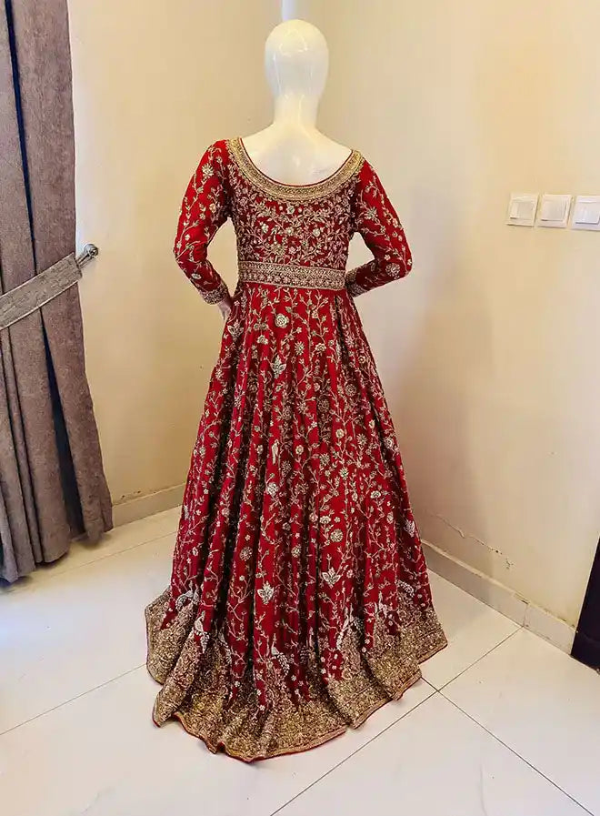 Introducing Sahira, an exquisite 4-piece bridal ensemble in a striking red, featuring a silk pishwas-style top and trouser set with a chiffon dupatta and matching potli. This luxurious outfit showcases heavy zardozi work on both front and back, intricately designed with qora, dabka, naqshi, sequence, and crystals, adding a rich allure to the ensemble. The dupatta is adorned with a zardozi border and a sprinkle of embellishments throughout, enhancing its opulent appeal. Sahira is perfect for bridal occasions and can be customized in any color combination, size, cut, and work color scheme to suit personal preferences.