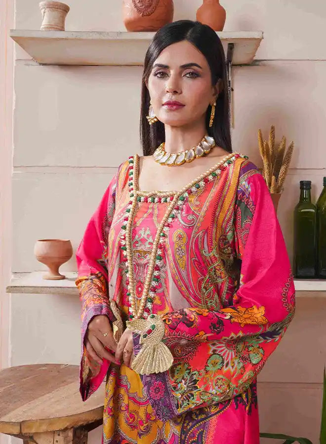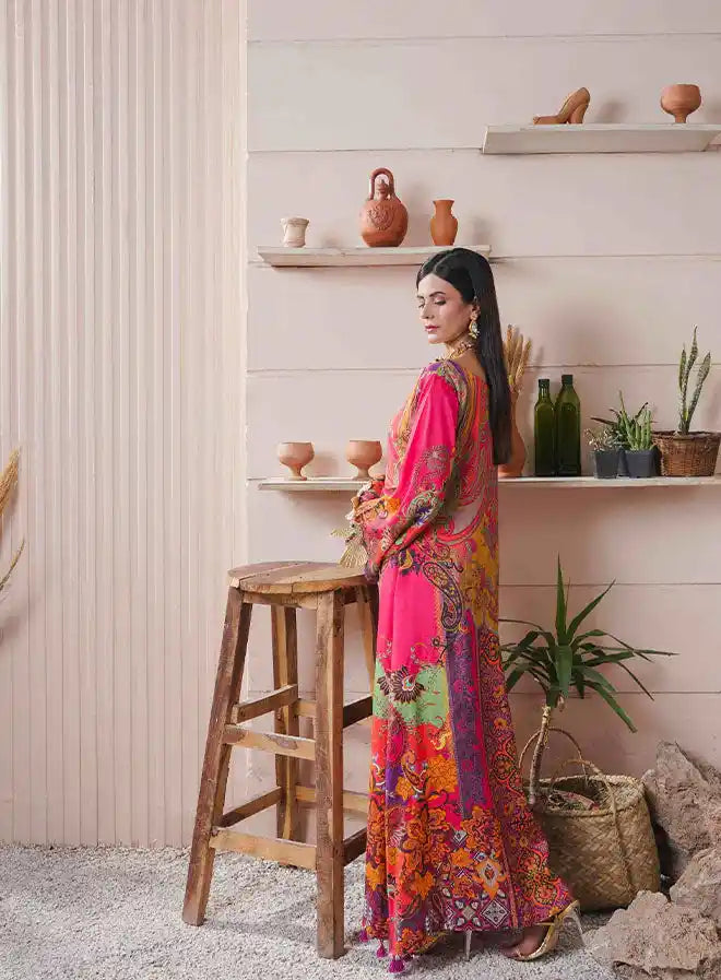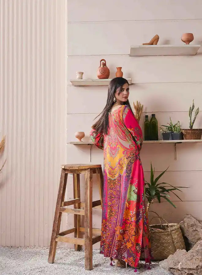 Presenting a must-have collection filled with distinctive, quintessentially Kehkeshan prints, masterfully tailored for enduring style and elegance. This raw silk kaftan-style shirt features a vibrant canvas of multi-colors adorned with artfully illustrated floral motifs. It is beautifully embellished with delicate gold, green, and maroon bead embroidery on the neckline and daman, complemented by hanging tassels that add an enchanting touch. For a standout look, complete your ensemble with our silk pants (as shown). With a shirt length of 56 inches, this kaftan is a guaranteed showstopper for any occasion.