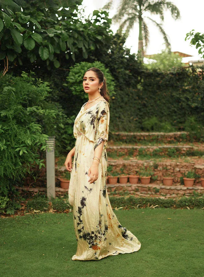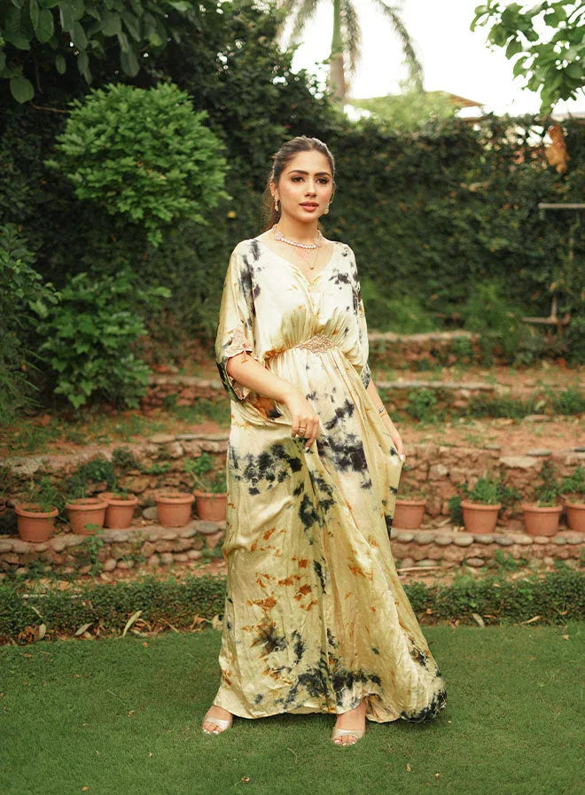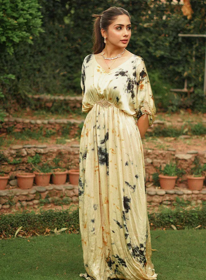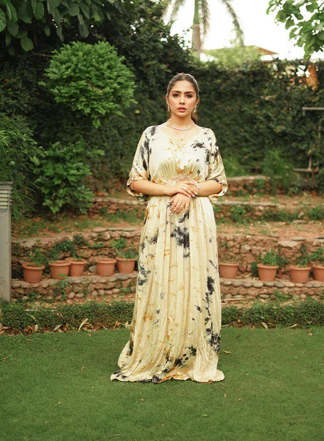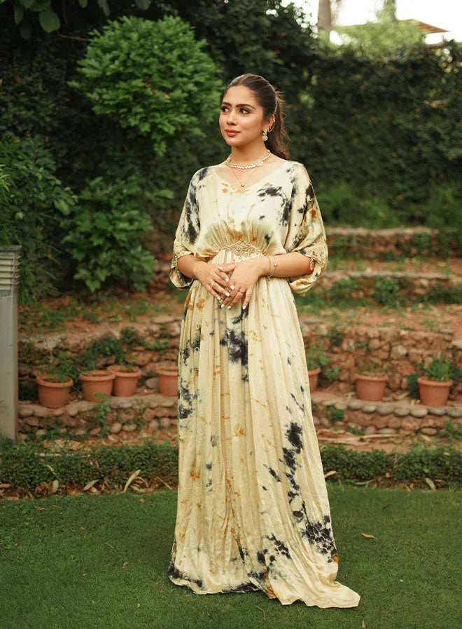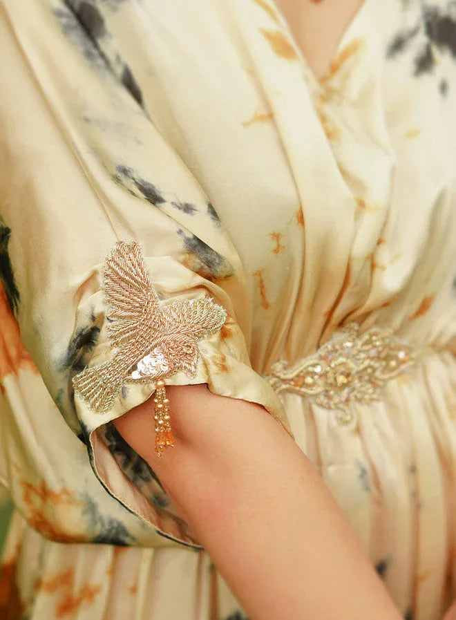 This stunning kaftan, crafted in a luxurious blend of beigish brown, burnt orange, and greyish black hues, exudes ethereal charm. Designed with a flowy silhouette, it features intricate adda work, including hand-applied sequins, dabka, and crystals along the sleeves and a beautifully embellished motif on the pleats. With a length of 60 inches, this kaftan offers a perfect blend of elegance and artistry, making it an ideal showstopper for any occasion.