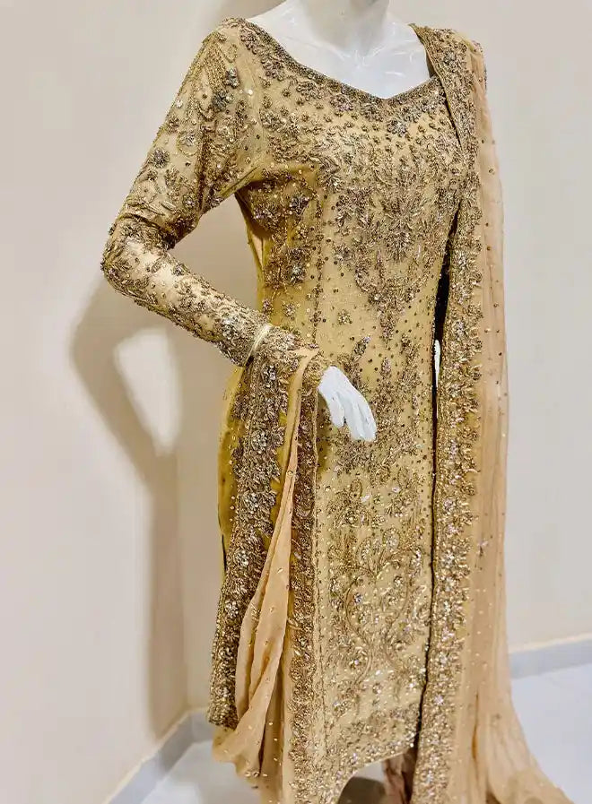 Accompanying the shirt and trouser is a heavily worked long dupatta made from pure chiffon. This dupatta showcases intricate motifs and booti designs, sprinkled with sequins to add a touch of sparkle and drama.