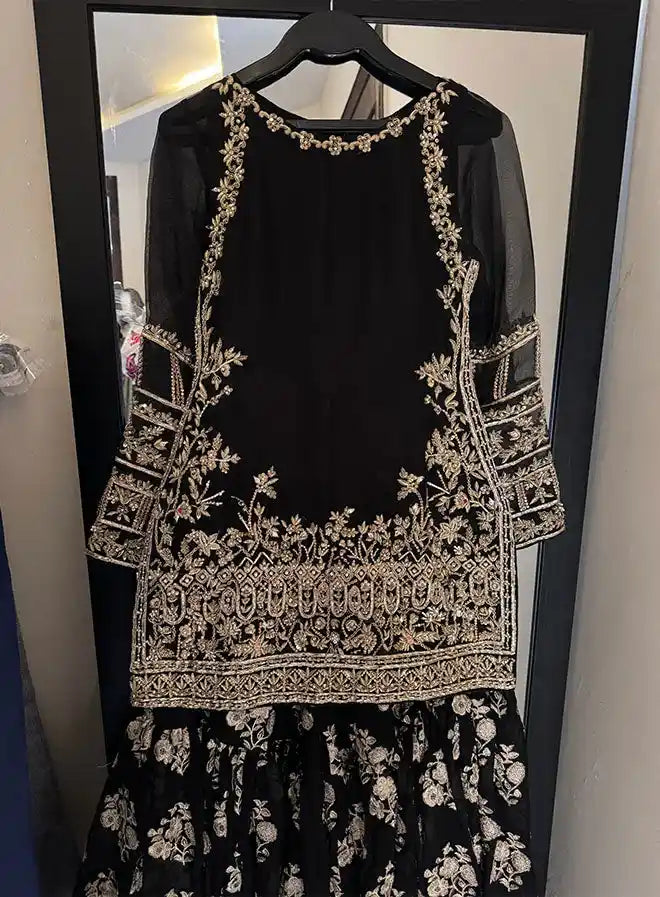 Embrace elegance with Zareen, a meticulously crafted zardozi-worked gharara outfit that embodies timeless sophistication. This 3-piece ensemble features a hand-embroidered organza kurti adorned with intricate details of qora, dabka, sequins, stones, gotta, and resham. Paired with an embroidered chiffon gharara and a silk dupatta embellished with gotta work, Zareenis the perfect choice for weddings and formal gatherings, offering both luxury and style. Designed for versatility, it can be customized to your preferred color combination, style, cut, and size, ensuring a flawless fit and unique appeal. Step into refined elegance for any occasion with Zareen, where every detail speaks to artistry and sophistication.