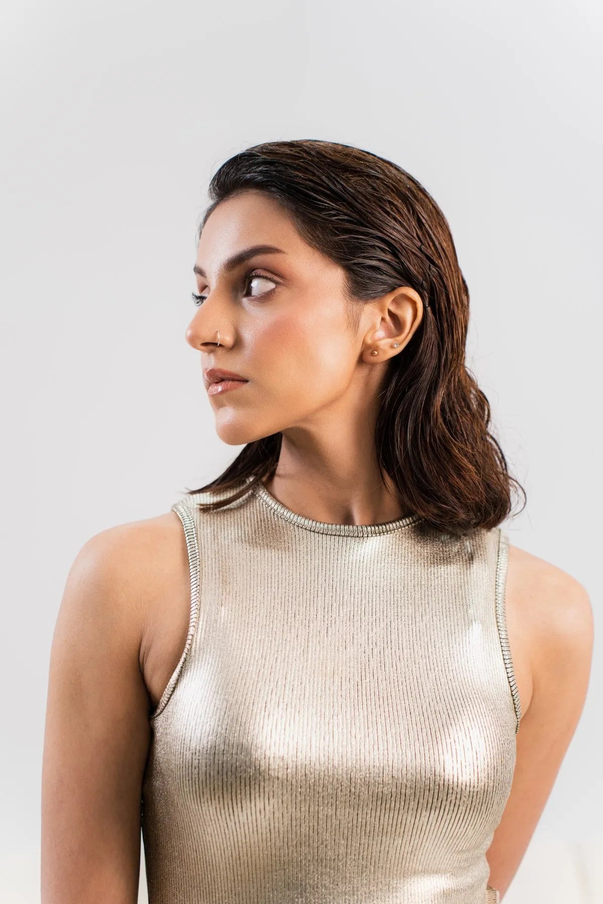 A sleek and glamorous essential for your wardrobe. Tin crafted from ribbed fabric in a metallic silver hue, this halter neck, sleeveless bodysuit exudes modern sophistication. The gusset closure ensures a seamless fit, combining comfort with style. Elevate your fashion game with this statement piece, perfect for adding a touch of allure to any ensemble.
