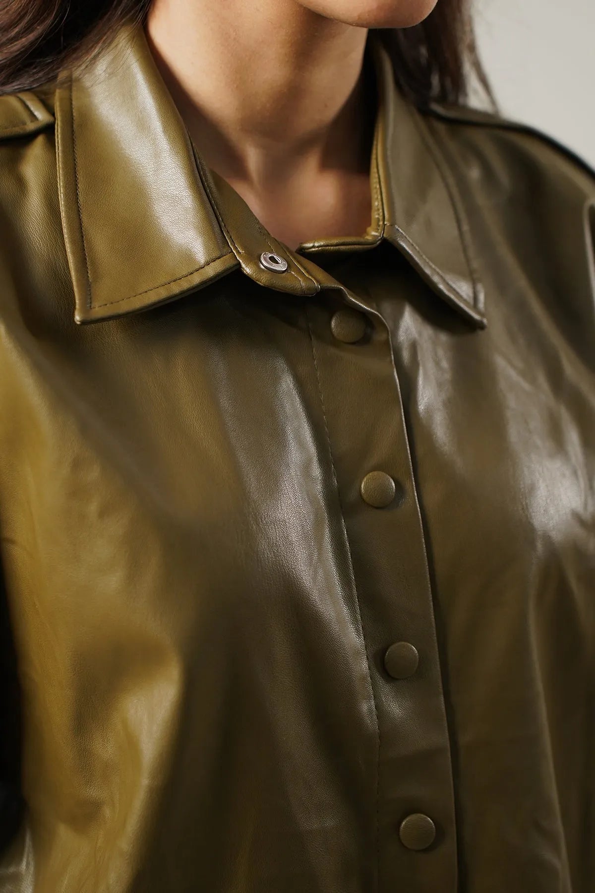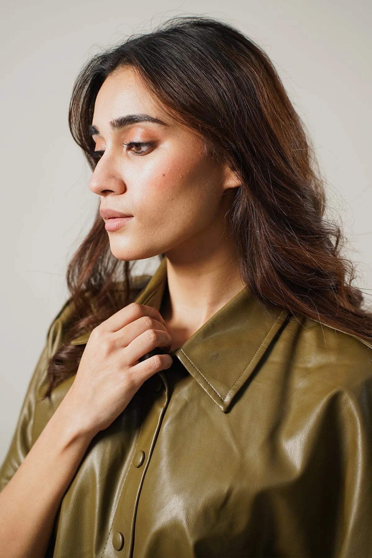 Crafted from high-quality faux leather, this half-sleeved collared shirt exudes fashion forwardness. Featuring shoulder tabs for added detail, it offers a sleek silhouette. The standout feature is the accompanying cross body mini bag, combining convenience with chic style.