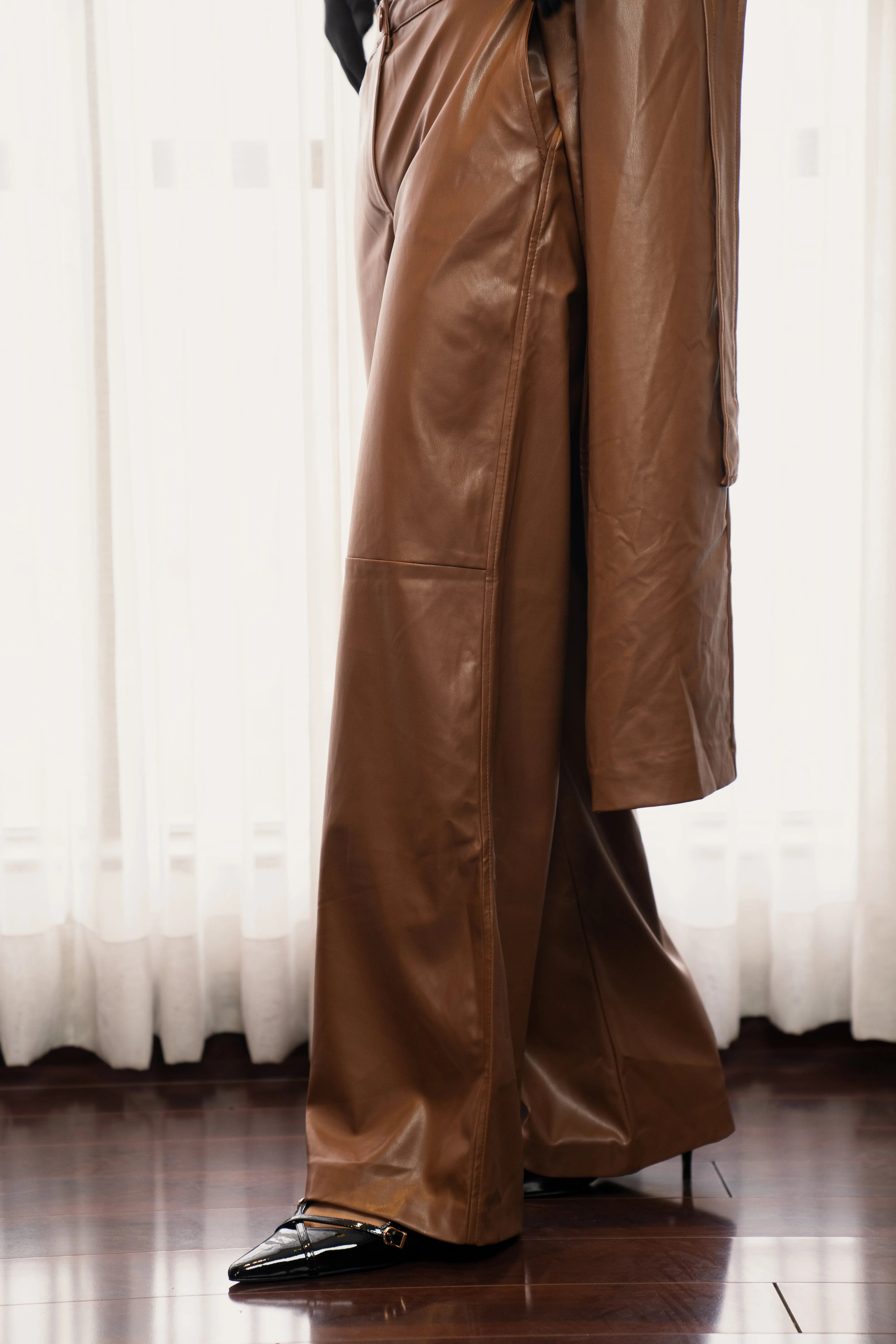 A sleek addition to your wardrobe in brown. Crafted from premium PU leather, these straight-cut pants exude modern elegance. Featuring two front pockets for convenience and two darts in the back for a tailored fit, combining style with functionality.