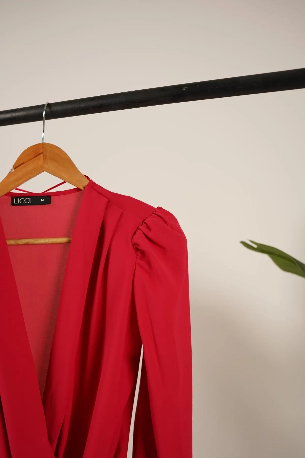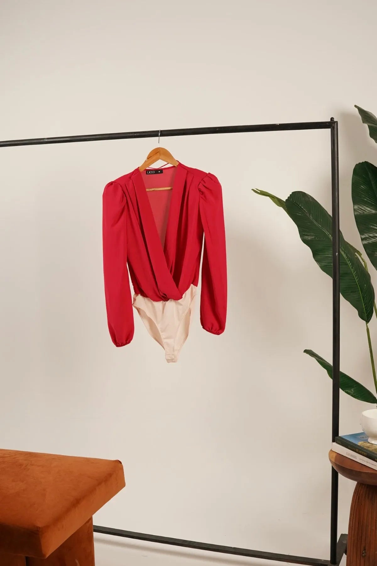 A bold statement piece in vibrant red. Crafted from a sleek fabric, this bodysuit features a pleated front for added texture and elegance. The puffy sleeves and shoulder pads elevate the silhouette, adding a touch of drama.