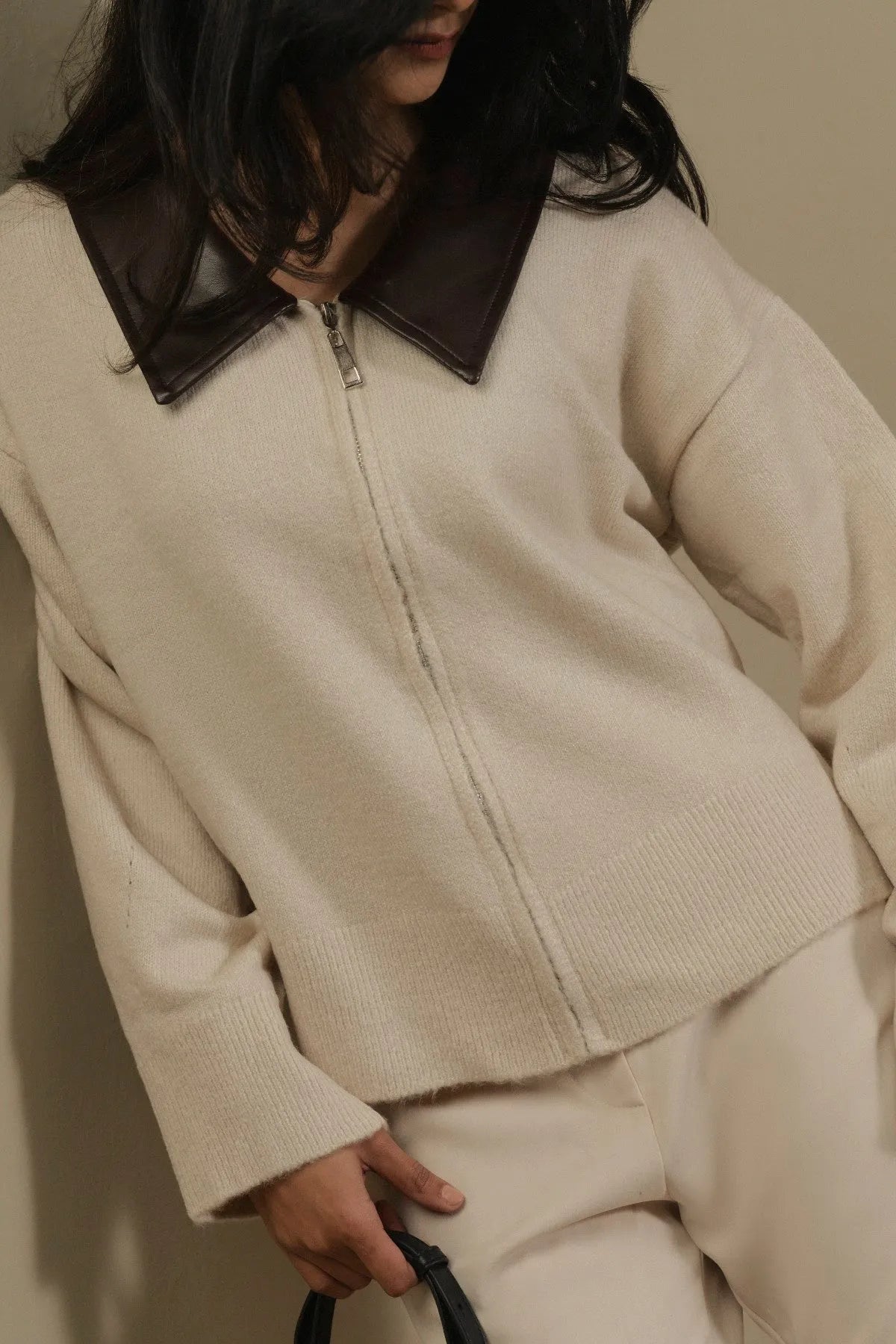 Built with a premium polyester blend, this zip-front knit offers a balanced mix of softness and structure. The fabric sits cleanly on the body, while the front zipper introduces a sharp, contemporary edge. Finished with a contrast collar that adds definition, the piece feels intentional and well composed. Modern in shape and easy to style, it’s a confident everyday layer with a polished attitude.