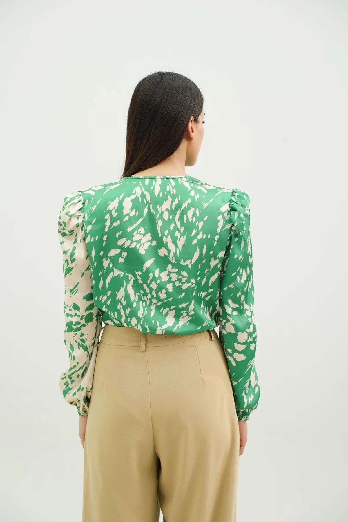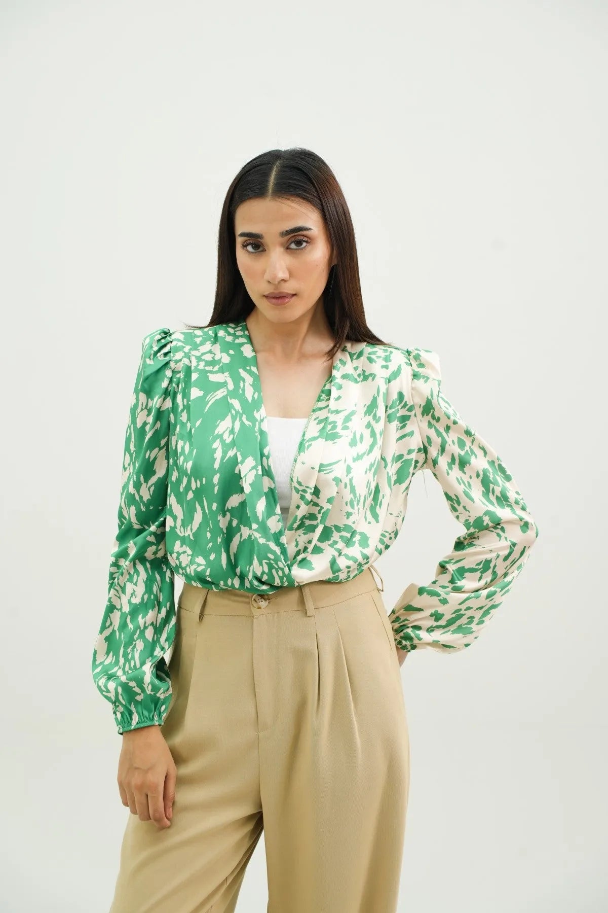 A glamorous fusion of style and sophistication. Crafted from luxurious satin in a captivating green print, this bodysuit features a pleated front for added texture and flair. The puffy sleeves and shoulder pads enhance the silhouette, exuding elegance and confidence.