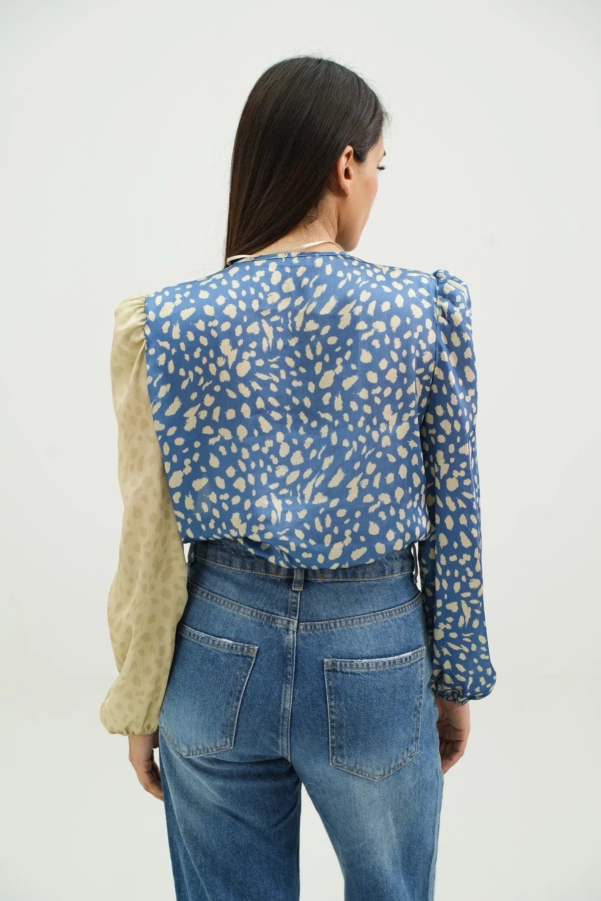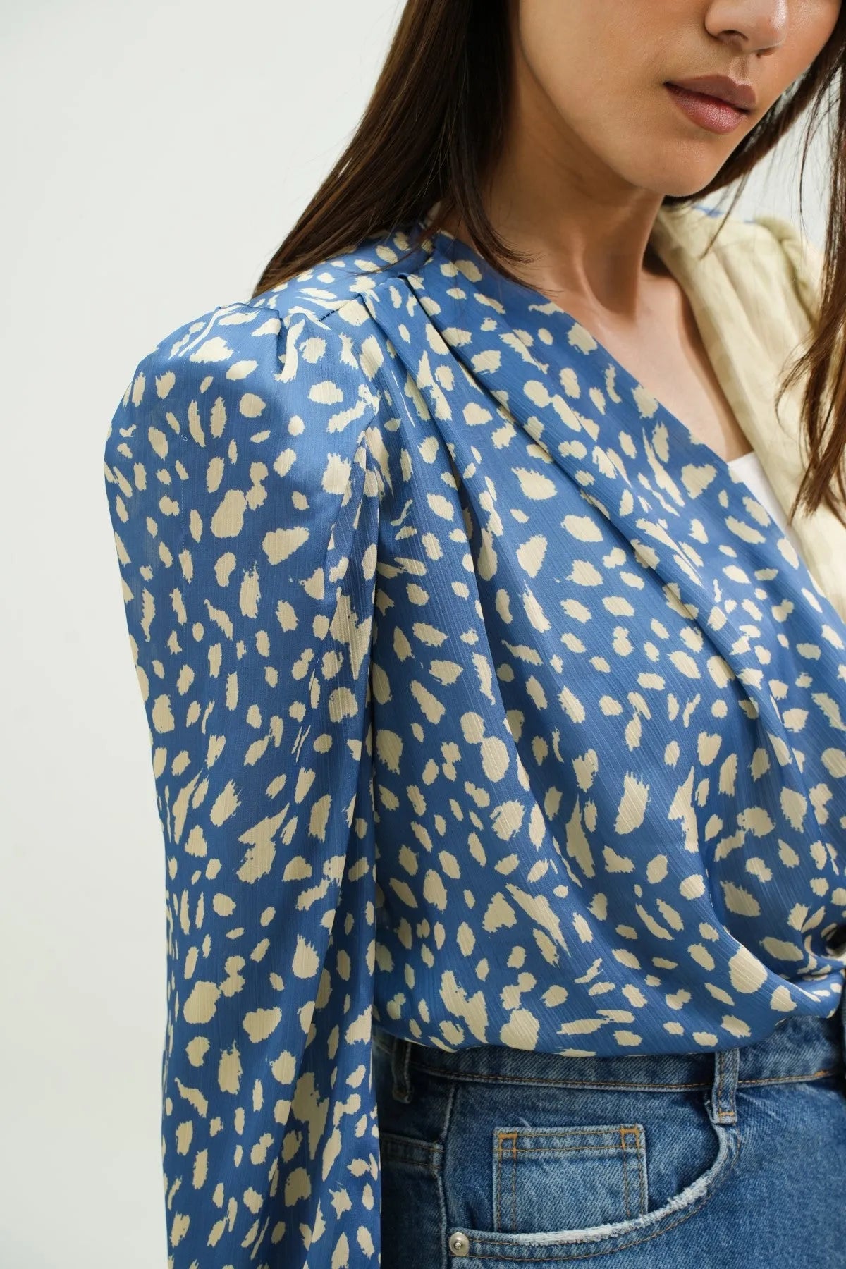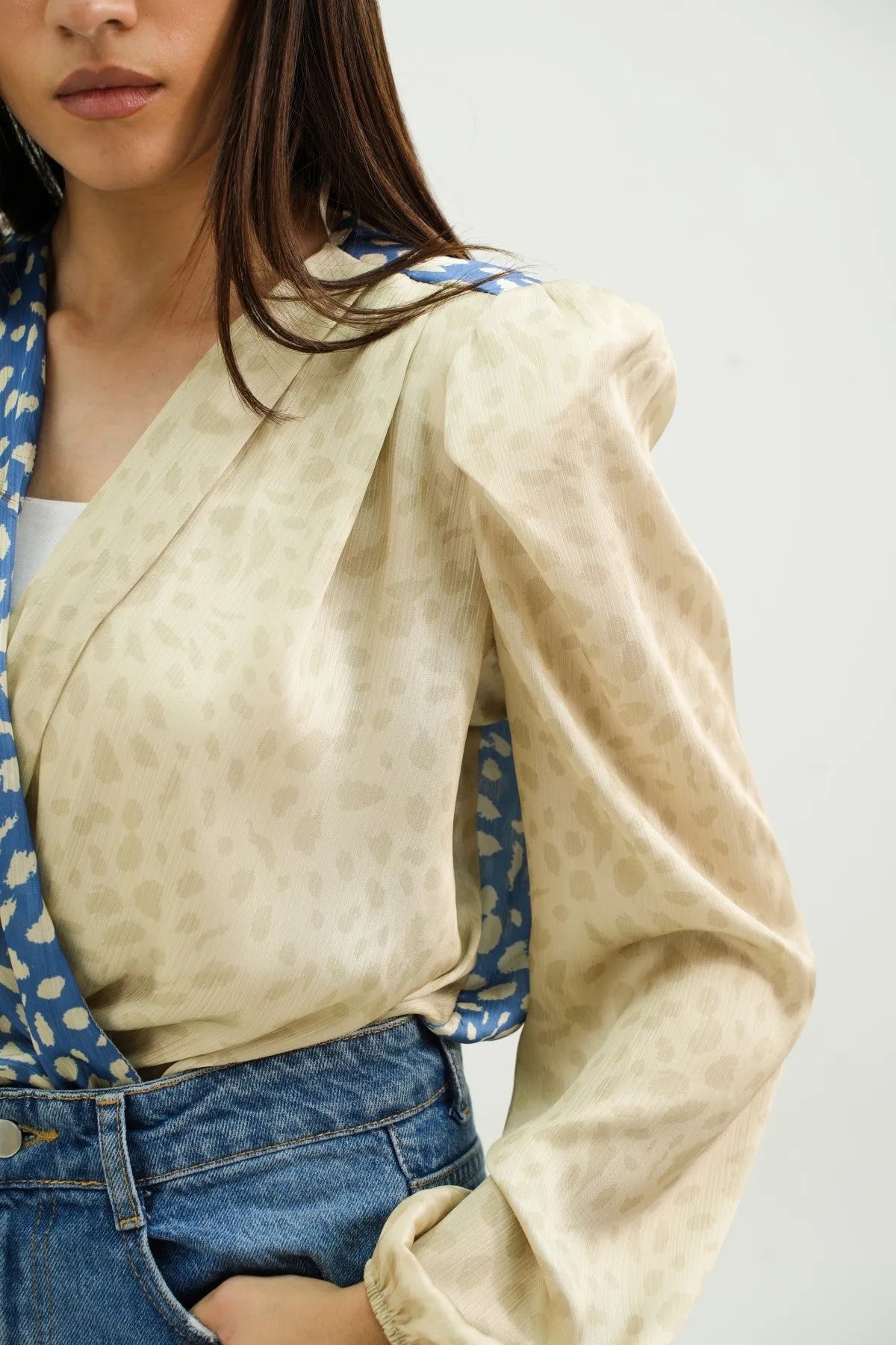 A glamorous fusion of style and sophistication. Crafted from luxurious satin in a captivating green print, this bodysuit features a pleated front for added texture and flair. The puffy sleeves and shoulder pads enhance the silhouette, exuding elegance and confidence.