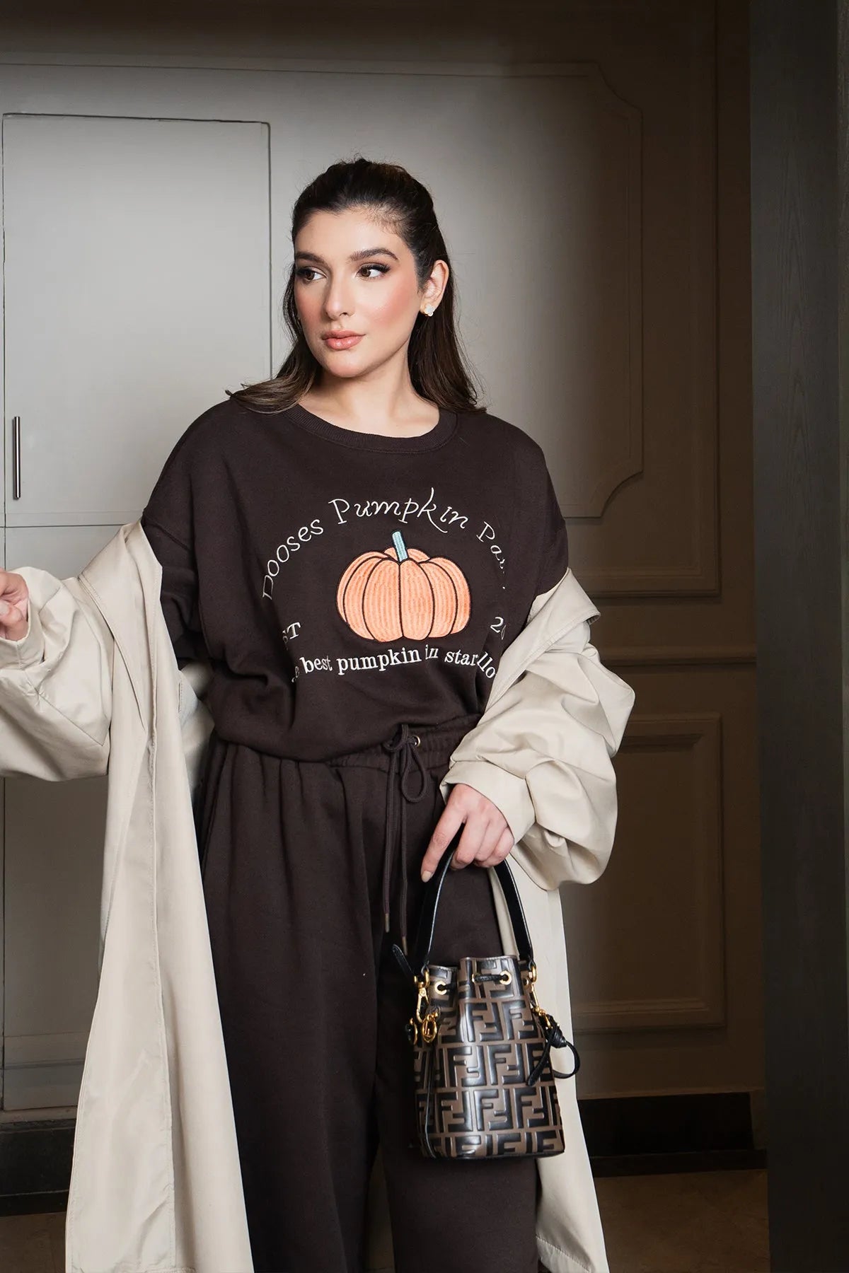 "Welcome sweater weather with this stylish pumpkin-themed sweatshirt. The warm brown tone and seasonal graphic make it a standout piece for all your fall adventures. Soft, cozy, and effortlessly chic, it’s a must-have for pumpkin patch days and beyond