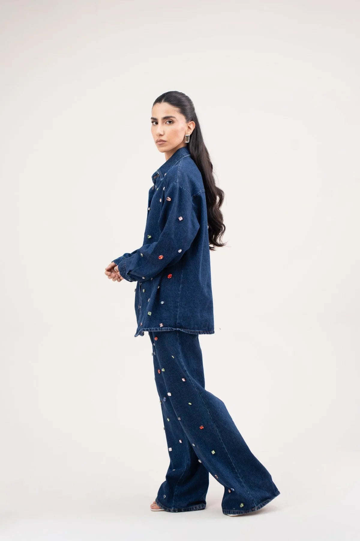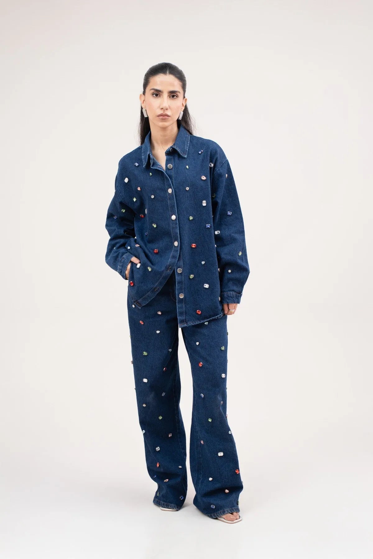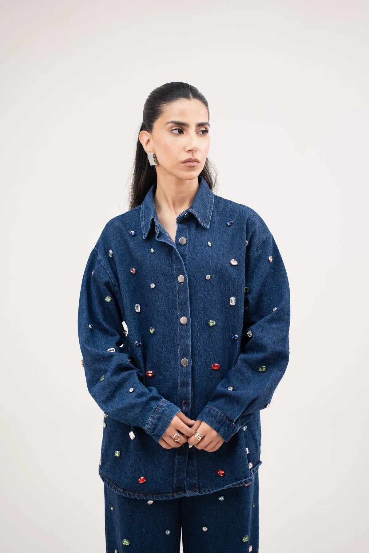 This denim shirt is crafted from 100% cotton and finished with multi colour beads scattered across the surface. Designed with long sleeves, a collared neckline, and front buttons, it keeps a classic shape with added texture. The fit is easy and versatile, making it a standout on its own or styled as a set. Pair it with the matching trousers to complete the look.