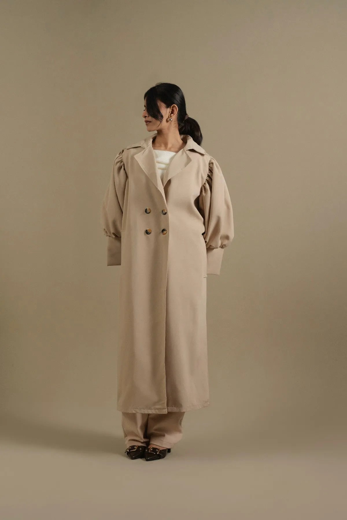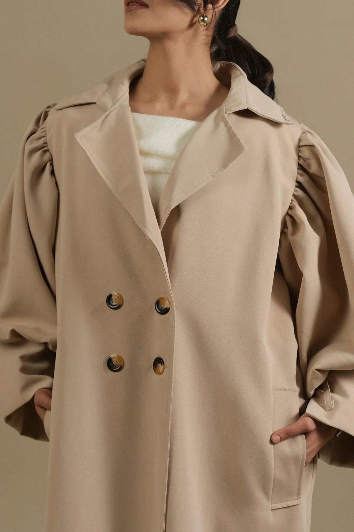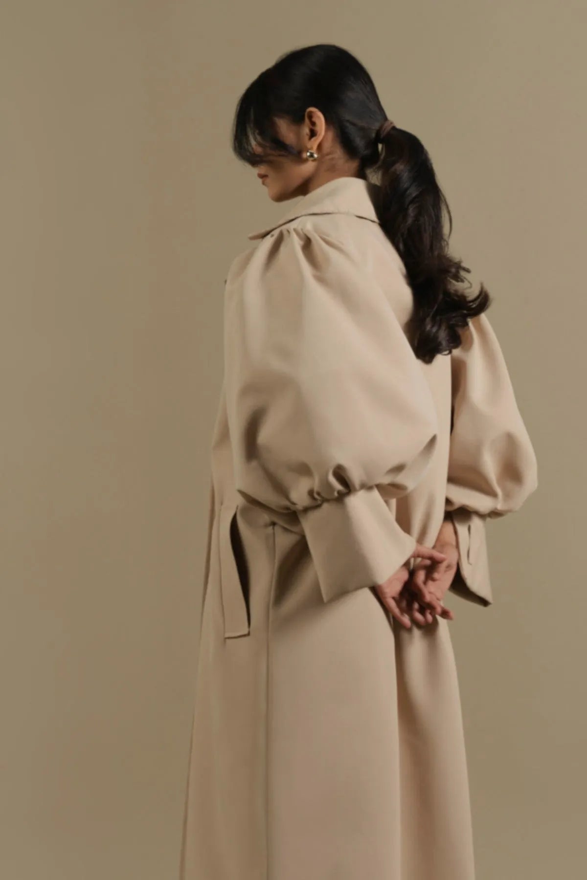 Cut from premium cotton, this trench-style dress has an easy, structured feel that sits well on the body. Designed with a double-breasted front featuring four buttons for closure, it carries a classic trench appeal while staying effortless to wear. Balloon sleeves add soft volume to the silhouette, balanced by a clean lapel collar. The design also includes two front cross pockets and a full inner lining for comfort and ease. The adjustable belt allows you to define the waist as you like, making it a versatile piece that’s easy to wear and easy to style.