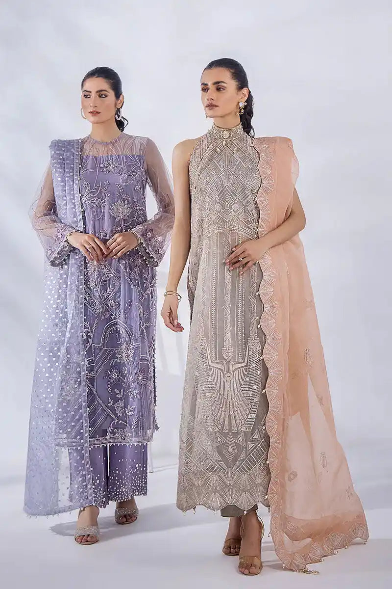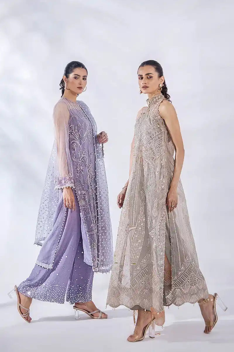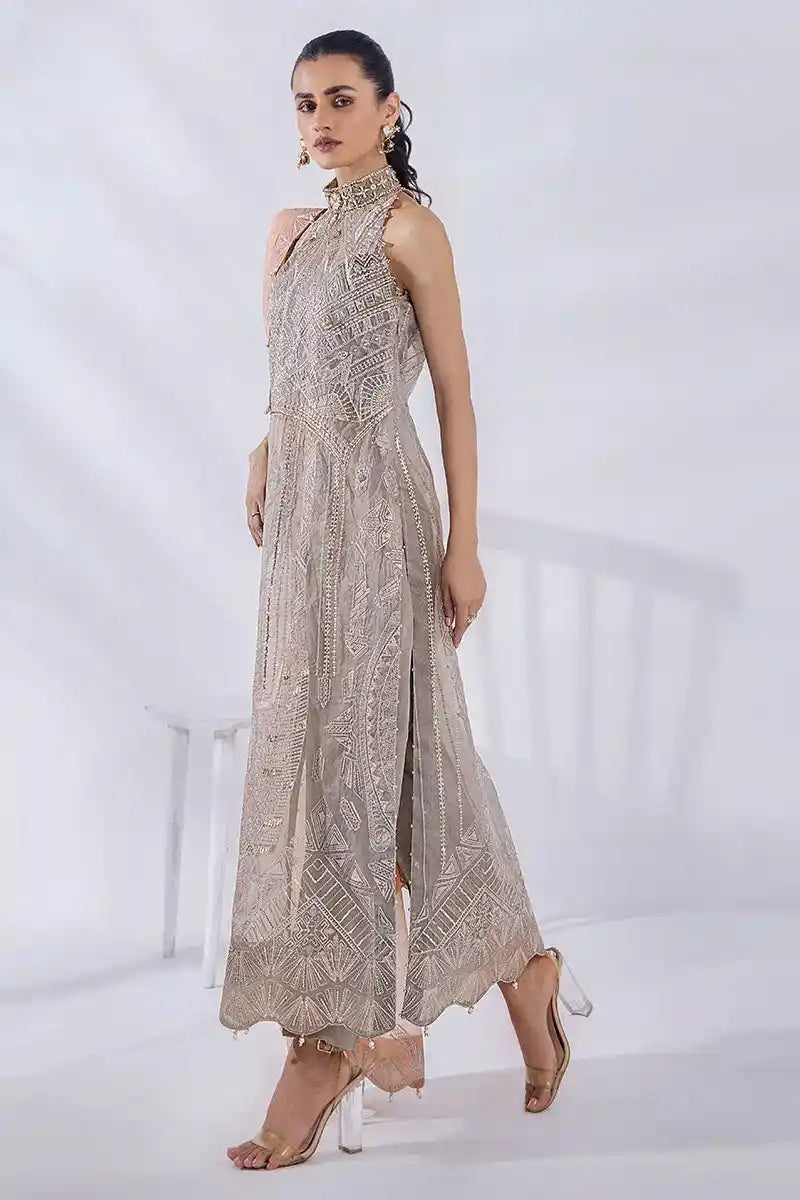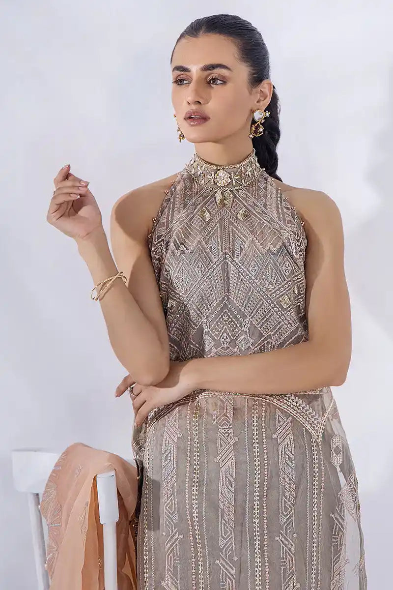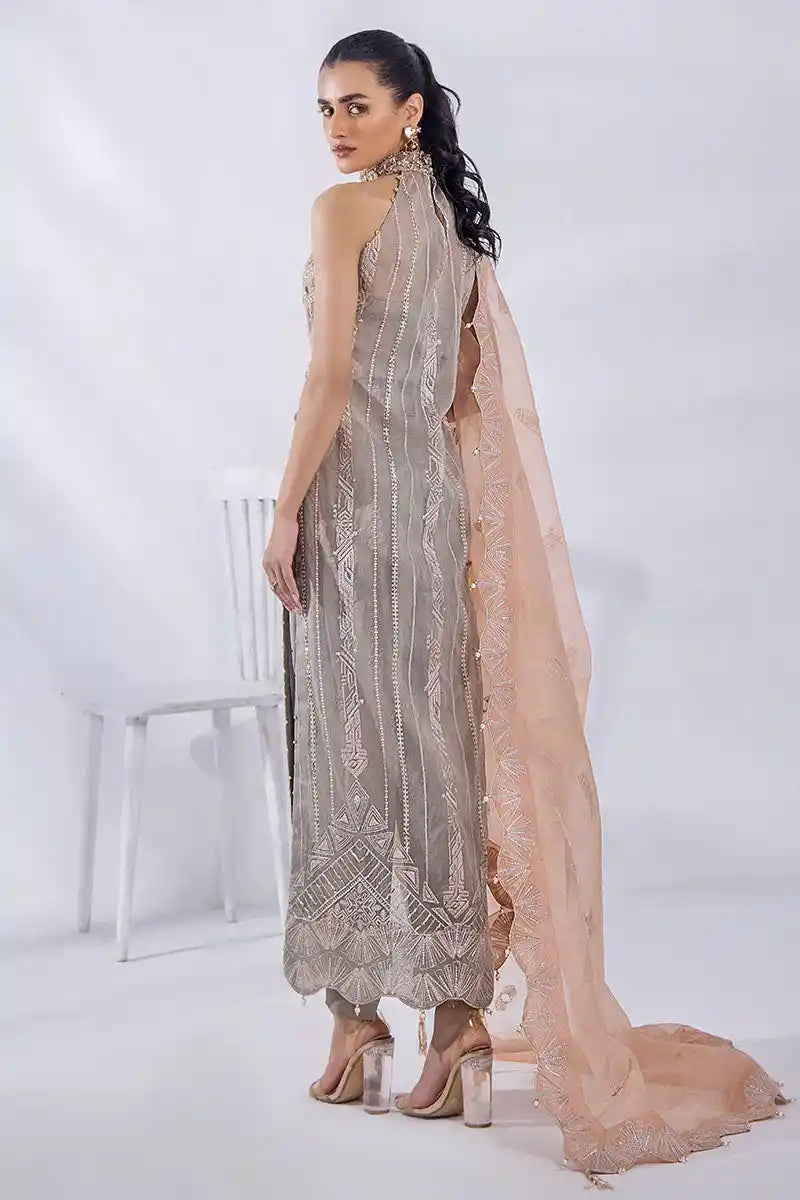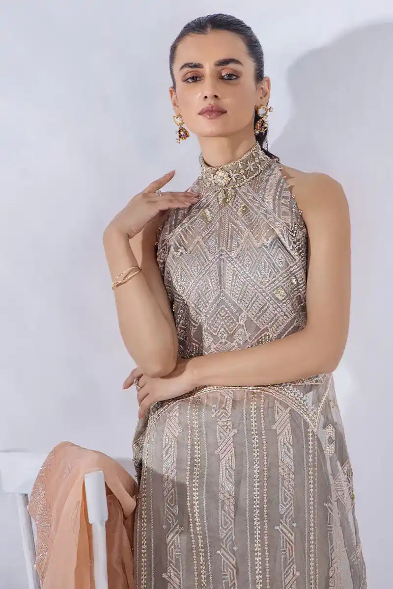 Unfolding a tale of sheer elegance and grace incorporating hues of sage green on organza. The amazing motifs of modern architecture along with the embellished neckline enhance the beauty of the dress. This illuminating ensemble is the perfect dainty and feminine look for the memorable occasions.