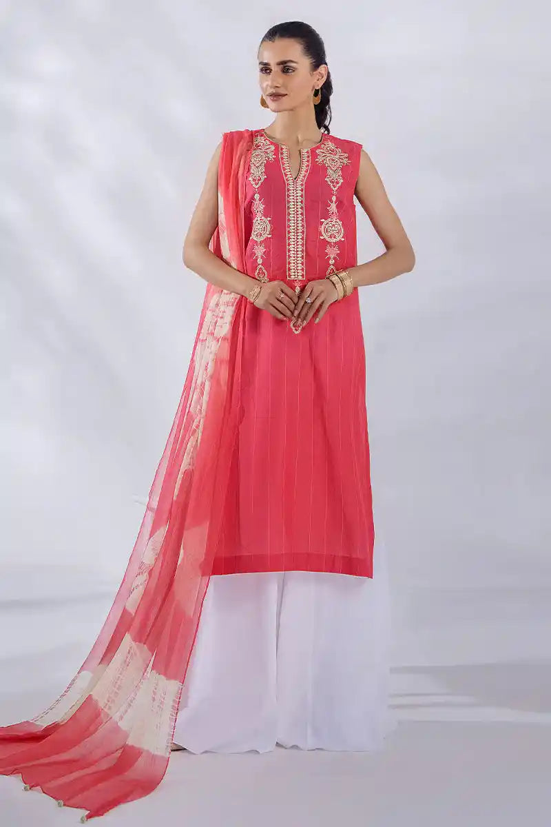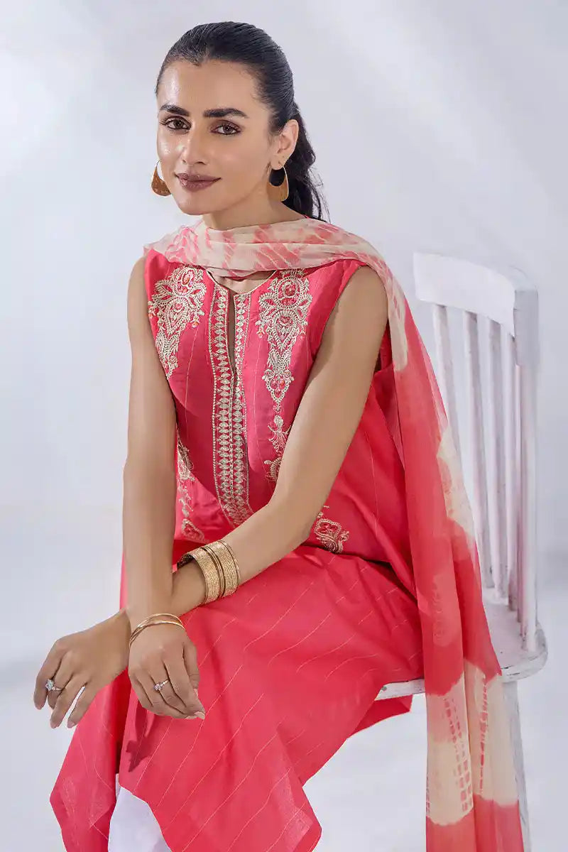 Aliana is composed over a pink base in lawn. This delicately embroidered shirt with a composed neckline and motives at the sleeves and back, gives this article a regal look. Paired with a tie and dye chiffon dupatta, this outfit is a vibrant addition to your summer wardrobe.