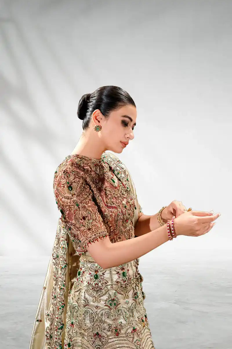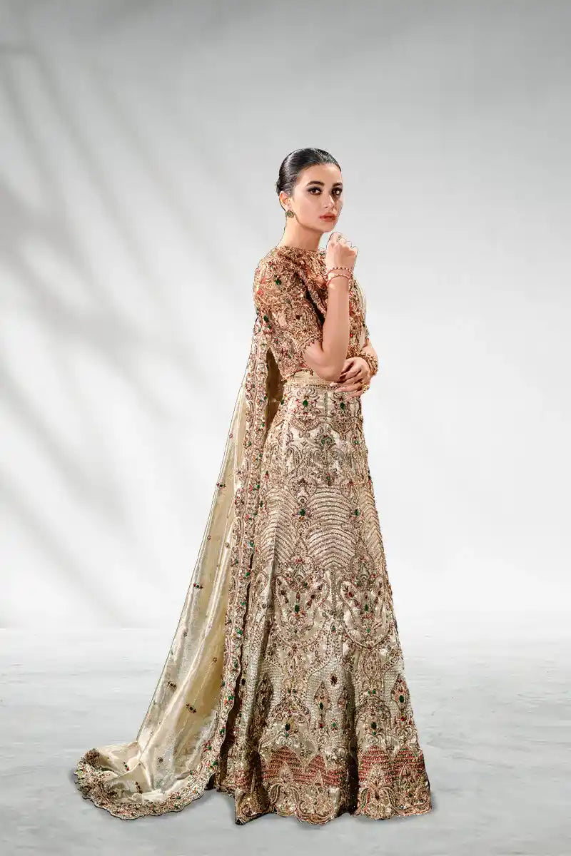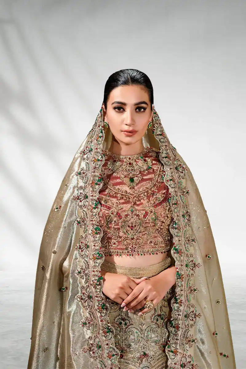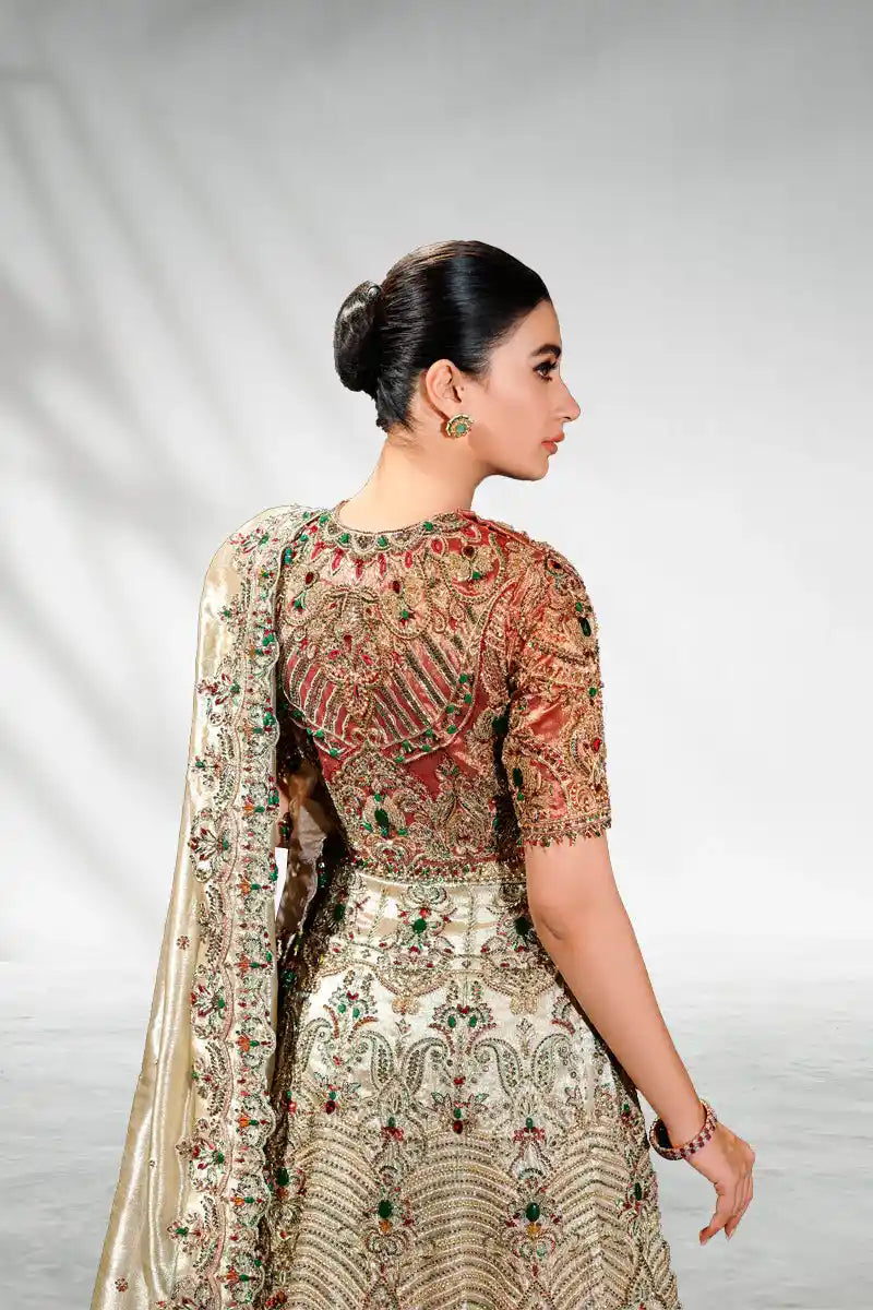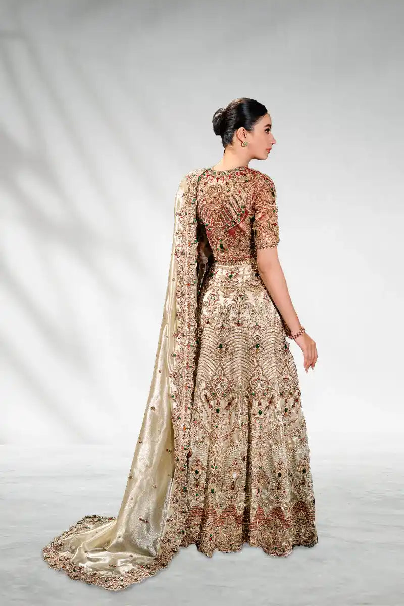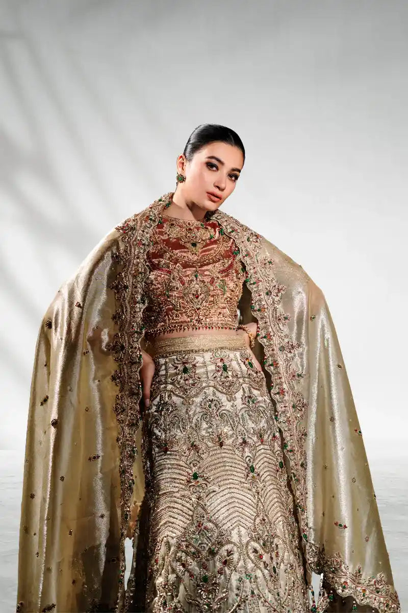 Make a blazing statement with this bridal. A never before seen look of stunning lehenga, meticulously hand crafted with crystals, stones, dabka, sequins, resham threads and dabka. This dream worthy lehenga choli paired with tissue dupatta which is exquisitely embellished with heavy border and marvelous spray and tasseling, makes this an absolute must have. One of the most beautiful outfits from our collection, Ameera is sure shot winners for years to come.