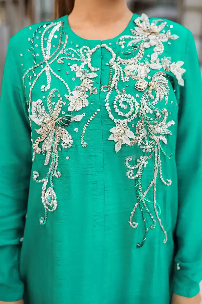 An elegantly flowing silhouette hand worked with 3D flowers, crystals and pearls. The emerald green color with intricate embroidery make this ensemble outstanding. This full length long modern cut shirt is paired with cigarette pants. This illuminating ensemble is the perfect dainty and feminine look for memorable occasions.