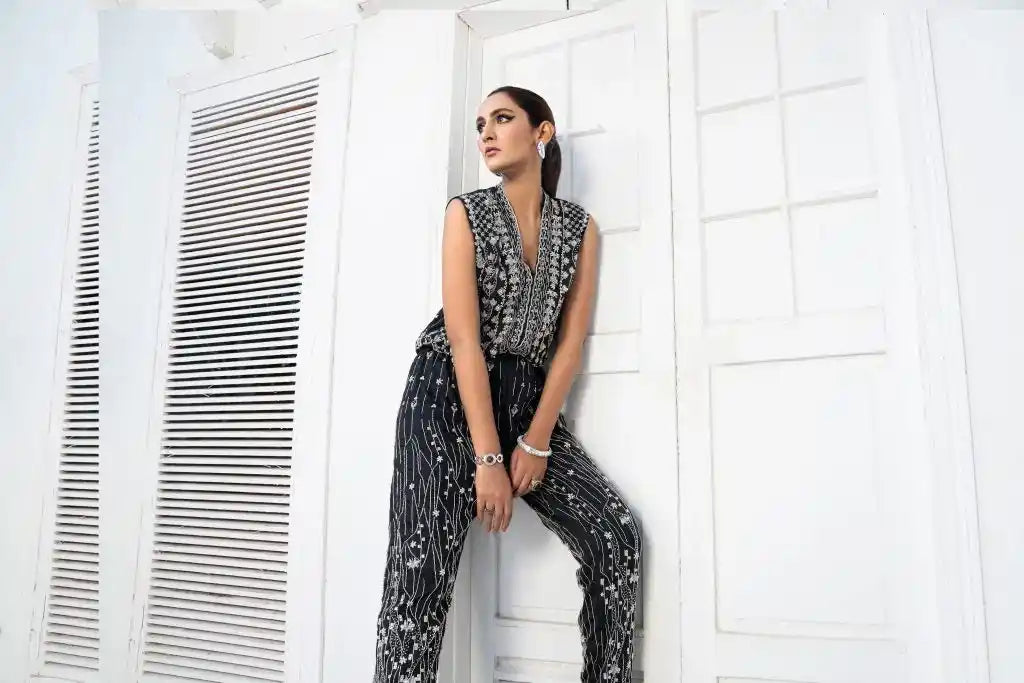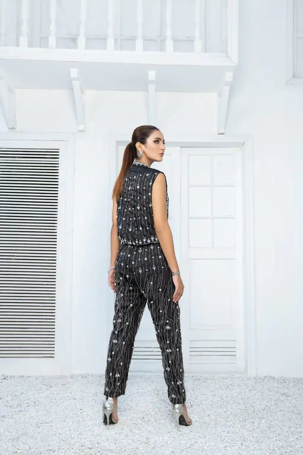 This exquisite jumpsuit is intricately ornamented with pearls, sequins, diamantes', cut daana, dabka and kora as well as tilla work. Your perfect outfit for wedding or a special occasion.