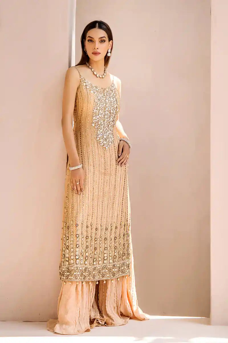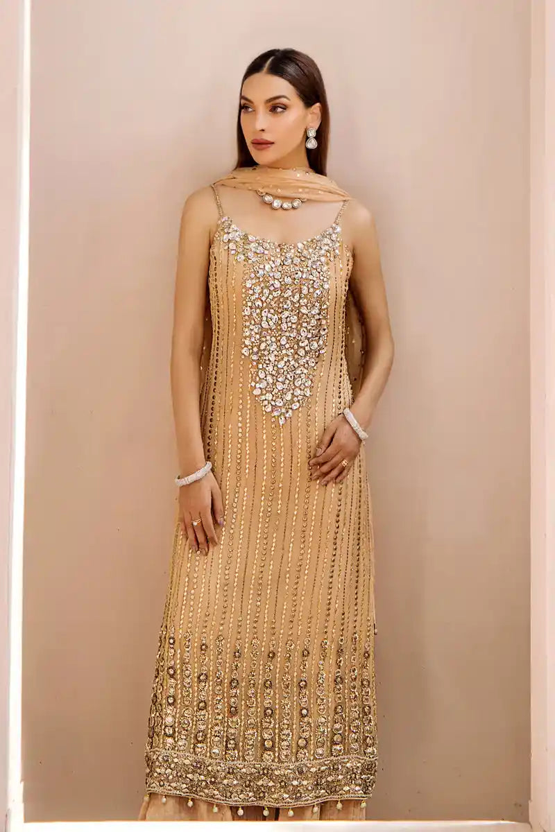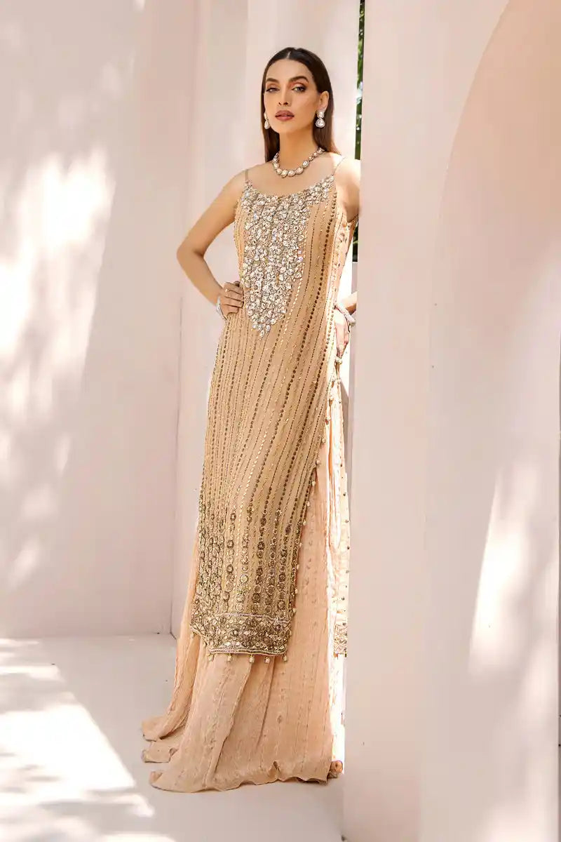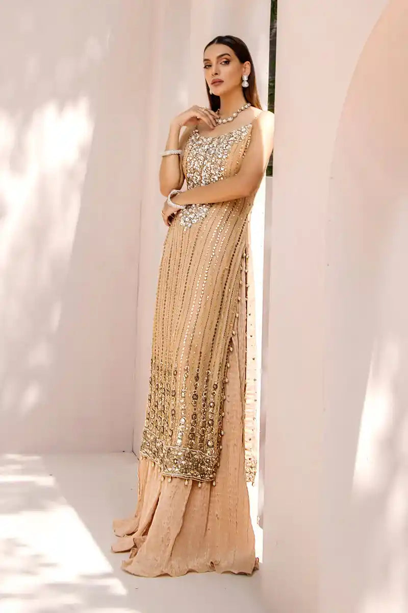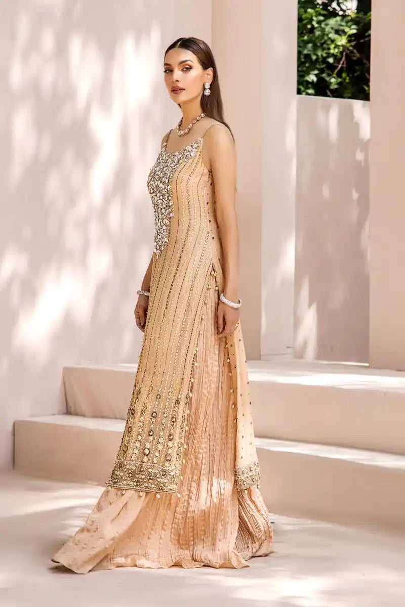 Chandni is a testament to the timeless allure of heirloom pieces. Handcrafted by top-tier artisans, this graceful chiffon shirt and its silk trouser come sublimely ornamented with stones, gotta work, mukesh and zardozi work. The captivating fawn hue and chiffon dupatta further add to the fairytale charm of the enchanting ensemble.