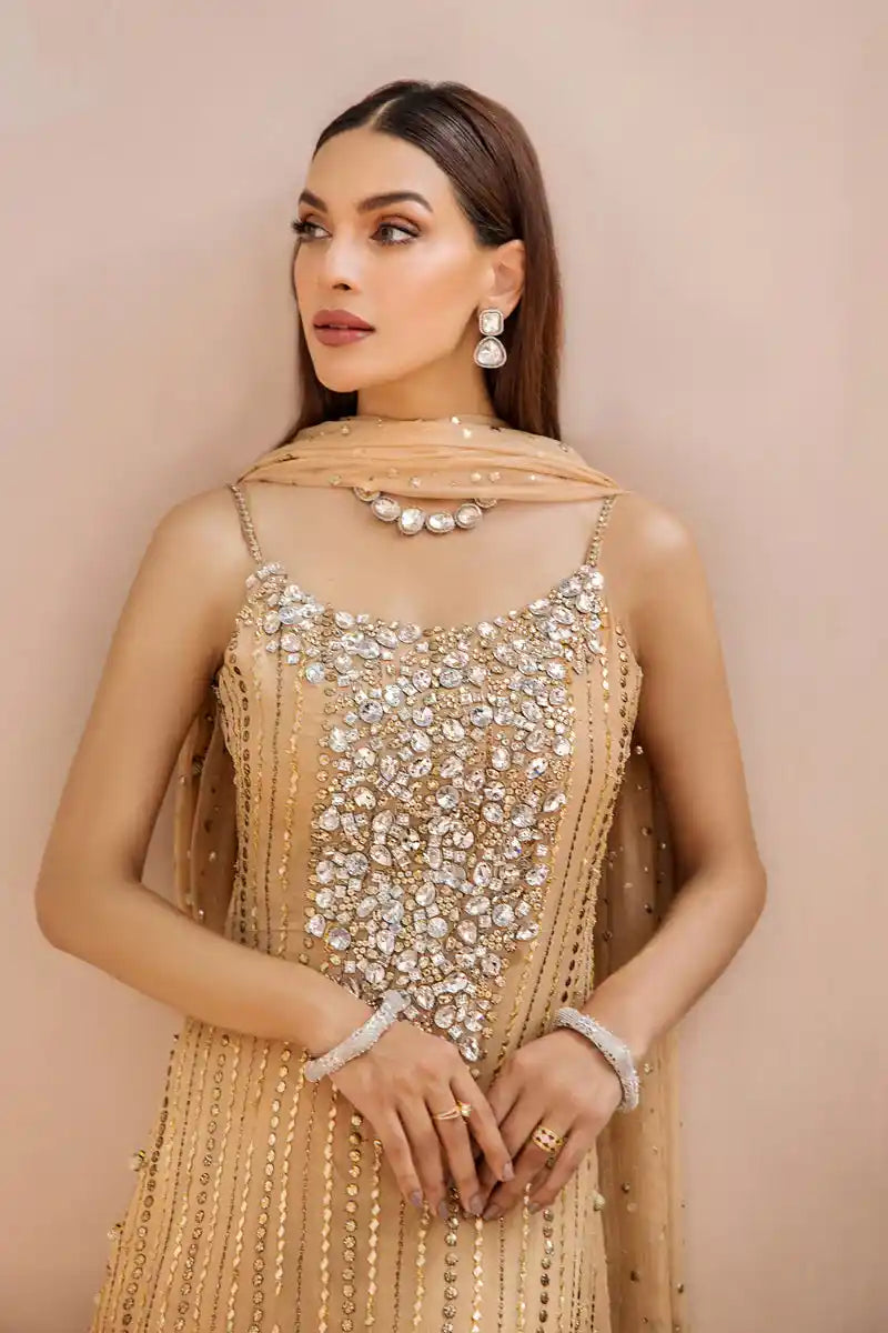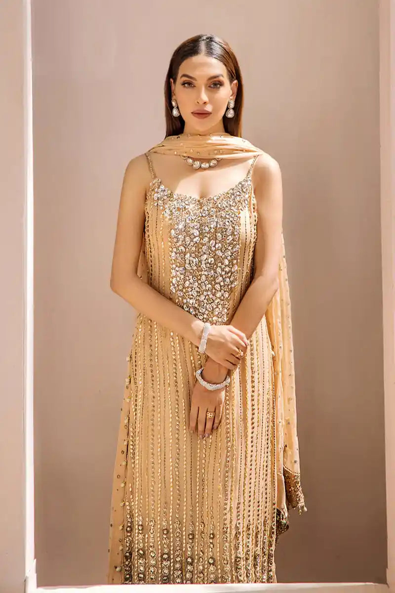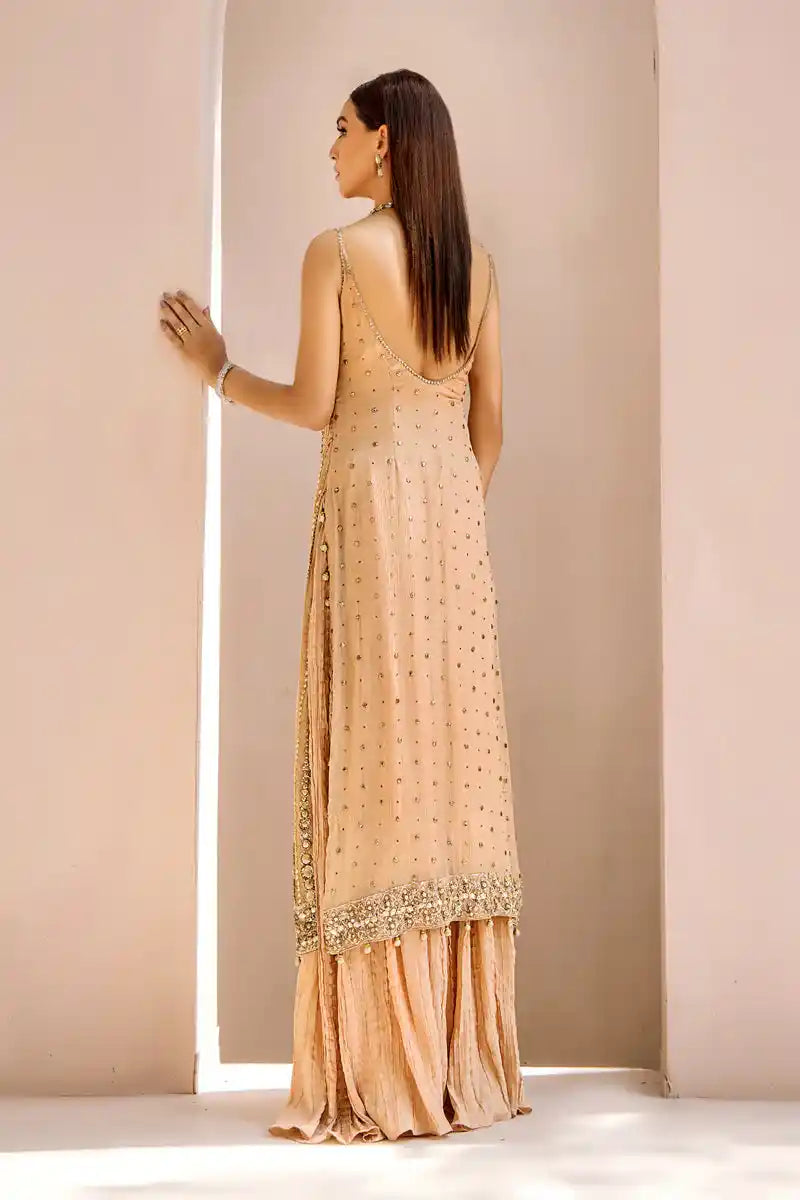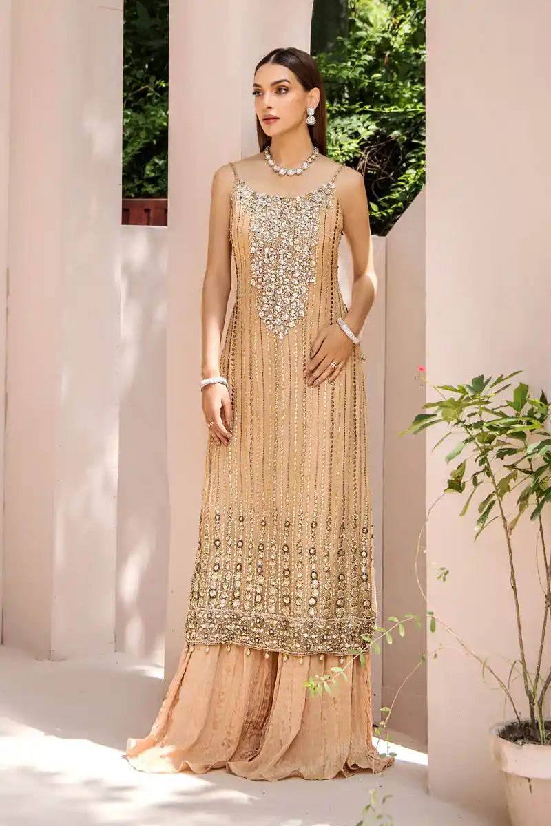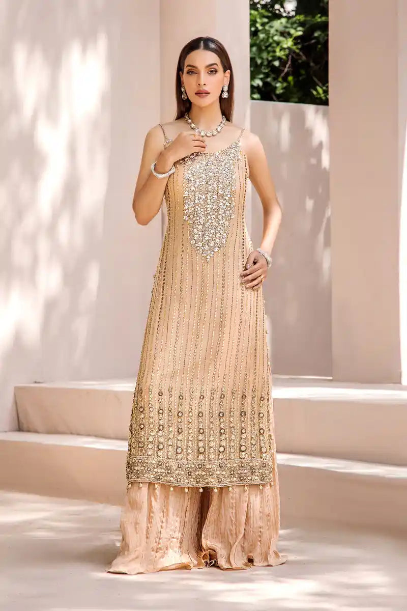 Chandni is a testament to the timeless allure of heirloom pieces. Handcrafted by top-tier artisans, this graceful chiffon shirt and its silk trouser come sublimely ornamented with stones, gotta work, mukesh and zardozi work. The captivating fawn hue and chiffon dupatta further add to the fairytale charm of the enchanting ensemble.