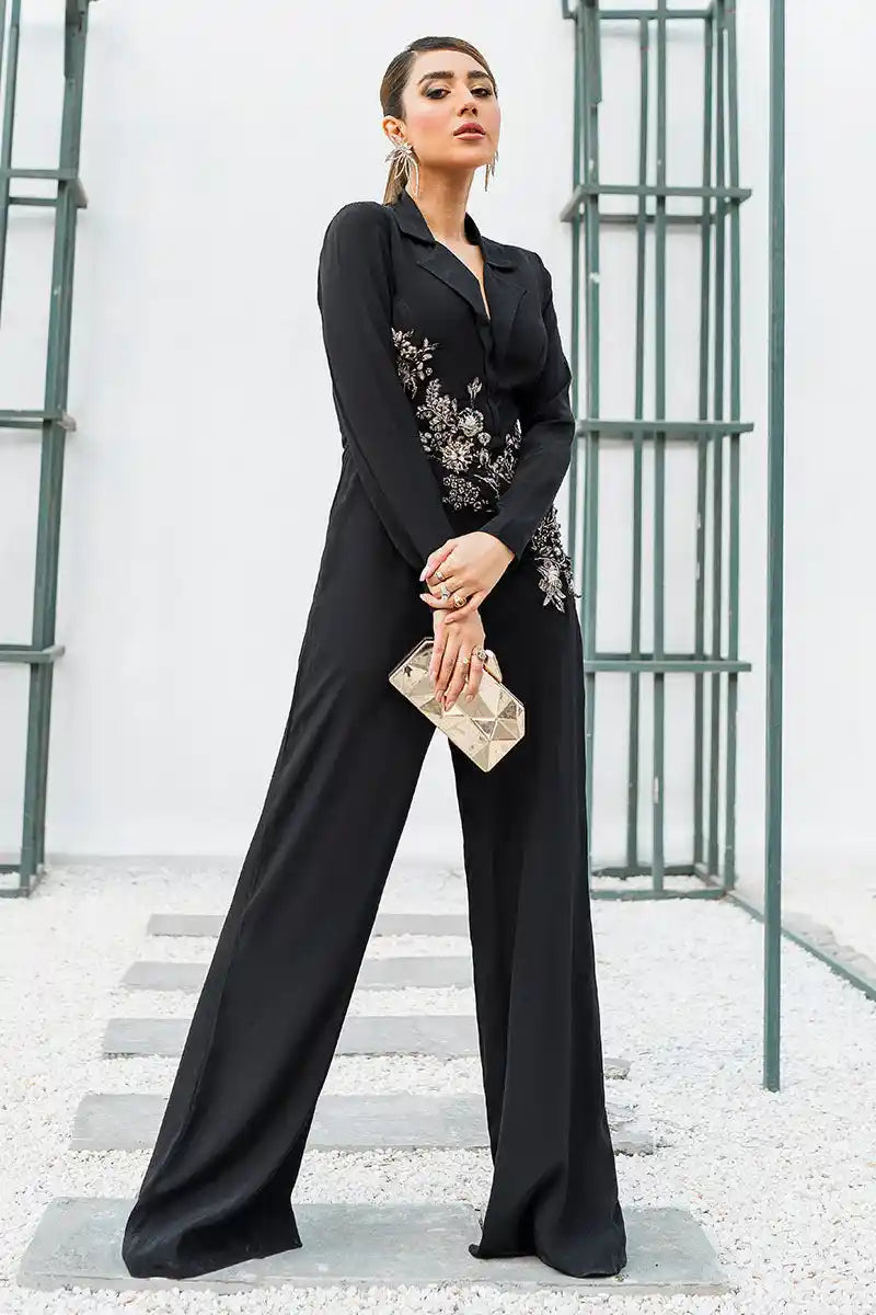 Exude elegance at festivities for the season in this fantastic jumpsuit. A flattering silhouette cut from black silk is finished with dull gold and black amazing motive at waistline. The boot cut style adds to the modern and chic look. It is such a statement piece that is bound to turn heads at any event.