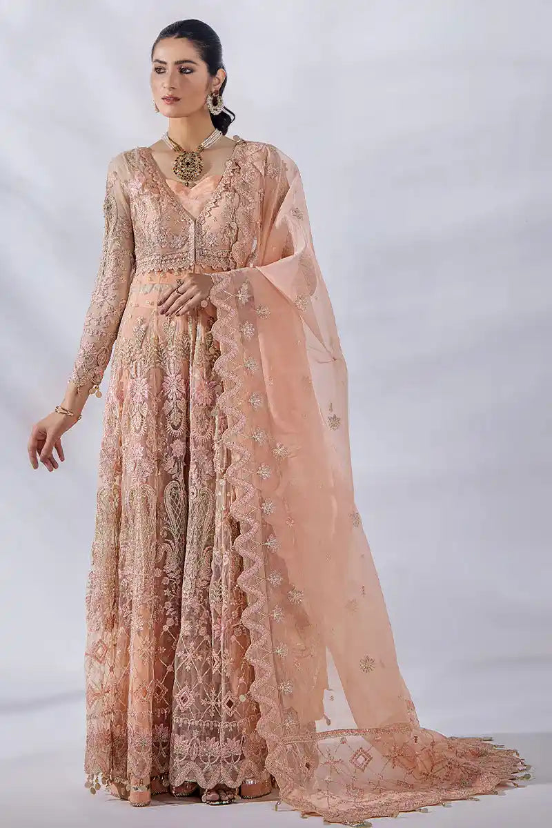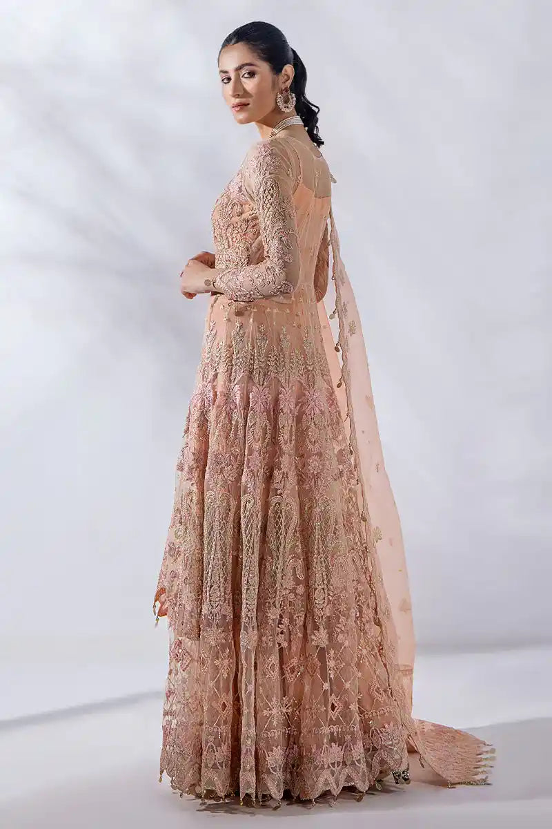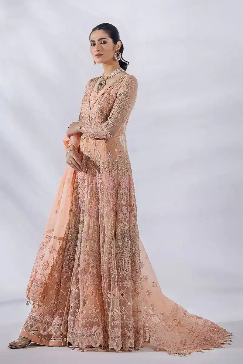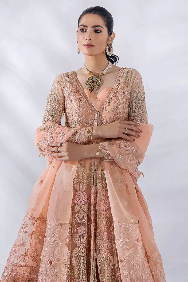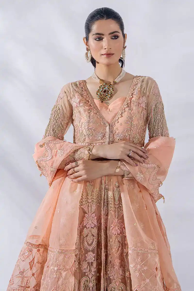 A summer state of affair on a peach canvas. Featuring on embroidered ensemble, translated through the use of modern motifs imaginary. This flared peshwas with intricate embroidery elevate the look. Finishing of the look with embroidered dupatta and silk pants, resonating in hues of peach.