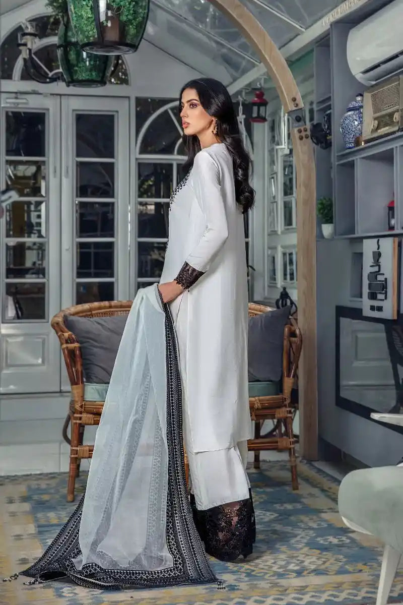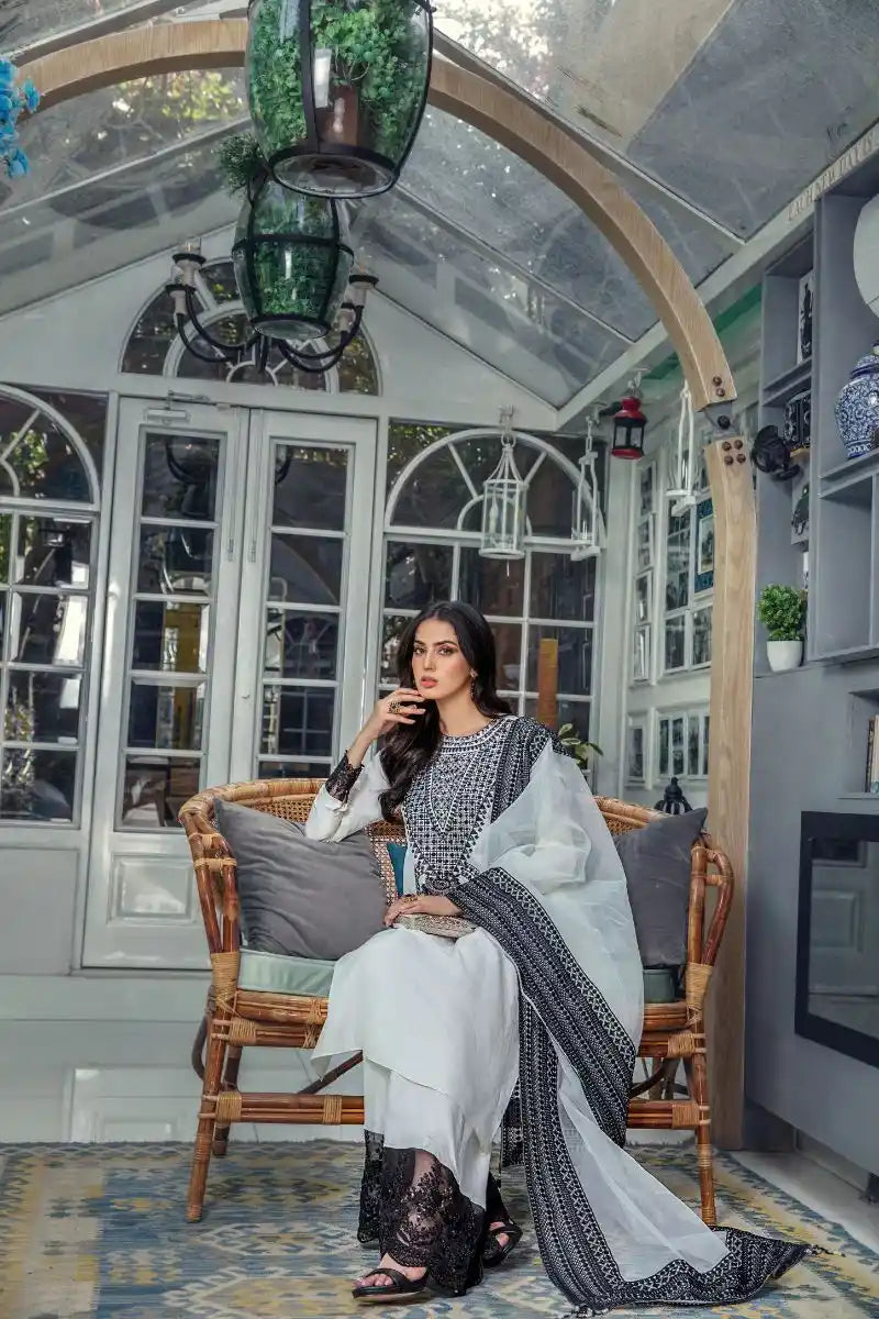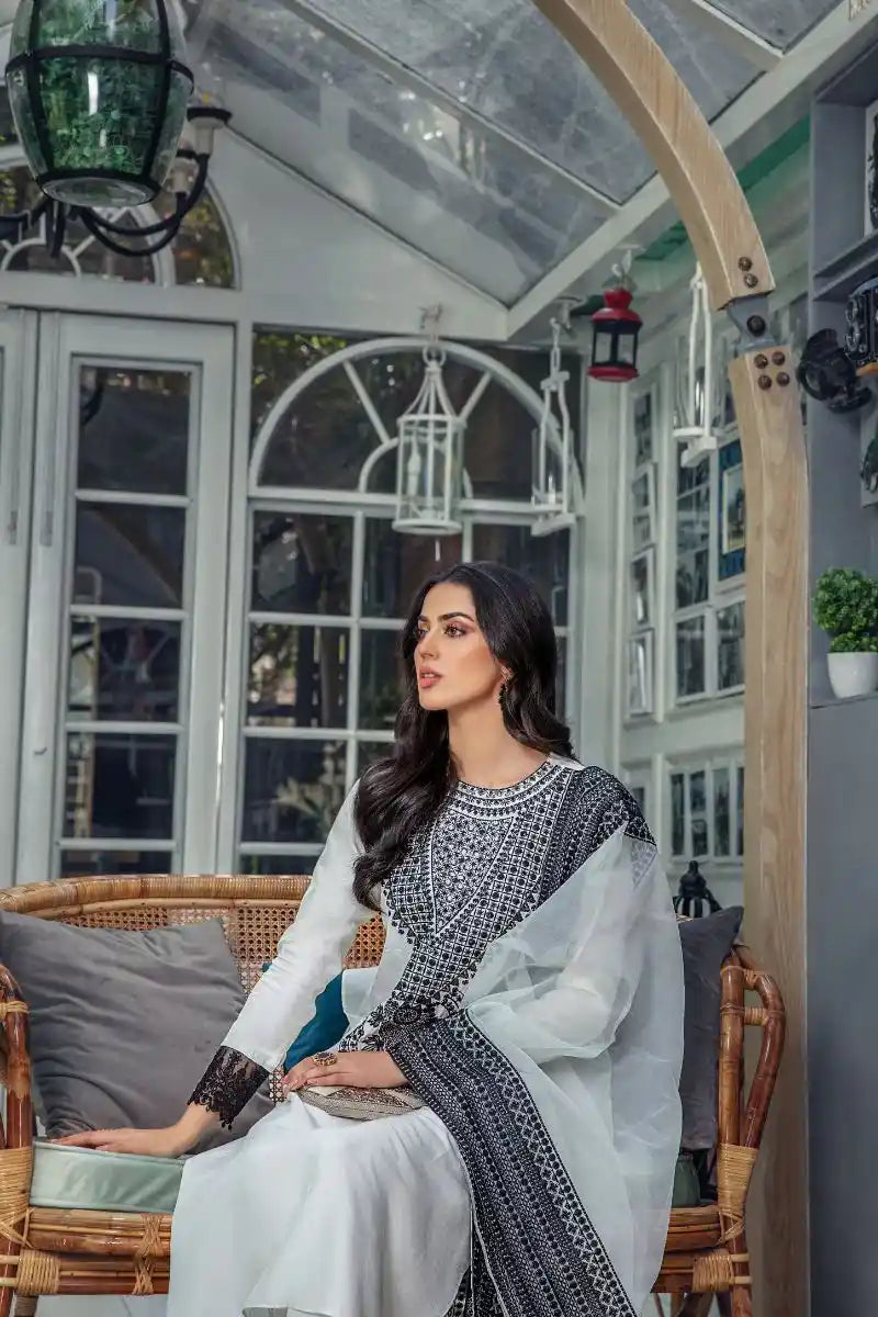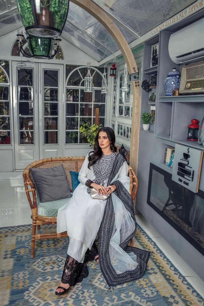 An exquisitely long shirt ‘Deena’ is the epitome of classic elegance. On a unique hue of black and white ornamentation is laid out in perfect symmetry. This richly embroidered design is paired with exquisitely elaborate dupatta with geometrical pattern borders, and flared trouser with black embroidered patch at bottom. This chic design is perfect for your especial events.