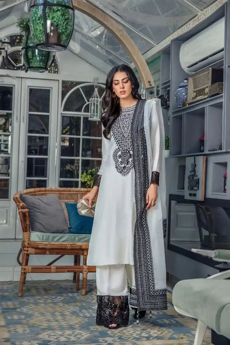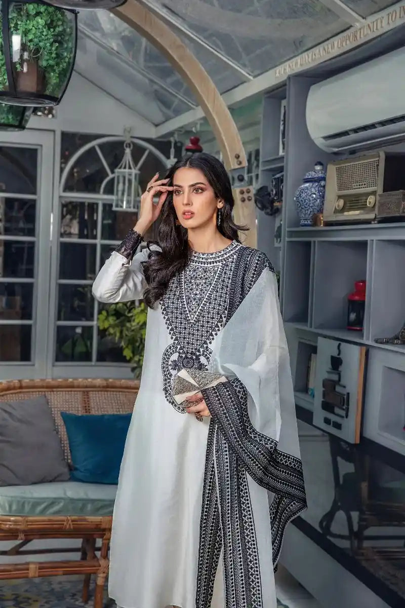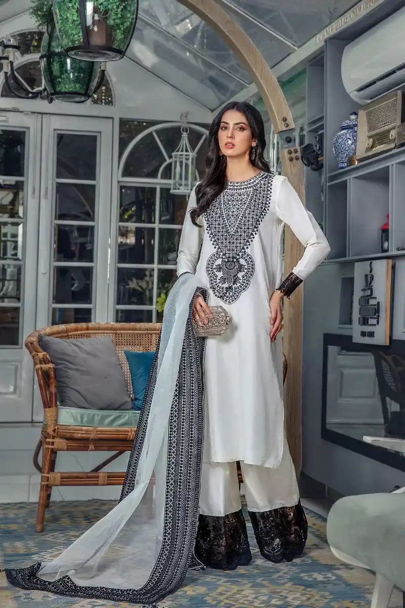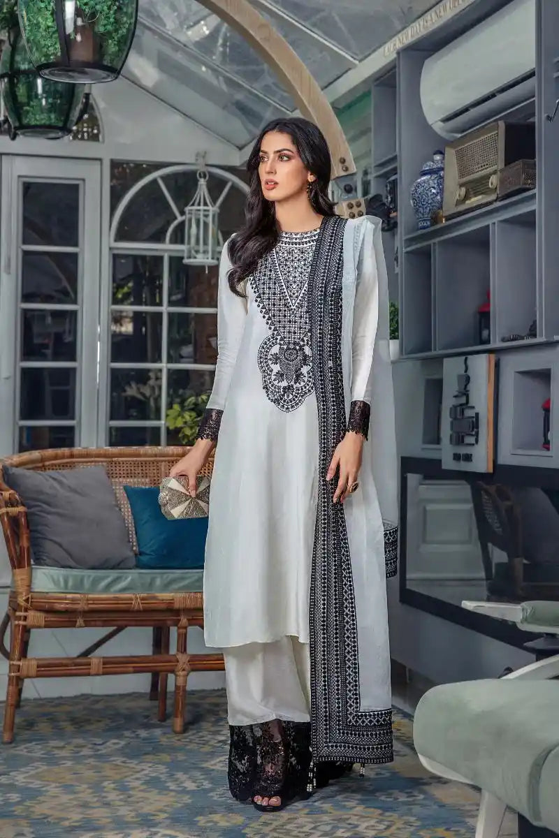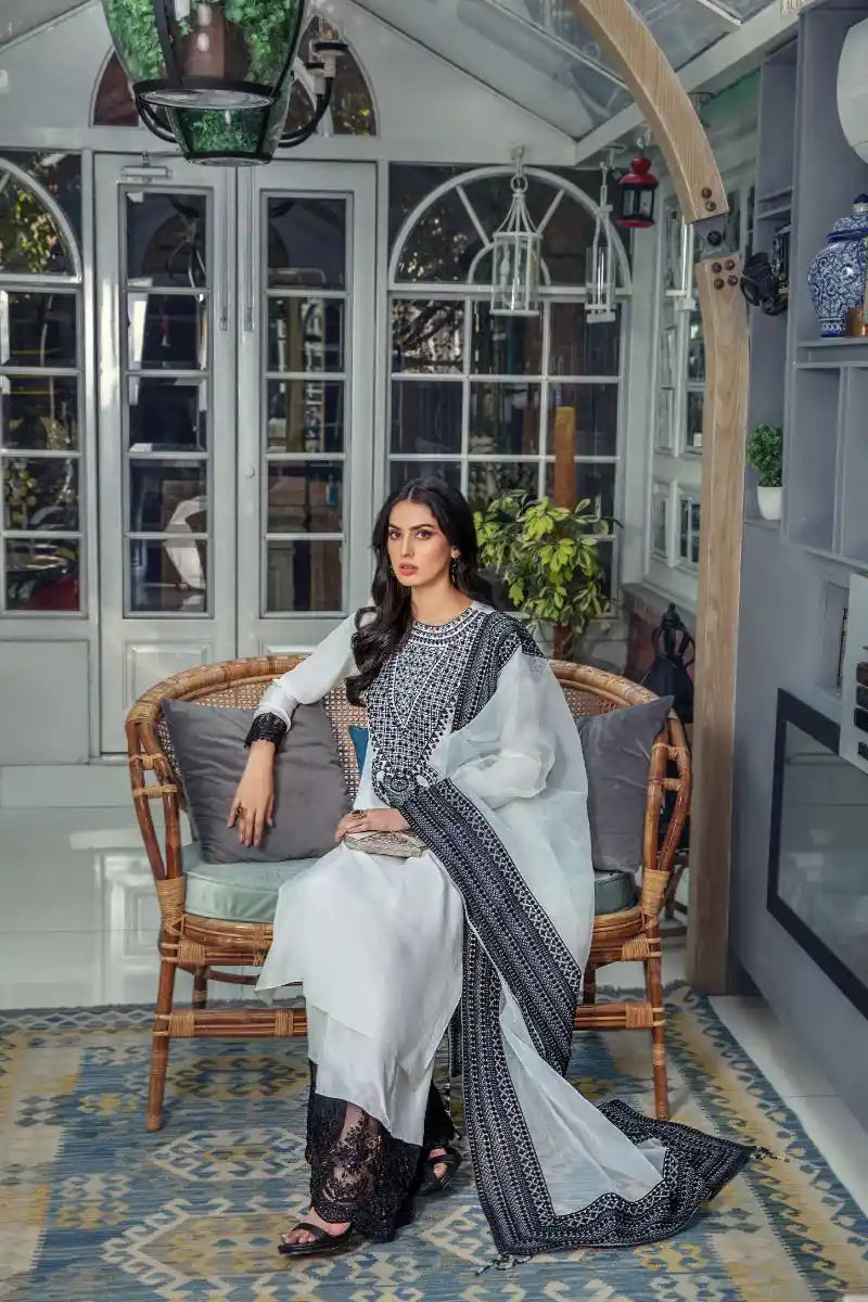 An exquisitely long shirt ‘Deena’ is the epitome of classic elegance. On a unique hue of black and white ornamentation is laid out in perfect symmetry. This richly embroidered design is paired with exquisitely elaborate dupatta with geometrical pattern borders, and flared trouser with black embroidered patch at bottom. This chic design is perfect for your especial events.