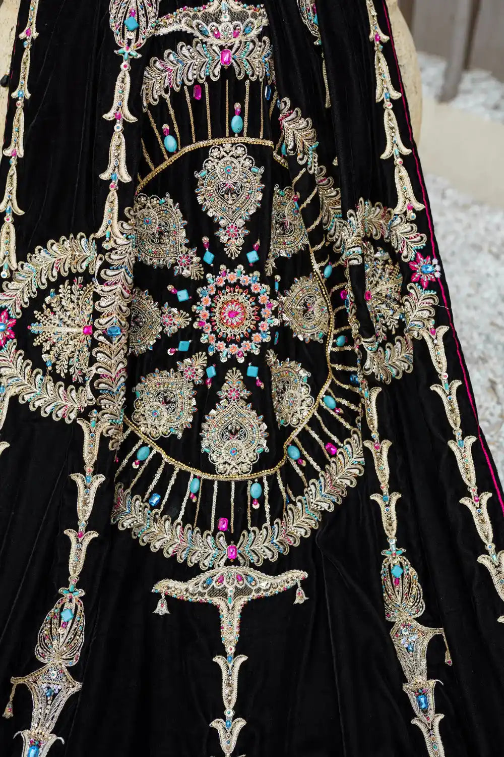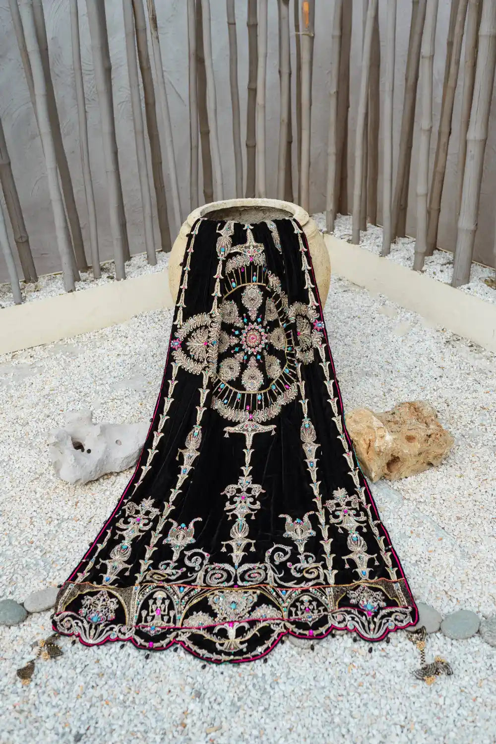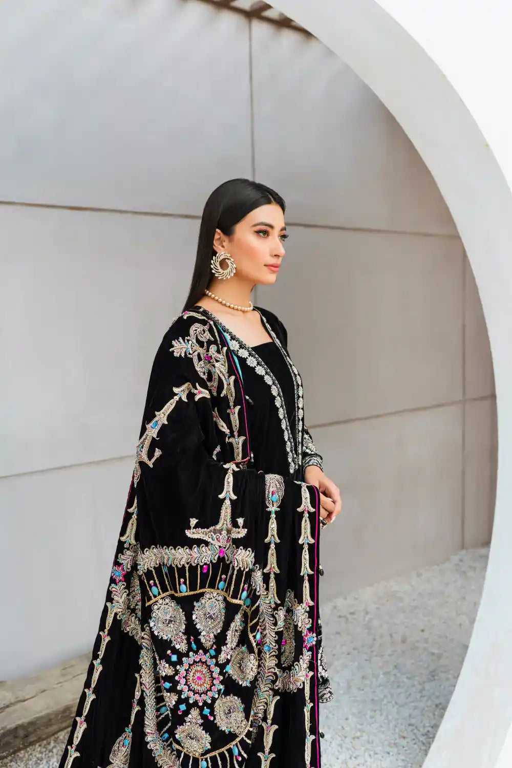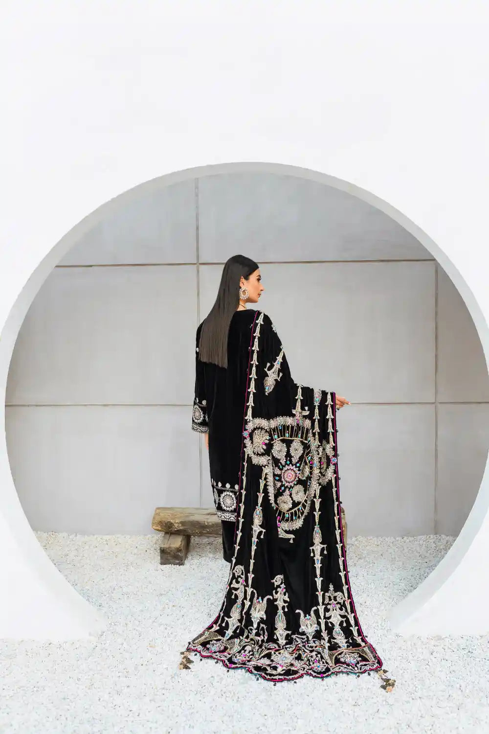 Doused in graceful and elegant design shawl - ‘Desire’ is the epitome of classic elegance. This black velvet shawl with outstanding hues, embroidery and adda work, makes it a master piece. Richly embellished with crystals, sequins, chain, and feroza stones. The zardozi work adds to the opulent statement. The elegant design and motive of embroidery with scalloped borders with four sided tassels and details gives it grand look, that is bound to stand out in winters.