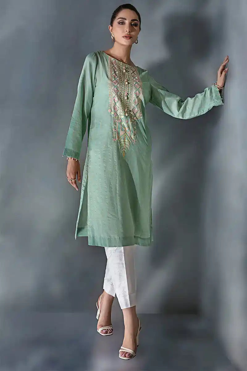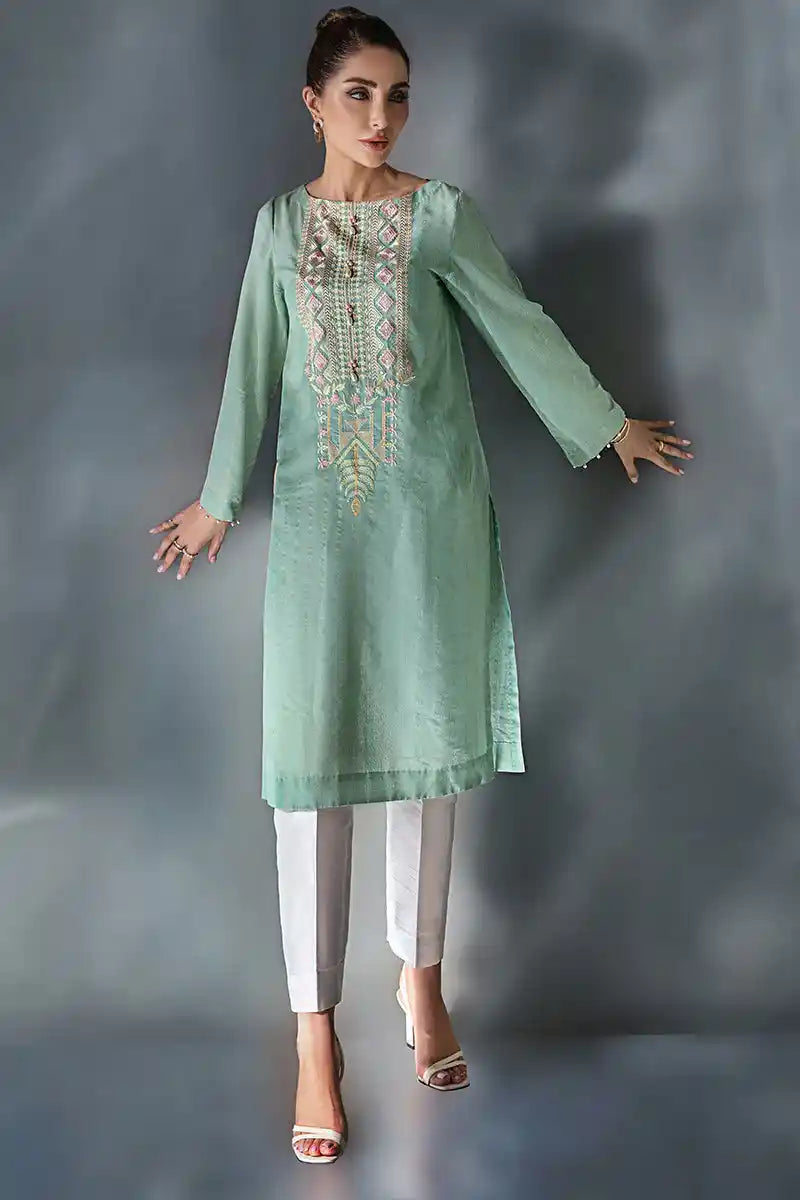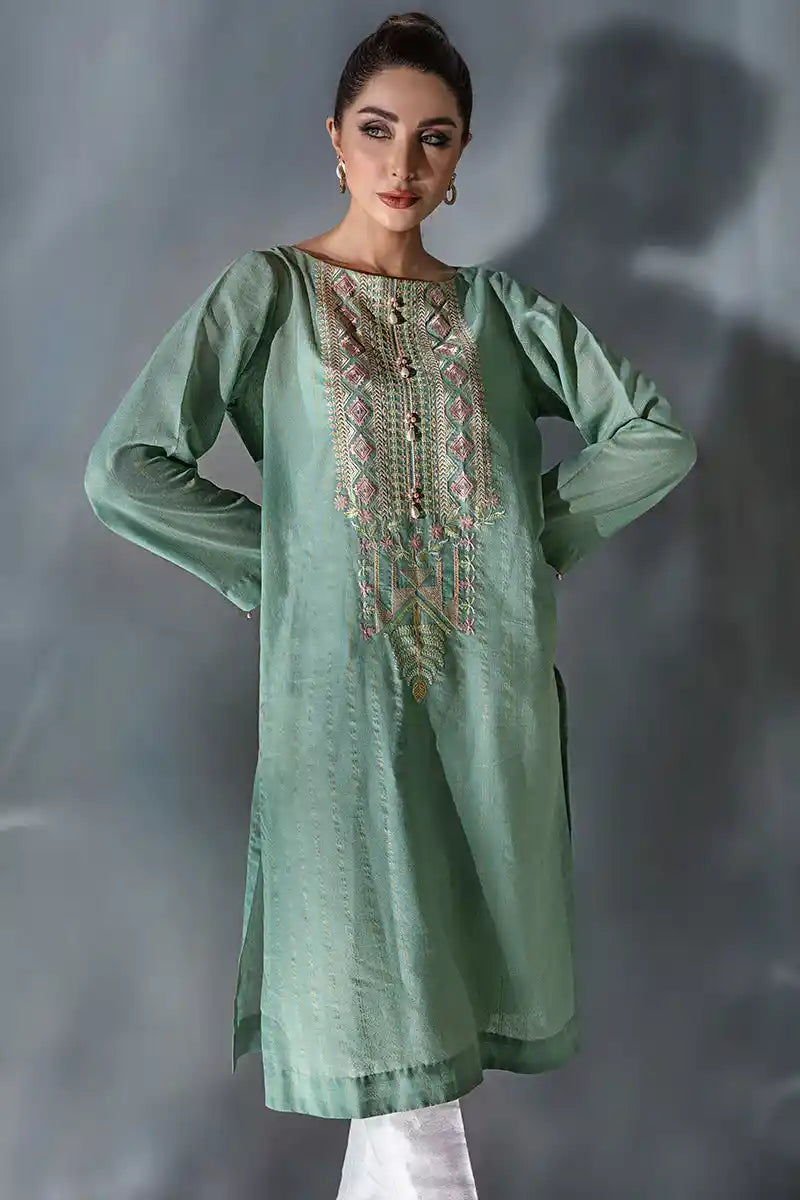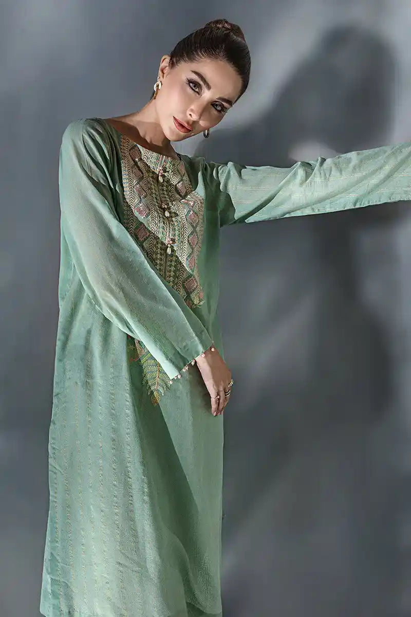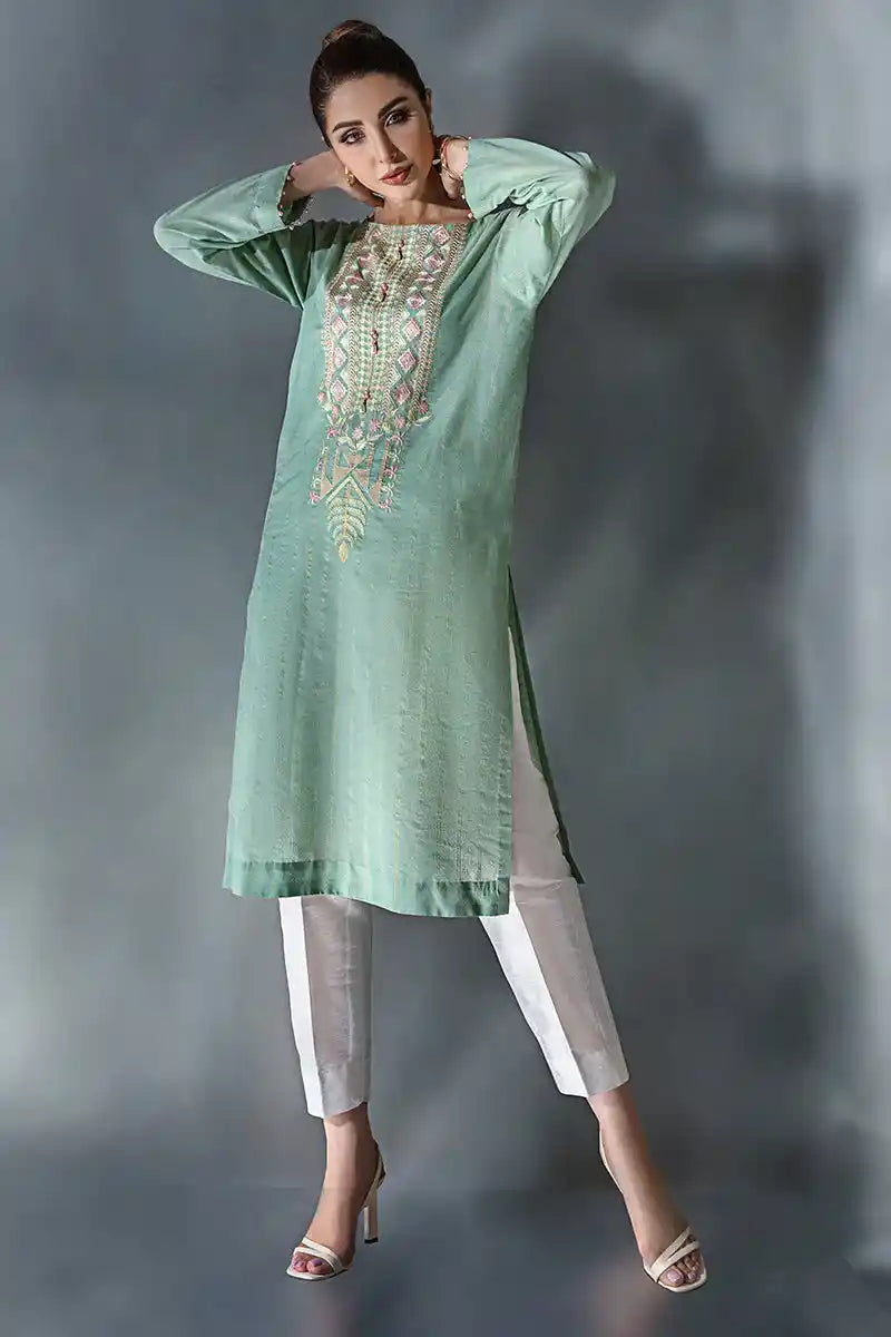 Adorn this chic yet classy kurta in karandi lawn fabric imbued in green hue with embroidered neckline and sleeves. This article features a classic silhouette in beautiful embroidery, richly inspired by geometrical theme.