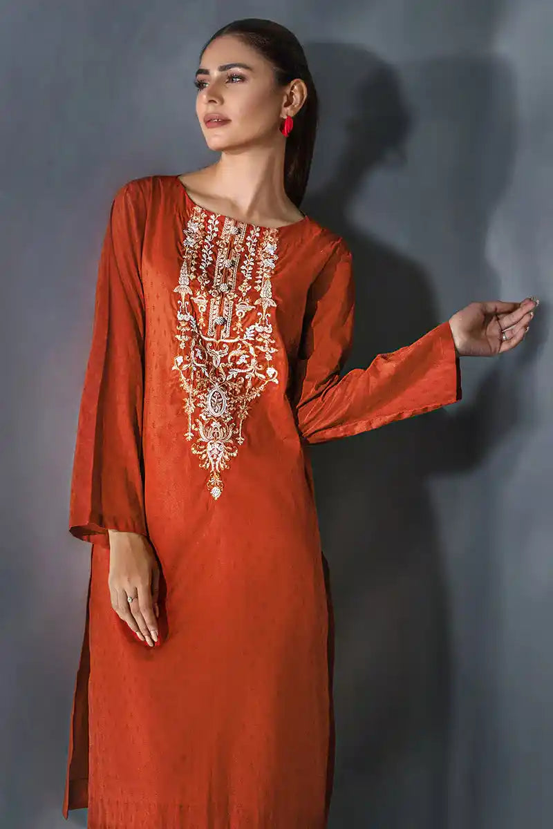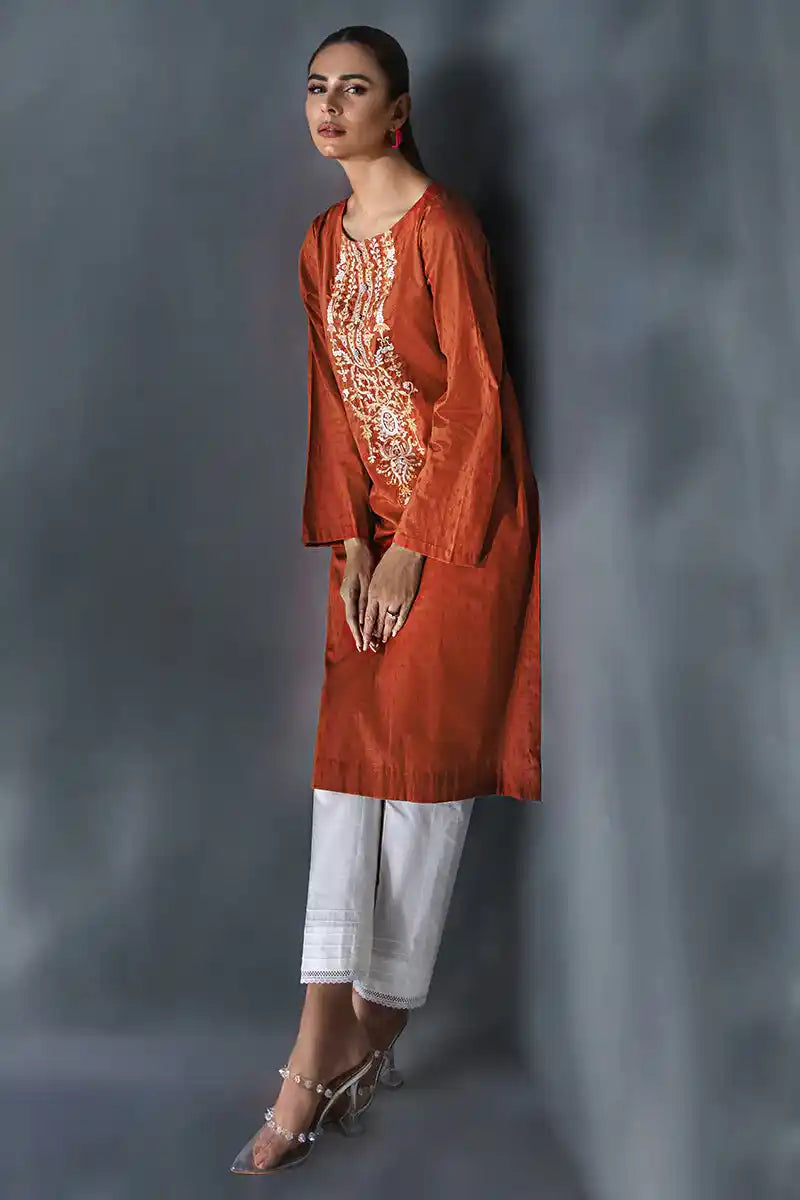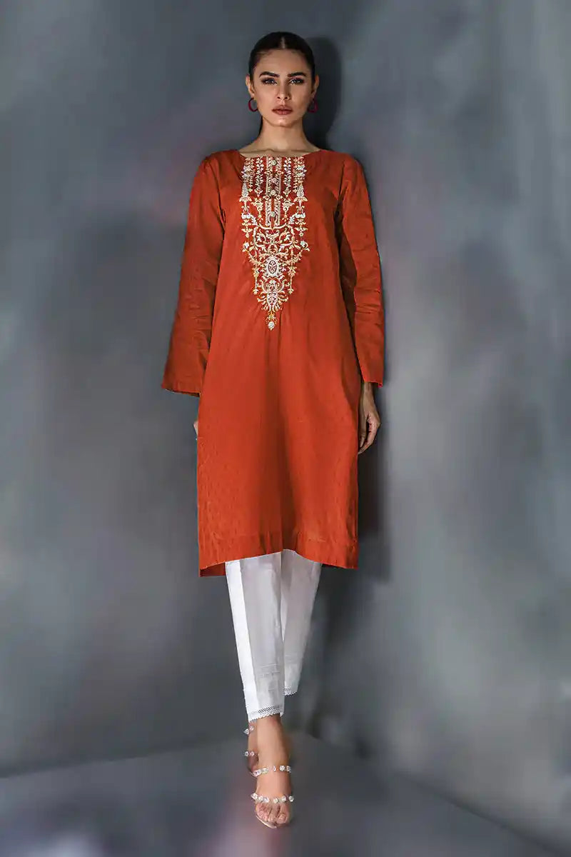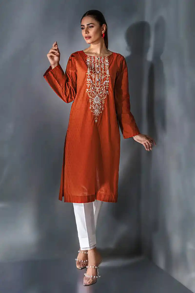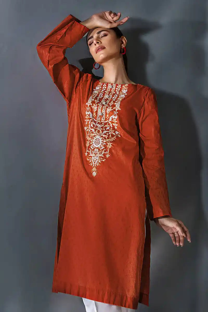 Dress up in the vivid tone of this self-jacquard lawn kurta with delicately embroidered neckline and motif on the back. This kurta is a perfect pick for all summer soiree.