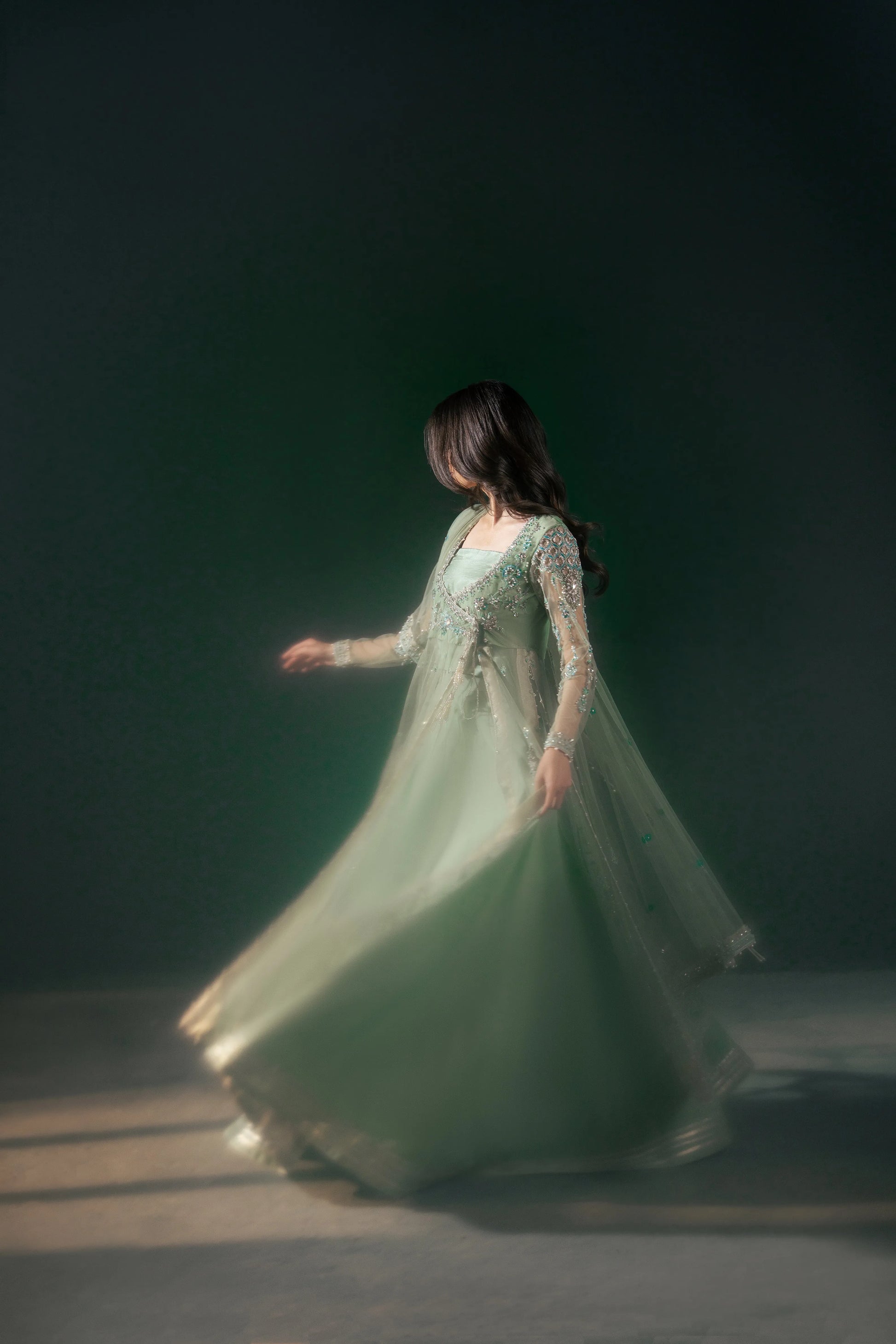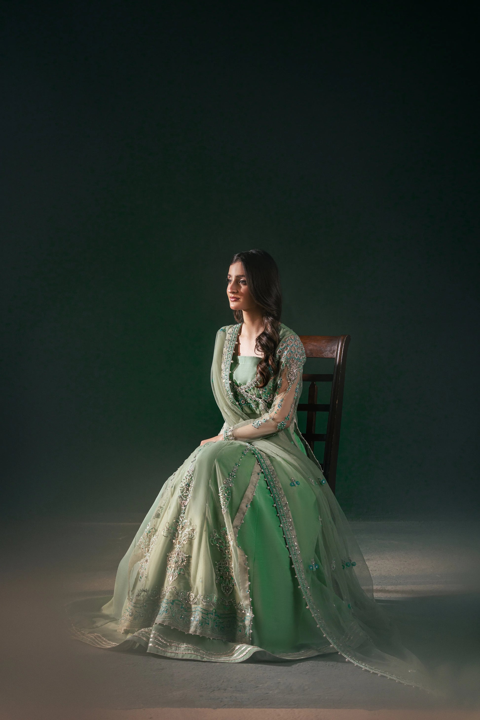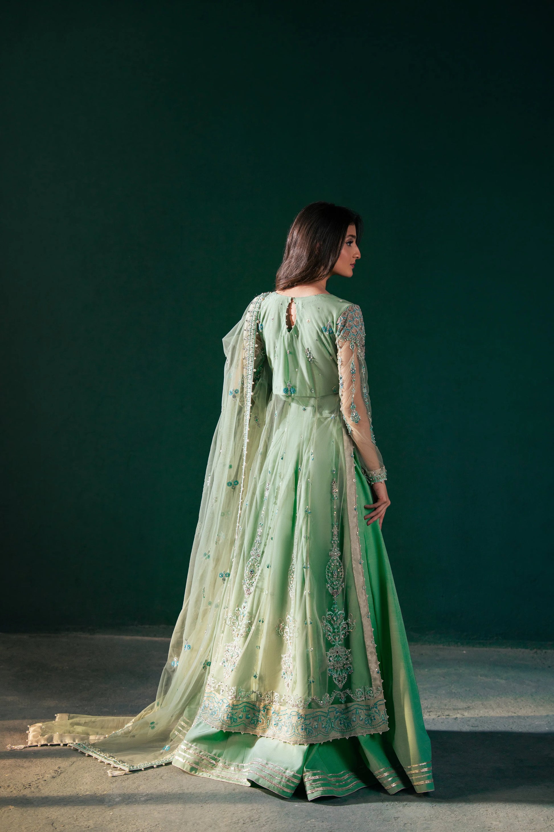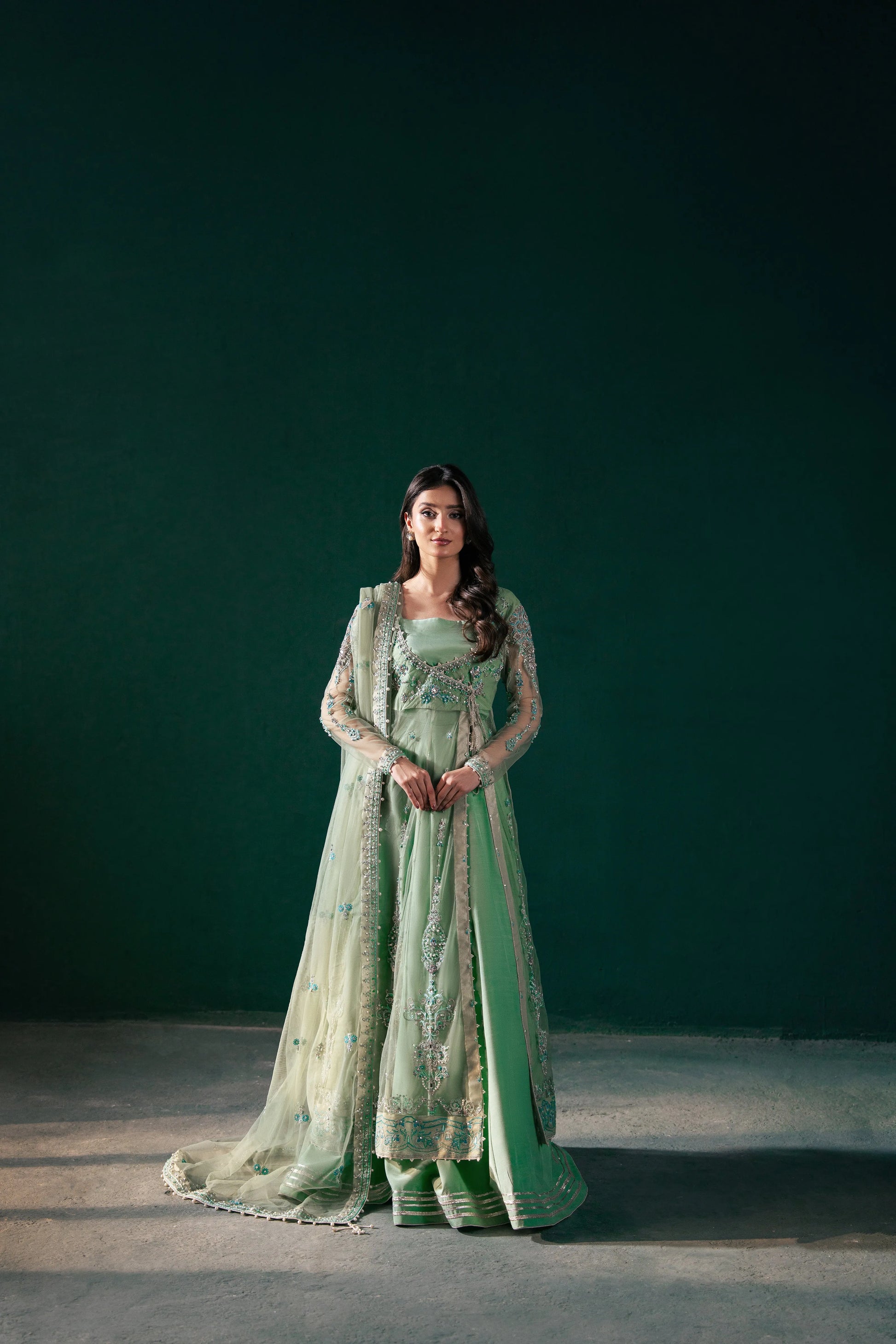 This mint green angrakha-style shirt blends modern flair with traditional charm, featuring intricate embellishments on soft net fabric. It’s paired with a plain raw silk lehenga with a minimal border for an elegant finish, complemented by a lightly embellished mint green net dupatta.
