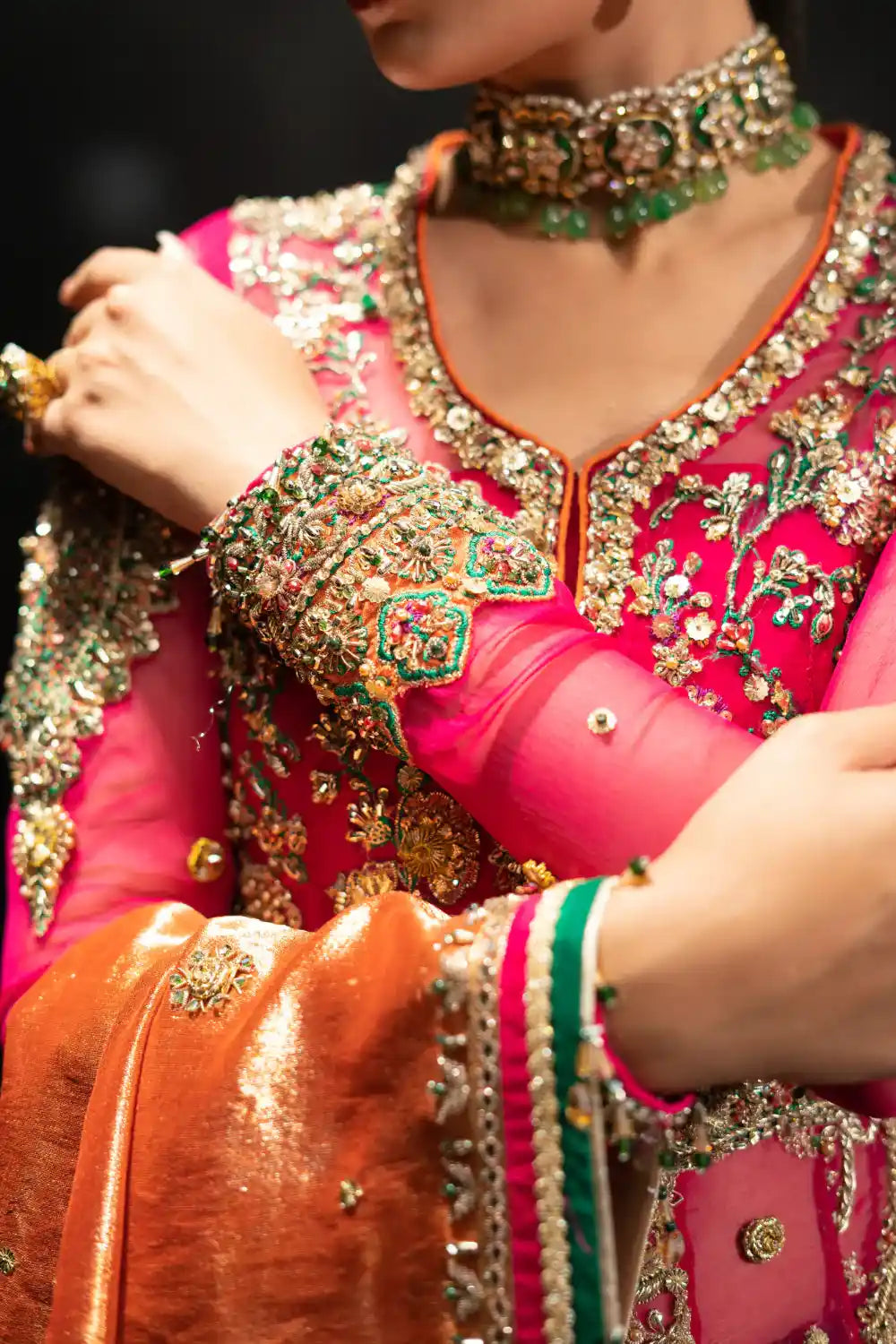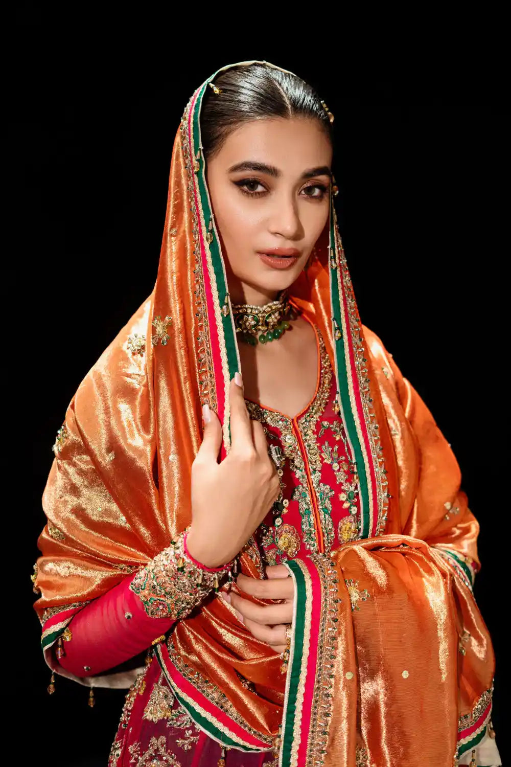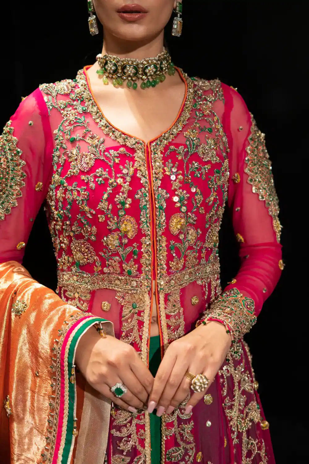 A true masterpiece - Gulmohar is intended to give a thin and smart waistline an extra erupting kalis for that unforgettable twist and dazzling silhouette. The wonderfully flared cut kalidaar shirt is intricately hand-worked with crystals, dabka, stones, sequins, pearls and gota. Teamed up with a mesmerizing green lehenga and classy rust dupatta. Lehenga border is beautifully embellished with gota work, crystals, pearls, bethki , laces and droplets. The dupatta is delicately embellished with modern and classy border and spray. This dainty and feminine ensemble completes the look with tassels and adorable hangings.