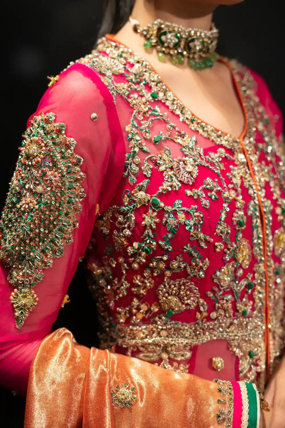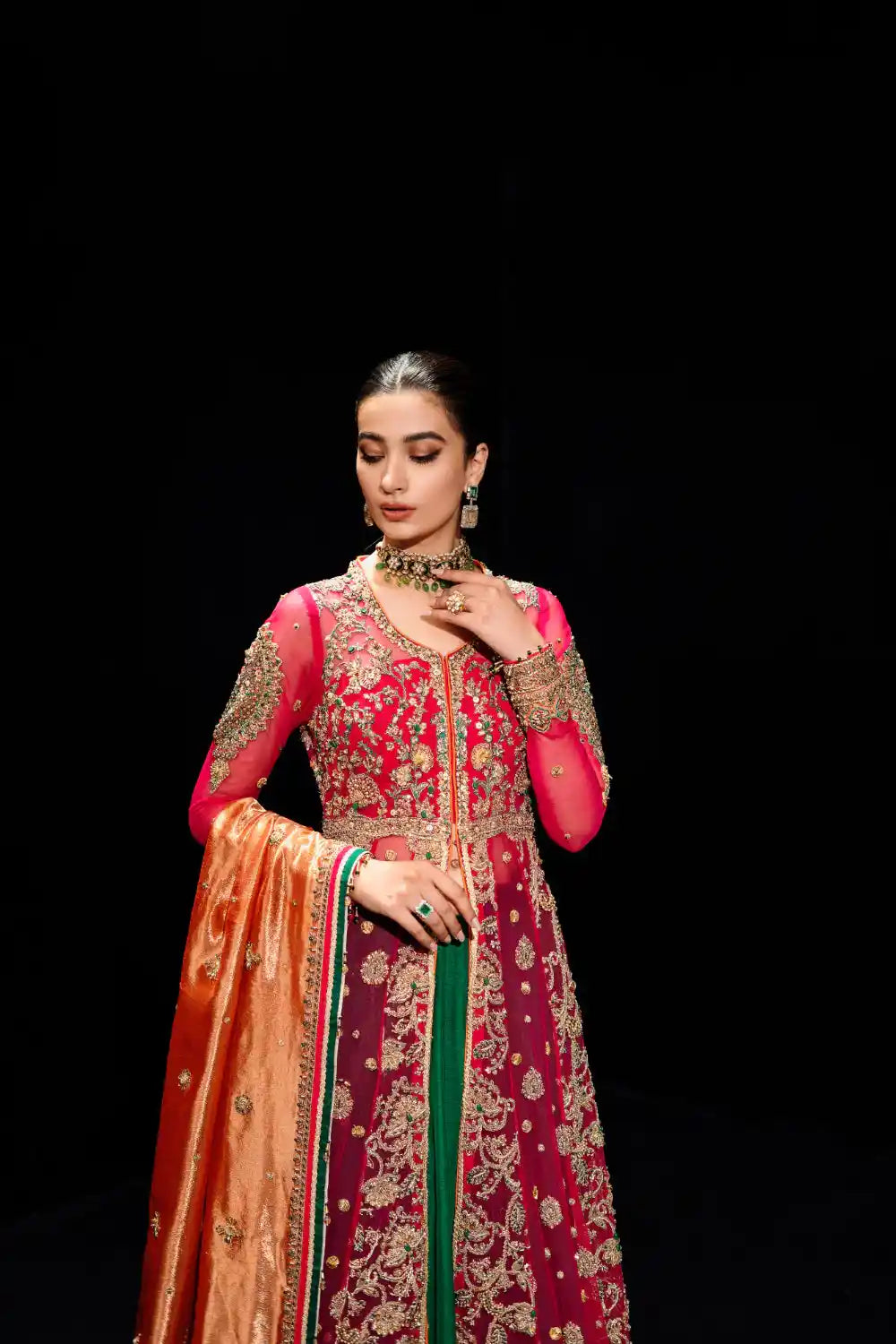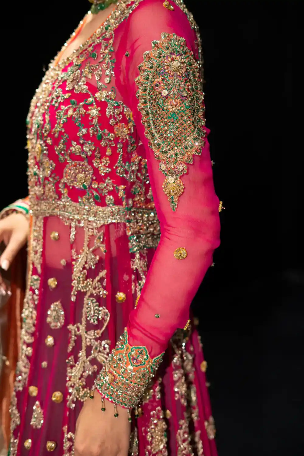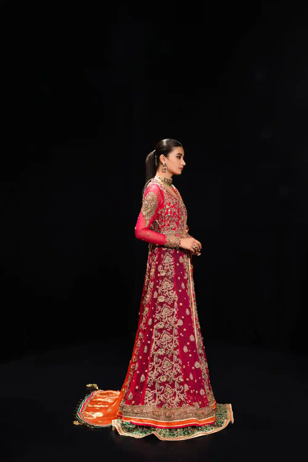 A true masterpiece - Gulmohar is intended to give a thin and smart waistline an extra erupting kalis for that unforgettable twist and dazzling silhouette. The wonderfully flared cut kalidaar shirt is intricately hand-worked with crystals, dabka, stones, sequins, pearls and gota. Teamed up with a mesmerizing green lehenga and classy rust dupatta. Lehenga border is beautifully embellished with gota work, crystals, pearls, bethki , laces and droplets. The dupatta is delicately embellished with modern and classy border and spray. This dainty and feminine ensemble completes the look with tassels and adorable hangings.
